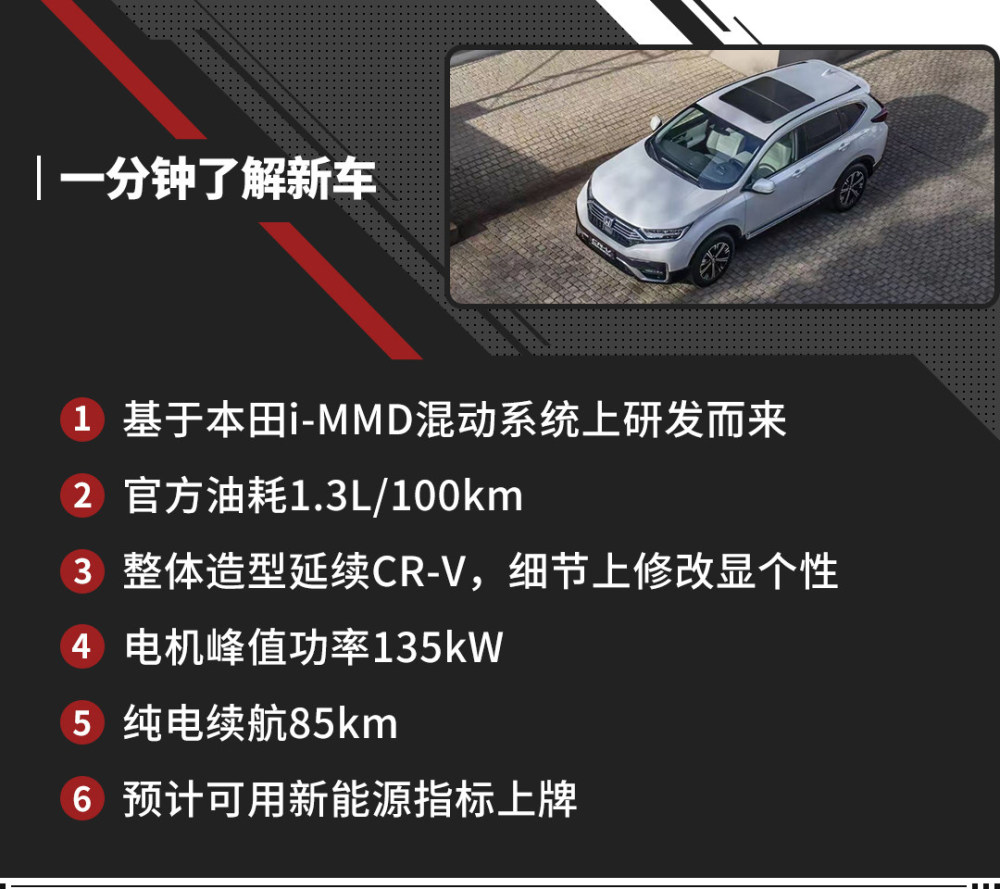 买车最重要是什么? 便宜? 安全? 省油? 好开? 小朋友才做选择………… 成年人都要! 当然这里会有人说,天下哪里有免费的午餐?如果我告诉你,真的有!你愿意尝试吗? 混合动力车型可以说是“又让马儿跑,又让马儿不吃草”,提升效率是关键点,混动系统能够将内燃机的工况调节至最佳,并且始终运行在最高效的区间;在低效率工况时,通过电机的辅助,让车辆行走起来,电机的最佳效率区间恰好与内燃机互补。 目前油电混动似乎是介于纯燃油车和新能源车之间是最优解,但是由于各地对于油电混动车的政策不同,有时候跟纯燃油车一样需要限购,让油电混合车辆难以推广,而插电混动车辆则可以享受新能源优惠政策,所以插电混动车辆会更有优势。 能不能换将油电混动的技术运用在插电混动上?一方面可以像油电混动一样提供优秀的燃油经济性,又可以像插电混动一样,日常使用纯电模式,长途使用混动模式? 本田提出了解决方法——SPORT BYBRID e+ 外观方面,新车与现款在售的燃油本在整体比例上基本一致,通过重新装饰格栅让车辆呈现出更加科技化的效果,突出车辆与众不同的身份。 多边形的前进气格栅在细节上区别于燃油版车型,使用多条辐镀铬装饰,相比起燃油版的黑色亮面装饰,插混版车型更倾向精致感,前杠造型跟燃油版车型保持一致,同样使用镀铬装饰条贯穿左右,并且在雾灯区域上扬。 侧面与普通版无异,CR-V的造型我们早已司空见惯,平直的腰线从翼子板延伸至车尾,更平直的腰线更加符合CR-V居家的定位,并且这种设计可以有效增加车窗的面积,增强车辆内部的开扬感。此外,双色的轮毂是亮点,后排还有隐私玻璃设计,后排私密性得到充足保障。 从车尾角度看去,从车顶处延伸出来一个小型的扰流板,同时两侧尾灯使用了熏黑式设计,中间由镀铬条相连,原厂熏黑的尾灯比后期贴膜更安全,这里笔者想要提醒一点,千万不要后期去给尾灯、头灯贴黑色的膜,会严重影响行车安全。 内饰部分,整体层次分明,虽然不能说这种设计有多老旧,但看了那么多年,总是希望能有更新,全液晶的仪表盘加上三辐式的方向盘依旧是熟悉的感觉。中控台西方拥有一个比较低矮的储物格,即便停车遇到狭小位置,也能轻松从另一侧下车,有点类似MPV的便利性。 从申报信息来看,CR-V插混版车型的长宽高分别为4694/1861/1679mm,轴距为2660mm,相比起同级别对手来看,CR-V的体型还算是有竞争力,对比起RAV4,CR-V更是长94mm,相信这无论是对于乘坐空间还是后备厢空间来说都是有好处的。对比起大众途岳、探歌等小尺寸的车型来说,CR-V在紧凑型SUV里面已经算是大块头了,再加上本田一贯的MM理念,你懂的~~ 动力方面是该车的重中之重,该车使用一台代号为LFB13的2.0L发动机和电子组成的SPORT HYBRID e+插电式混合动力系统,是基于i-MMD混动技术研发而来,该系统的发动机最大马力可达146Ps,电动机的峰值功率为135kW,最大纯电续航里程为85km,电池组的容量为16kWh。 说到插电混动系统,CR-V并非第一台车型,在海外市场,本田就已经有Clarity车型使用这一套插电式混动系统。参考Clarity,官方宣称这是一套无限接近EV的全新插电式混动系统,二者在机舱的布局上有非常高的共通性,使得在尽量不改变发动机舱的布局下就能安放全新的插电式混动系统,其双电机的结构通过改变定子的结构,将原有的圆形绕组方式改变为方形绕组,将电机的轻量化增加23%同时,功率密度提升1.4倍,扭矩密度提升1.3倍。 为了提升EV驱动模式的范围,本田提升VCU的功率,让车辆在EV模式下的最高速度可达160km/h,同时该车拥有17kWh的锂离子电池,配合上全新的磁耦合电感,让车辆的纯电续航比普通i-MMD车型长4倍,功率提升1.4倍。 当然,为了保证大功率输出,电池包需要增加水冷系统,这也是插电混动系统和普通混动最显著的区别。该系统有两种回路,通过三通阀控制,专门设计一条旁通回路给车辆充电时使用,加强车辆在充电时的热管理。 值得注意的是,笔者此前参加Clarity试驾活动时,该系统是没有针对寒冷地区设计保温功能的,不知道CR-V上的系统是否会增加保温功能,毕竟在北方地区冬天对于电池的考验还是非常大的。 好了,下面就需要您的想象力了 在此前试驾的插电式混动系统,动力切换丝般顺滑,电机驱动和内燃机介入是不会有明显的顿挫感,但可以从声音上和仪表盘上判断发动机是否已经介入。如果是普通城市道路行驶,在轻松驾驶时,车辆是可以完全依靠纯电行驶的,其静谧性、舒适性会较高。 同时,某些车辆的混动系统在电制动和机械制动之间切换时会有突兀,而本田这一套系统几乎无法察觉。 当然,以上的驾驶感受主要针对Clarity车型,至于CR-V车型跟Clarity是否一致,就需要等到试驾车的到来才能知晓。 同级别来看,同为合资品牌的插电式混动系统车辆只有起售价39.98万的宝马X1、标致4008以及雪铁龙C5 AIRCROSS三辆车型,而标致和雪铁龙这两款车型的销量不大,宝马X1在同级别来说是销量最高,受众面最广的车型之一。 虽然RAV4即将引进PHEV车型,但CR-V拥有先手的优势,对于抢占市场会有较大的领先,再加上汽油版CR-V上的空间大、综合素质高等优点,再加上在空间表现上可以说是同级别一流水准,比起RAV4更出色。 相比起同级别的纯燃油对手,CR-V插电混动明显在动力系统上已经处于领先地位,在技术上解决了传统内燃机的痛点,同时并没有增加用户的学习成本