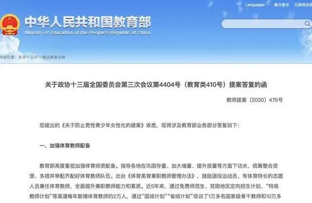 针对有全国政协委员提出《关于防止男性青少年女性化的提案》,1月28日,教育部官网发布的《关于政协十三届全国委员会第三次会议第4404号(教育类410号)提案答复的函》(下称《答复》)表示,将从加强体育教师配备、加强学校体育制度顶层设计、深入开展健康教育及加强青少年心理健康教育相关问题研究等方面更好的解决这一问题。 《答复》从前述几个方面对现有的安排和实施情况进行了详细解释,并提出下一步工作安排。 根据安排,教育部将要求各省、校加大《体育美育兼职教师管理办法》落实力度,在“国培计划”“省培计划”中,加大力度提高体育教师素质能力,同时,适度改进体育教师教学方法、形式,更多注重学生“阳刚之气”培养,继续通过多种渠道新增体育教师。 下一步,教育部将加强已立项相关教育部哲学社会科学研究项目中后期管理,推动多学科交叉研究,力争产出一批高质量研究成果,更好的服务青少年心理健康教育工作。 其实早在此前广电总局就有规定,要求男艺人上节目不能戴耳钉!包括网络综艺节目! 各种原因,大家心知肚明! 我觉得男生也该找回,男生该有的荷尔蒙。 谢霆锋这句话,引起了不少国人的共鸣。 男孩不像人们印象中那么“皮实”了 “有些男孩娇滴滴的,行动扭扭捏捏,比女孩还要胆小怕事,而有些活泼好动、敢冒险、敢质疑的男孩却被看成问题孩子。”在孙云晓看来,男孩“全面溃败”乃至趋向“女性化”的现象,已成为教育全局性、整体性的问题。 不让男孩子越来越娘:被带歪的男孩子 现在中国很多男孩子都弄得像韩国那些男星一样,化浓妆、描眼眉眼线、涂口红,割双眼皮,这样那样。 稍稍有一样没弄好,就觉得自己见不得人。 《某某练习生》出道的一名小鲜肉在机场,面对粉丝拍照。一路举起手包挡住自己的脸。 “吓死宝宝了,都说啦我没画眼线,不能出现在相机面前的。” 涂着比女孩子还厚的粉,画着比女孩子还妖艳的妆,仅仅因为眼线没花好,就要翘起兰花指挡着自己的脸。 近两年,这类的男孩子,越来越多了。 年轻人是国家未来,年轻人的价值取向,会影响到国家的价值尺度。 追求个性没什么不好,但是如果整个社会都去追捧女性化男星,绝大部分男孩子都去为追求“柔弱美”,国家将变成什么样子? 我们能指望一群天天描眉,涂指甲的男兵去站岗吗? 我们能指望一群端着兰花指的男运动员去打篮球吗? 我们能指望一群玻璃心的官员去跟外国讨价还价吗? 如果整个社会都去追捧“柔弱美”,很多男孩子不光是外表变得雌雄莫辨,就连脾气性格也越来越女性化。 小肚鸡肠,爱发脾气,面膜做得比女生还勤,香水3米外都能闻到。 更为严重的是,这些男孩子,承受不起生活中的各种压力,最终演变成心胸狭窄的“瓷男”,压力一大,他们就碎了。 当整个社会都以“柔弱”为追求的时候,哪还生得出什么血性? 一个民族不能丧失血性 在一些人眼中,雄性气质不过是粗俗、野蛮的代名词。 他们只知道追求所谓的“时尚、品位”,追求所谓的精致生活,做一个安安静静的美男子,渐渐忘了一个真正的男人就应该顶天立地。 如果真正的爷们在越来越少了,“娘们”的男人却越来越多:干事磨磨蹭蹭,做选择畏首畏尾,男人的那种豪情万丈早没了踪影。 一个人要去追求柔弱,那是他的自由,但是一旦“娘炮”成为主流,就会吞噬掉这个民族的血性。 中国的男人们,到了把自己唤醒的时候了! 是男人,就该有的男人的荷尔蒙,有男人的骨气和血性! 家长应该做的是更加应该关注加强孩子的户外体育运动锻炼。 很多家长都希望自己孩子的自信心能够得到提高。自信心可以让孩子更加积极地面对困难,能让周围的人感受到孩子的气势。 对于一些有神经质倾向或者患有慢性疾病的患者,经常运动可以通过身体活动和团体经验来增强他们的自信心,使得他们学会放松、专注、果断、诚实地沟通交流,因此一些心理学家认为武术是很成功的咨询辅助手段。而对于正常的儿童来讲,运动同样可以提升他们的自信心,提高情绪的稳定性,有效降低焦虑和抑郁的情绪。 可能现在在中国孩子说:“我要运动锻炼”大人们总会说“练体育爱运动,有什么前途打呀杀呀多野蛮暴力老大不小了就不能干点正事” 其实,真正接触后你会慢慢发现,学习一项体育特长并不只是为了拿冠军,当你在运动训练的过程中会经历挫折痛苦,更有发奋向上!这里有金牌喜悦,更有遗憾惆怅,胜利后的喜悦总是那么难忘,失败后的泪水如此刻骨铭心! 有时身体生病,伤病疼痛,却义无反顾的继续训练,会让你明白生活总会不尽如人意,年轻时总要吃苦,才能享受到自己得来的成果!在运动的过程,渐渐培养自己的小男子汉气概! 爱运动不是暴力的定义,它教会我们的是勇敢、智慧和尊重,请尊重这项运动,坚定你的选择。 那么父母需要做的仅仅是“把最好的都给他”吗? 当然不是!带他走出家门吧! 在运动中陪伴他,收获健康,收获坚强,收获一种磨练中的成长。