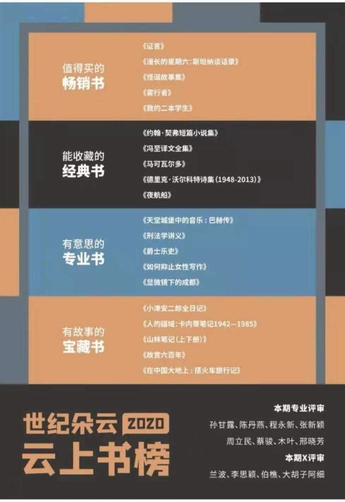 想买书照着这份榜单买不会错。2月18日,由世纪朵云推出的“世纪朵云·云上书榜”发布了2020年度榜单,为读者回溯了2020年度出版的好书。世纪朵云还首次公布了旗下五家书店(朵云书院·旗舰店、朵云书院·广富林店、朵云书院·戏剧店、思南书局、思南书局·诗歌店)的年度图书销售总榜和新书销售榜。 从2020年9月起, “云上书榜”至今已经评选出六期榜单。年榜评选范围是2020年出版的图书,候选书单由前六期的上榜图书和评审们的补充书单组成。最终评选出4大类别共20本上榜图书。其中,“值得买的畅销书”是《证言》《漫长的星期六:斯坦纳谈话录》《怪诞故事集》《雾行者》《我的二本学生》;“能收藏的经典书”是《约翰·契弗短篇小说集》《冯至译文全集》《马可瓦尔多》《德里克·沃尔科特诗集(1948-2013)》《夜航船》;“有意思的专业书”是《天堂城堡中的音乐 : 巴赫传》《刑法学讲义》《爵士乐史》《如何抑止女性写作》《显微镜下的成都》;“有故事的宝藏书”是《小津安二郎全日记》《人的疆域:卡内蒂笔记1942—1985》《山林笔记(上下册)》《故宫六百年》《在中国大地上 : 搭火车旅行记》。 为读者甄选四大类别年度好书 “世纪朵云·云上书榜”的初衷是为广大读者从茫茫书海中寻找好书。四个类别代表了四个选书的角度,让读者可以跟随这份榜单,挑选到适合自己阅读并且值得阅读的书籍,并最终形成自己独立的选书主张。此次的年榜榜单也充分体现了“云上书榜”所提倡的多元阅读。 “值得买的畅销书”里,中外畅销书均有上榜,展示出榜单对世界文学和中文写作的双重关注。评论家木叶特别推荐了路内的《雾行者》,他说:“能带来意外,并在意蕴和形式上都具有冲击力的小说总是难能可贵。《雾行者》正是这样的一部作品,是路内的一次犯险,一次对自我以及汹涌世界的敞开。” “能收藏的经典书”中,《冯至译文全集》《德里克·沃尔科特诗集(1948-2013)》皆是带有完整回望性质的重量级作品,而《夜航船》的入选,又代表了云上书榜对经典书重新校订版本的特别关注。“X评审”伯樵表示:“《夜航船》这样的‘老书’,一边不被以中古文学、史料经典文献校勘为主的传统学界重视,一边却又存在着在文人旨趣、版本校勘上的价值,能经过重新的校订出版,实在善莫大焉。” “有意思的专业书”中的上榜图书涉及音乐、法律、历史等专业。复旦大学中文系教授张新颖特别推荐了《天堂城堡中的音乐 : 巴赫传》,“这部传记的不同凡响,在于作者以罕见的天赋和洞察力,同时通过历史和演奏两条途径通向巴赫,不仅让我们认识了这个创作中的人,也仿佛让我们在阅读过程中重新听到了巴赫的音乐。” “有故事的宝藏书”中,《小津安二郎全日记》高票当选。X评审李思颖说出了这本书的“宝藏”之处:“战争之前的特征是‘留’——记述时间和内容表现出刻意的跳跃;战后的特征则是‘流’——记述几乎不间断的生生不息,两者构成他圆融的‘无’,而我们,则得窥他一甲子人生的‘有’。 评审的意见碰撞让榜单更具价值 延续了“云上书榜”一直以来的评选方式,此次年榜的评选由八位专业评审和四位“X评审”组成。专业评审是:作家孙甘露、陈丹燕、蔡骏,《收获》文学杂志主编程永新、复旦大学中文系教授张新颖、学者周立民、媒体人邢晓芳、评论家木叶。X评审是来自各行各业并且在各自领域有着一定影响力的阅读爱好者:兰波、李思颖、伯樵、大胡子阿细。 张新颖教授谈到自己参与评选的感受时说:“感受特别深的有两点。一个是‘X评审’这个设置非常好。通常专业评审虽然是专业领域的,但是也会有专业的局限,‘X评审’兼顾到了广大读者的阅读喜好。另一个是‘云上书榜’的评选,不是让评审们在主办方提供的候选书目里选,而是由评审们自己提供候选书目,然后大家在这当中进行评选和讨论。这对于评审也提出了更高的要求,让我们不得不去看更多的书。如果不是参加‘云上书榜’的评审,可能有些书我就不会去看,所以担任评审,让我自己的阅读范围也拓宽了。” 而每一期榜单评选流程中必不可少的线下评审讨论会,则让所有评审们可以直接面对面进行交流。可以说,正是评审们的“较真”和每一次的意见碰撞,才让榜单更有价值。评论家木叶这样评价参与评审的过程:“参与评选的感受是沸腾有时,跳脱有时,静默有时。坚持自我是为了说服对方,说服对方又有赖于不断审视自我。最终是为了像博尔赫斯所说的那样:命运在于与读者相遇。发现别人带来了自己没注意到的好书,这快乐是隐秘而摇曳的。” “世纪朵云·云上书榜”的初衷就是通过专业评审加上非专业的“X评审“共同评选的机制,吸收更全面的意见。“X评审”兰波表示:“专业评审与X评审的结合,让榜单上的作品充满了可读性,不会说书到手后读不下去。或者即使读得磕磕绊绊,也一定有很多思考和收获。” 所有上榜图书将在世纪朵云旗下书店:朵云书院·旗舰店、朵云书院·广富林店和思南书局专架陈列。 《繁花》稳居世纪朵云旗下书店2020年度销售总榜第一 此次,世纪朵云还首次公布了旗下五家书店(朵云书院·旗舰店、朵云书院·广富林店、朵云书院·戏剧店、思南书局、思南书局·诗歌店)的年度图书销售总榜和新书销售榜。比起由专业