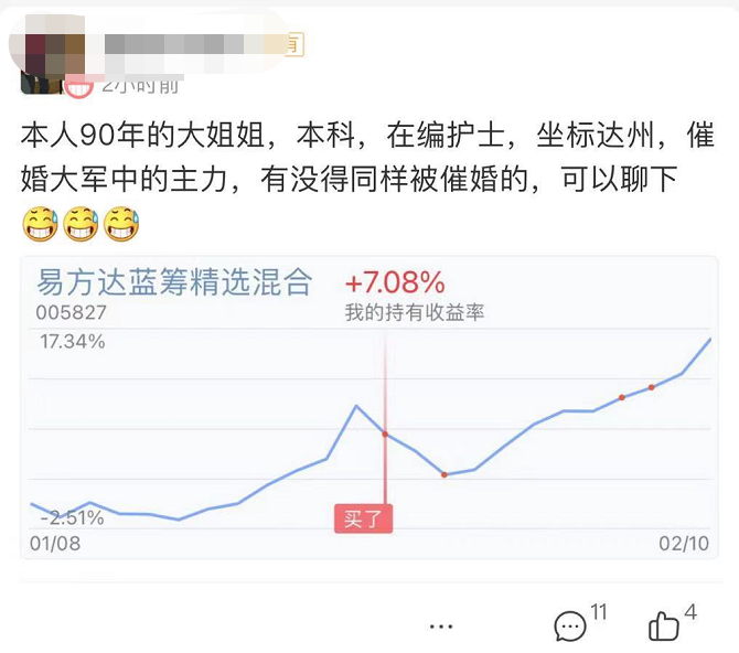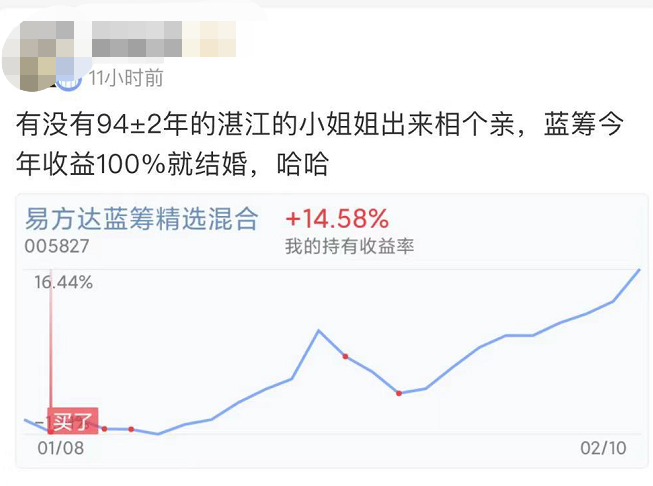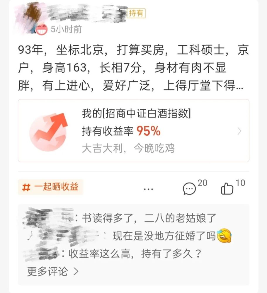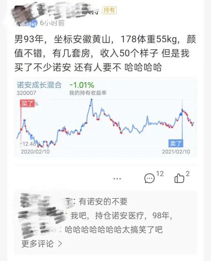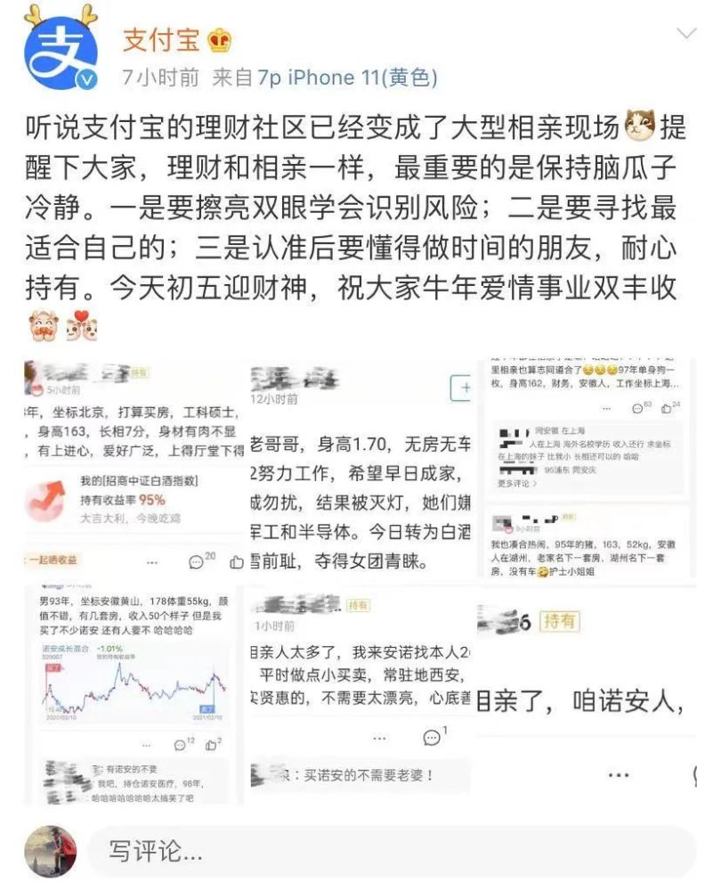 . b8 n9 A& A: P: q基民们又有新玩法!这个春节,支付宝的理财讨论区都成了相亲现场了…过节期间闭市,平时忙于研究基金理财,趁着过节也轻松愉快一下,再顺便相亲看看有没有有缘人,至少在共同的讨论区都会有共同的话题。真的不错! 基金评论区被相亲内容攻陷 虽然口口声声不结婚,但大家的内心里,依然向往着幸福。春节假期基金休市,不少年轻人在基金讨论区纷纷晒出自身条件和理财收益“在线征友”,引发更多人欢乐围观。 不论是哪个软件,都有可能变成大型相亲现场,只是万万没想到,支付宝的的理财社区也“沦陷”了。 现在的支付宝理财社区中,随处可见的都是年轻人自己,或者长辈发布的相亲信息”。 数量之多已经惊动了支付宝官方,官微特别做出了回应,并且提醒网友:财和相亲一样,最重要的是保持脑瓜子冷静。 一是要擦亮双眼学会识别风险;二是要寻找最适合自己的;三是认准后要懂得做时间的朋友,耐心持有。 有网友表示,换个角度想,能逛基金社区的,说明:1、双方都知道理财;2、有共同的兴趣爱好,能聊到一起;3、有一定的经济实力! 吃瓜群众:结婚宴请利好白酒 过去一年白酒板块持续大涨,很多持有白酒基金的投资者过了一个快乐的春节。在支付宝理财平台的基金评论区,也数白酒讨论区的相亲热情最为高涨。评论区的吃瓜群众更是出现神评论:“相亲之后需要结婚办酒席,继续利好白酒!” “网红”诺安基金的支付宝讨论区也不甘示弱,基民们化身段子手“相亲”,笑称“诺安人只找诺安人,一起患难一起成长。” 另外,易方达蓝筹的评论区也出现了相亲贴。 有网友调侃说,比起爸妈逼着去相亲,在理财社区里相亲感觉真香。 “上来就晒收益,有理财意识,有共同话题,是我见过最真诚的相亲方式了。”有网友说,“投资基金太欢乐了,最后能不能赚钱不知道,反正也就投了5000块钱,能不能相着亲也不知道,但每天有看不完的段子是真的!”也有旁观的网友认为,这样的相亲纯粹属于春节凑热闹打发时间,不能太当真。 南通0 |