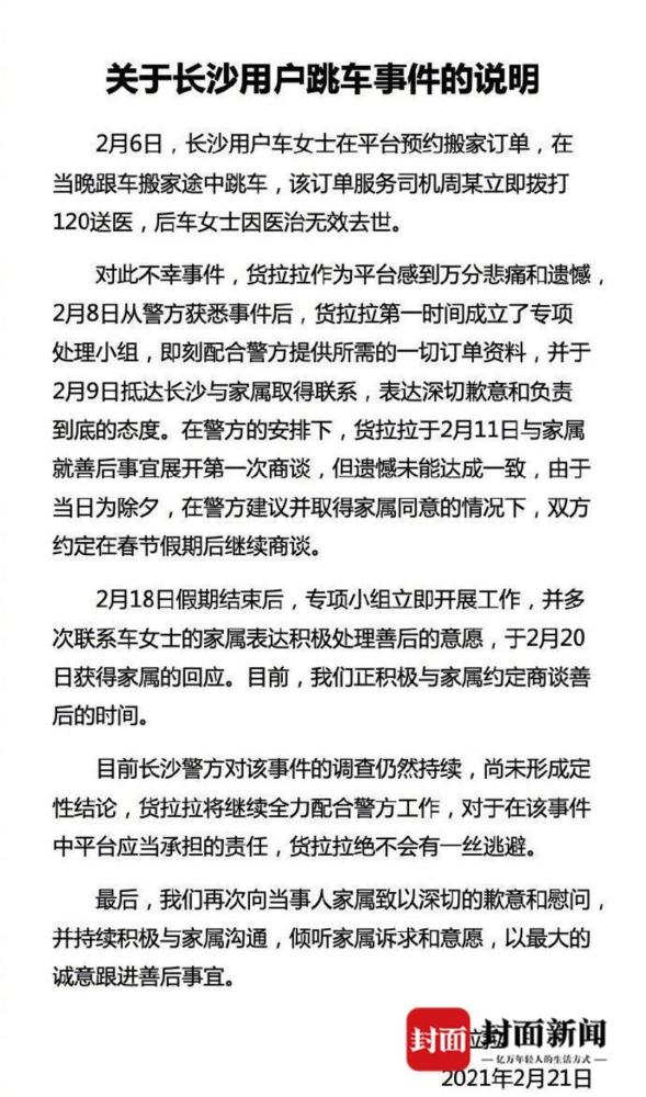 2021年2月6日晚9点过,湖南长沙年仅23岁的车莎莎从货拉拉副驾驶跳窗,后经抢救无效不幸离世。 车莎莎(家属微博图) 2月21日下午,死者弟弟发微博提出5大疑问,质疑车辆为何3次偏航到小路、车内为何无录音录像、跳窗为何后脑勺先着地等细节。 21日晚,货拉拉发文回应称,警方尚无定论,不会逃避责任。 晚上独自搬家 家属称司机3次偏航 车莎莎的弟弟称,2月6日晚上8点,姐姐从天一美庭搬家到梅溪湖步步高公寓,车程约10公里。 2月6日晚上9点17分车莎莎上了货拉拉,9点24分,车莎莎还在工作群和同事互动,看不出有情绪异常。 车莎莎的弟弟称,9点30分,车子开到曲苑路时,货拉拉司机拨打了120和110,说车莎莎因为面包车三次偏航,在岳麓区曲苑路跳车窗了,120赶到现场时,车莎莎已经倒在了血中昏迷不醒,被紧急送到岳麓区航天医院抢救。 据车莎莎弟弟透露,2月11号,警方召开民事协商会,他从货拉拉公司工作人员和货拉拉司机的笔录了解到,姐姐因为3次偏航而选择了跳窗。但他们想看看车上或者货拉拉App上有没有录音和录像等资料来还原真相,货拉拉工作人员却说车内无任何录音录像设备、货拉拉App也没有录音录像功能。 车莎莎(家属微博图)家属提出5大疑点 上司称不相信她会无故自杀 车莎莎的上司称,女孩事业正处上升期,月薪两万,已经有了买房的能力,平时是个积极善良的的人,死前还在和同事分享东西,不可能是无故自杀。 据此,车莎莎的弟弟提出了5大疑点。 为什么司机要三次偏航?车莎莎弟弟质疑,肇事司机在笔录中提到自己有三次偏离了导航规划的路线,作为一个从事搬家工作两年之久的司机,家就在附近,为什么不选择正常导航路线及平台要求路线,而是舍近求远选择一条没有监控的道路?是不是早有预谋?货拉拉有没有对司机进行相关的安全审核? 车莎莎弟弟称,家人都不相信车莎莎会因为偏航跳窗!6分钟前还用一如既往的状态在工作群里发信息,6分钟后就突然跳窗了,这短短的6分钟里到底发生了什么? 车莎莎弟弟还强调,司机的笔录说是“自己跳窗”,为什么跳窗是后脑勺先着地? 2月22日,车莎莎的弟弟再次发布朋友圈,称感谢大家关心,真相可能会迟到,但终会昭雪。 有网友提出司机偏航到了自己家附近,但此说法尚未得到证实。 货拉拉回应:不会逃避责任 21日晚,货拉拉发文回应称,2月6日,长沙用户车女士在平台预约搬家订单,在当晚跟车搬家途中跳车,该订单服务司机周某立即拨打120送医,后车女士因医治无效去世。 货拉拉声明2月8日从警方获悉事件后,货拉拉第一时间成立了专项处理小组。2月18日假期结束后,专项小组立即开展工作,并多次联系车女士的家属表达积极处理善后的意愿,于2月20日获得家属的回应。目前,货拉拉正与家属约定商谈善后的时间。 货拉拉还表示,目前长沙警方对该事件的调查仍然持续,尚未形成定性结论,货拉拉将继续全力配合警方工作,对该事件中平台应该承担的责任,货拉拉不会逃避。