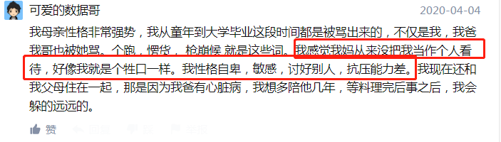 偶然间看了一期《超级育儿师》,里面有这样一幕让人十分震惊,一位妈妈跟孩子相处时貌似一直都在不停地嚷嚷,孩子起床起晚了,妈妈破口就是大骂:“烦死了,天天都是这样”。 孩子洗漱刷牙的时候磨磨蹭蹭,这时妈妈又急着对孩子吼道:“你到底还刷不刷?” 孩子一着急就把杯子往地上一扔,此时的妈妈火冒三丈,劈头盖脸一顿骂就更加严重了,甚至旁边的爸爸也不能幸免。 就是这么一个简单的清晨,本该好好享受美好一天的开始,可是孩子哭声和妈妈的骂声交织在一起,真的让所有人都感到烦躁与喘不过气来。 节目组下一个动作很有意思,他们将这位妈妈邀请到一个秘密空间,里面循环播放着这位妈妈对孩子歇斯底里的吼叫声。 没到十秒钟时间,这位妈妈就已经不能忍受这种声音,立马蹲下来捂住自己的耳朵。 一位成年人对自己每天的吼叫声片刻都忍受不了,更何况是一位年幼的孩子呢? 父母不要对自己平时骂孩子的行为不以为然,因为有相关医学研究表明,孩子经常处于一种被父母大吼大叫的环境下 ,他的大脑结构是会发生相应的改变的,会导致孩子情商和智力远低于正常平均水平,除此之外对孩子的性格养成也会有很大影响。 1.越骂孩子,孩子越没安全感 知乎上曾经有人问过这样一个问题:在父母长时间的谩骂声中长大,对你心理会有什么影吗? 有人说,叛逆,喜欢独处,有社交恐惧症;还有人说,因为害怕妈妈生气养成了一种讨好型人格,为人处事特别敏感,且抗压能力特别差。 更有甚至已经得了抑郁症,缺乏安全感,不敢相信和依赖别人,所以一生都没有找伴侣 ,直至五六十岁还是孤身一人。 2.越骂孩子,就越容易失去孩子 因为父母控制不住情绪,将怨气发泄到孩子身上导致孩子想不开的案例有很多,去年发生在武汉的14岁男孩跳楼,就是因为妈妈没有很好控制自己情绪导致的。 因为孩子在学校打牌被老师发现,叫来家长后,妈妈从办公室出来立马给站在走廊的儿子两个耳光,随后接踵而来的就是不断谩骂声,旁边经过的同学都看在眼里,孩子等妈妈走后,沉默了两秒钟便转身一跃而下。 还有一位男生,高考成绩不理想,回家不仅没有获得妈妈的安慰,迎接的反而是妈妈劈头盖脸一顿谩骂 ,本就因成绩不理想心情抑郁,加上父母的数落,孩子忍受不住就选择跳楼。 很多人都说,现在孩子太敏感了,随便谁打骂一下就承受不住要寻短见,殊不知,在孩子看来,长期处于父母歇斯底里的打骂中生活,本质上对自己的存在是很怀疑的。 他们或许会想:自己做什么都是错的,对生活看不到希望,在父母身上也不能获取生的勇气,所以只能选择结束自己生命,来一场自我解脱。 3.好好说话,肯定教育是孩子一生的财富 潜能的完全激发向来就只会发生在那些能经常得到父母肯定的孩子身上。 曾看过一份调查研究,其中数据表明,经常被否定的人,潜能开发仅能达到20%—30%。一旦得到外界肯定潜能开发程度能达到50%,若给予孩子肯定的人是自己父母,则开发程度能达到80%以上。 所以要想养育出更优秀的孩子,父母应该少点责备多点鼓励,因为只有当父母责备的声音越小,孩子才能听的更认真,最终教育的效果就会更好。 很多父母都会反应,自己孩子不听话,从生理学角度来说,因为你经常是以谩骂的口气跟孩子说话,分贝会比正常说话高很多,因为声调高,孩子大脑激素水平也会瞬间增高,导致其情绪极其不稳定,就无法冷静思考父母在讲什么,反而是你越说他越听不进去。 所以,当父母愿意以理智的态度跟孩子好好说话,孩子和家长都情绪平和,就更有利于双方沟通交楼,从而解决两方之间存在的问题。 爱孩子,就请跟他们好好说话,若不小心吼了孩子,请事后一定要跟孩子道歉,只有父母愿意好好说话,才能养育出更幸福的孩子。 ) [$ q% f. x! w5 D9 H, o2 N