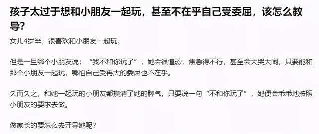 孩子为了交朋友,会卑微到什么程度? 知乎有一个超三十万人关注浏览的问题,读来令人心酸。 这位网友说,自家孩子跟其他小朋友一起玩时,一旦某位小伙伴说:“我不和你玩了。” 孩子就会立马停止所有反抗,即使受到再大的委屈,也会乖乖照做。 比如,孩子加入他们小团体时,被要求学叫狗吠,女儿照做了。 小朋友喜欢玩“捉坏蛋”的游戏,而“坏蛋”每次到最后都会被“正义”的人士群攻,所以没有孩子愿意做这个“坏蛋”,但女儿做了。 一次在草地上,女儿被要求趴下驮其他小朋友转圈,而剩下的其他小朋友就在旁边起哄。 妈妈了解情况才知道,原来孩子做这一切都只是想跟他们玩! “他们威胁我,如果我不照做,就不和我玩了。” 她大为吃惊,不知道哪里出了问题。 网友提醒这位妈妈:“心理学上有个行为叫:扳机点。 孩子被拒绝是一个扳机点,因而触发了孩子一系列的心理反应。 家长们先要排查生活中大人有没有经常威胁或否定孩子,比如你再不如何,我就如何。” 心理学指出,孩子的性格养成,很大程度上依托于他的父母,如果父母喜欢威胁式教育孩子,孩子就会被养成胆怯畏缩、自卑内向、不敢表达自我的性格。 教育孩子,这个误区,千万要避免。 威胁式教育,藏着巨大隐患 前不久,闺蜜打电话给我,说自己犯了一个大错。 因工作晋升原因,3年前她把孩子送回老家的婆婆照看。 当孩子和婆婆一起回来时,她发现孩子变得胆小怕事,老爱一个人缩在角落里。 朋友纳闷极了,她夫妻俩都是乐观开朗的人,按照遗传也不应该是这样的。 直到某天下午,她临时回家取文件,听到婆婆对孩子说: “你看,你妈妈刚回来又要出去了,还不带你去。我就说你妈不要你了,你还不信,这下信了吧。你妈就是不要你了!” 随后便是孩子痛苦地嚎啕大哭,边哭边喊:“我妈才不会!才不会!” 朋友这才意识到,原来在他们缺失的这三年里,婆婆为了省事,喜欢威胁式教育,动不动就吓唬孩子,导致孩子性格大变。 威胁式教育,养不出勇敢的孩子。 看过《一起出发吧》这综艺,应该对杨烁父子并不陌生。 选房子时,孩子选择自己的幸运号码5,当父亲知道5号房距离最远、海拔最高时,他大发雷霆,完全无视孩子的惶恐与无助。 出发过去的路上,父子之间没有感人温馨的鼓励话语,反而是父亲对孩子一路嘲讽和抱怨: “你能不能快点,不能我再让你跑到村口再走回来!” “如果想让我跨进门槛,就从头再走一遍。” 面对爸爸的各种威胁,孩子从来不敢开口说些什么,更不敢跟爸爸去争取什么。 令人心疼。 一位教育专家曾说:“父母的威胁式教育是最致命的,它让最亲密的人变成了最陌生的人,甚至压制了孩子的天性。 久而久之,或许我们得来了一个‘听话’的孩子,但绝对不是最有灵气的孩子。” 小孩别看年纪小,但他们都很聪明。 如果他们经常被亲近的人威胁,久而久之,孩子便会处于“习得性无助”的状态下,性格越来越压抑自卑,越发不敢表达自己,甚至做事之前都会下意识的看向身边的人,以获取“批准”。 孩子的健康成长离不开家长的走心教育。家长多鼓励孩子,才能让家变成温暖的臂弯,守护孩子的健康成长。 为孩子建立一个“民主家庭” 父母喜欢威胁孩子,表面看来是为了省事,更深层次的原因却是觉得孩子就是自己的附庸品,从来没有考虑过他们也是独立的个体。 真正爱孩子,父母要把孩子当成一个个体来看。 黄多多因染发、涂指甲而频频登上热搜,受到一大批网友的“谩骂”。 但爸爸黄磊从来没有因为这些事情批评过她,反而鼓励她努力做自己。 在女儿参演的戏剧首映礼上,因看到了女儿的成长和不容易,他一度情绪失控,又哭又笑。 因为他的这种教育方式,孩子从小就充满了自信,即使出入各种场合也从未胆怯过,甚至于孩子的思考能力、表达能力和处理问题的能力,一点儿也不逊于成年人。 试想,如果黄磊采取的是威胁式教育,当女儿想尝试染发,他说打断女儿的腿,当女儿想涂指甲,他说你弄了就不要回家了,又会是怎样一场景。 当孩子跟父母提出自己想玩游戏或想去做某件事时,做父母的不要一味拒绝,而是根据实际情况跟孩子有商有量,有张有弛,既照顾到孩子的需求,又表达出父母的要求。 为孩子建立一个“民主的家庭”,让孩子切身的感受到家的存在,了解自己在家的位置,从而加深孩子的认同感和归属感。 在教育这条路上,父母应多用点心去感受孩子的感受,蹲下来与他们同等的高度对话,尊重他们,欣赏他们。 孩子是花儿,需要家长用心呵护 1、情感引导拉近与孩子的距离 樊登在《读懂孩子的心》一书中,讲过这样一个故事: 每天孩子到了睡觉时间,就是鸡飞狗跳的时段,孩子根本不管父母的催促,反而玩得越来越起劲,哈哈大笑。 妈妈看到孩子完全不管教,反而松懈下来坐在一旁看着孩子玩。 孩子玩了一会儿,看到妈妈没有再大吼大叫,非常高兴,一下子钻到妈妈怀里,跟妈妈玩起来了。 妈妈很耐心地跟孩子玩了三两分钟,时间虽短,但孩子的内心得到了巨大的满足。 我们的孩子经常会做很多奇怪的事,其实这些只是为了获取父母的关注,如果父母能适时的关注他们,他们的内心就会感到幸福和满足。 在我们的生活中,如果父母能够让孩子感受到你和他之间的关注是有对流时,孩子就会喜欢听你的话,会信任你,依赖你。 2、以平等的姿态和孩子交流 绝大部分的孩子都不愿意绝
