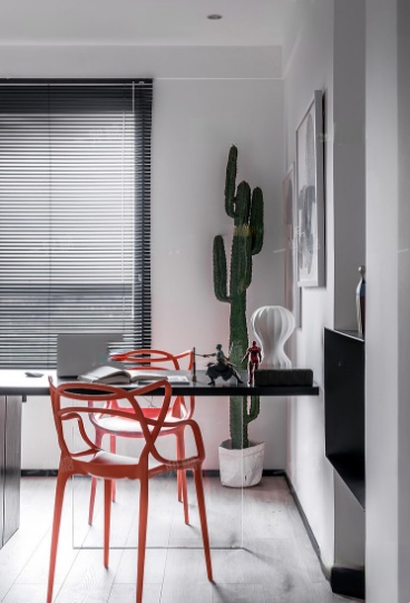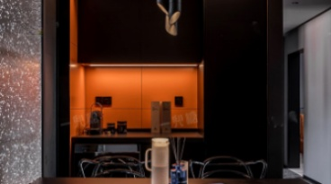 橙色的跳跃带来点睛的一笔,餐厅本就是烟火集聚地,自然少不了生机。水磨石地板与=透光水泥板交相呼应,黑色原木纹餐桌与光亮的餐椅相得益彰。