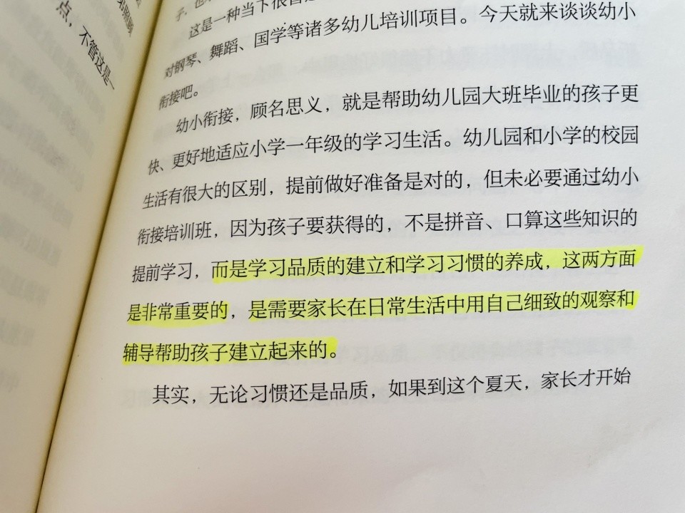 出门的时候,发现电梯里贴了一张纸,是一份小学报名通知,原来这么早就要收集孩子的报名信息。掐指一算,也就还有6个月,时间确实也比较紧张。 邻居们已经在谈论幼小衔接的问题,准备去上培训班,让孩子轻松适应小学生活。 我记得大宝上学时,咨询了当小学老师的同学,她告诉我学好拼音就好。我按照她的建议,花两个月时间,突击了拼音,上一年级果然很省心。老师的话管用! 但是现在9年过去了,课本都变了样,教学形式也有很多改变,需要重新研究应该学什么,以便跟上节奏。以我的经验,东打听西打听,不如听小学老师的靠谱。 正好在看网红小学老师王悦薇的新书,她特别提到幼小衔接的问题: 孩子要获得的,不是拼音、口算这些知识的提前学习,而是学习品质的建立和学习习惯的养成,这两方面非常重要。需要家长在日常生活中,用自己细致的观察和辅导,帮助孩子建立起来。 真正的幼小衔接,不是上一年级前暑假的2个月,也不是6个月,而还要更早,甚至从孩子刚学会走路、说话时,就要有意识地培养学习品质和习惯。 美国国家教育目标委员会认为,小学生入学准备状态,包含5个重要发展领域: 身体和运动发展 情绪与社会性发展 学习品质 言语发展 认知发展与一般知识基础 这5个方面,在国际上基本达成共识。孩子在这5个方面发展得好,就是一个入学准备充足的孩子,以后在学校教育中会获益。 我注意到,这里同样提到了学习品质的问题,但是幼小衔接具体要做啥,家长们还是很迷惑。我写过一篇不建议孩子上幼小衔接班?上一年级后才明白,幼儿园要做什么准备 这篇文章重点介绍认知发展和一般知识基础,这次专门针对学习品质和习惯分析一下。综合老师、权威机构和孩子上学的一些经验,我总结了几个需要重视的问题。 认真听课,不走神 一年级知识比较简单,在学前有拼音、算术知识积累的孩子,会如鱼得水。但是如果上课不认真听讲,那就是在吃老本。等到老本吃光,再学习就会吃力。 现在流行一种说法,“超前学习的危害会在三年级会爆发”,其实核心不是超前学习知识,而是没有养成认真听课的习惯。 直接告诉孩子认真听讲,不要走神,这句话就像没说一样,家长应该在日常生活中培养孩子这种品质。 当孩子问你问题的时候,要认真倾听,孩子说完后,积极回答孩子的问题。不懂的问题就跟孩子查书、上网搜、请教别人,直到找到正确结果为止。父母的行为会对孩子形成正向影响,让孩子明白认真倾听具体该怎么做。 还要让孩子养成专注的习惯,一节课40分钟,老师至少讲20分钟,孩子要能坚持20分钟不走神才可以。 训练专注力的方法很多,要做到平时不打扰孩子,让孩子坚持阅读,玩一些迷宫游戏、连线游戏、找不同游戏、扑克牌游戏等。 做好计划,不拖拉 小学生磨蹭是出了名的,都能做到全国统一。写作业、吃饭、睡觉、起床、上学等等,每个环节都存在磨蹭的行为。 “我复待明日,万事成蹉跎”,磨蹭就像一种病,需要治。上小学前要养成按计划行动的好习惯,不要拖拉磨蹭。 家长要帮助孩子建立时间观念,感受1分钟有多长,知道15分钟能做多少事情,了解时间的重要性。 给孩子准备一个沙漏或者闹钟,在写作业时,限定时间,在规定的时间内完成任务,让孩子习惯紧迫感。 不催促孩子做事,尊重孩子的节奏,允许孩子慢慢来。当孩子心情平和,按计划做事之后,慢也是快。 自己整理,不依赖 上小学后,孩子的书本、工具比较多,需要自己整理,家长可不能跑进学校帮忙,所以要早一些放手,并锻炼孩子。 每天写完作业后,让孩子把第二天需要的书本、文具、工具等装进书包,确保没有遗漏。最初的时候,家长可以教孩子进行分类,让孩子自己动手,熟练了就可以完全放手。 每天晚上,把第二天要穿的衣服找出来,放在床头,早上起床的时候,换下睡衣,穿上准备好的衣服。如果穿带鞋带的鞋子,也要学会系鞋带。万一在跑跳过程中松了鞋带,可以自己处理。 学会自己叠被子、收拾自己房间的卫生,也是很好的锻炼。有的孩子上一年级就住校了,这些能力必须要具备。 学会交往,不压抑 进入小学,学校、老师、同学都是全新的,而且一相处就是6年甚至更久。孩子需要和老师交流,需要和同学交朋友,这就要具备一定的社交能力。 要想交到好朋友,就要爱分享,不管是物质还是心情都可以用来分享。还要多帮助别人,多替别人着想。李玫瑾教授说过,孩子有朋友,遇到困难的时候,就有人帮助。 孩子要学会沟通,遇到事情不要胡乱猜测,也不要埋在心里,及时跟同学说、跟老师说、跟家长说,可以避免不必要的麻烦和误会。 要学会表达自己的想法,有不明白的问题,要敢于去问老师、问同学,得到正确的答案,心里有一些特殊的想法,也要及时说出来。不压抑自己,才能使学校生活更轻松。 喜欢阅读,不迷茫 现在是大语文时代,重点考察阅读面。温儒敏说过:高考语文要求阅读速度,读得慢就做不完,15%考生做不完也正常。阅读量、阅读速度都是重点,从小学起就要养成好习惯。 小学阶段时间充裕,正是阅读的大好时光,早一些培养阅读习惯,多读一些书,将来学习更轻松。此外,读一些积极正向的书籍,也会使心理更健康,人生不会迷茫。 孩子的阅读要做好规划,由亲子阅读过渡到自主阅读,这个过程要经历从绘本到章节书的阶段,为了顺利过渡,中间要使用“桥梁书”做好衔接,小学前后就需