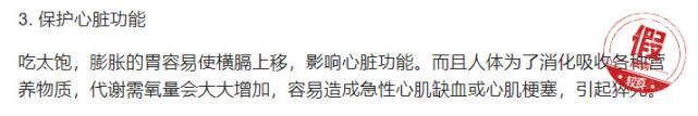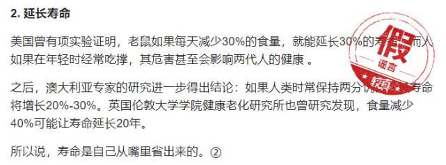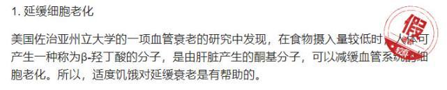 最近,自媒体文章《吃得多,确实死得快》流传甚广。文章不仅引用了动物实验结果,还引用了知名专家语录,言之凿凿地宣称“食量减少40%能延长寿命20年”。事实真是如此吗? 一、没有证据能证明“适度饥饿有助于延缓衰老”,β-羟丁酸只是人饥饿时的备选供能物质,长期过量富集可导致酮症酸中毒 自媒体文章截图首先,这个研究倒是真实存在的,发表在2018年末的《分子细胞(Molecular cell)》杂志上。该研究是为了探索对抗心血管疾病的方法,从延缓血管细胞衰老和死亡方面,来探究酮体的作用与潜在的机制。 第二,这个β-羟丁酸没什么神秘的,是哺乳动物肝脏分解脂肪时生成的酮体中的一种,是机体在缺乏葡萄糖(饥饿状态下)时应急用的“备选”供能物质。 第三,该研究是体外细胞实验和动物实验。研究员用酮体处理人血管细胞,并用未处理过的细胞作为对照,发现β-羟丁酸处理过的血管细胞死亡率显著降低。而后,他们又用β-羟丁酸处理小鼠,也同样表现出抑制血管细胞死亡的结果。 这意味着β-羟丁酸能减缓人类血管系统的细胞老化吗?显然不能。因为人体内环境较体外细胞培养的环境来说,复杂了不止一个数量级;老鼠和人类之间存在着物种差异,动物实验结果能成功在人体复现的少之又少;所以,把该实验结论作为“β-羟丁酸可以保护人类心血管”的证据,不仅过于草率,也没有支持力度。只有建立在人体上的大样本临床试验研究也得出同样的结论,才可下断言。自媒体所谓的“适度饥饿对延缓人体衰老有帮助”实则站不住脚。 第四,对于自媒体的胡诌,网友万不可轻信。因为长期过量的酮体富集于人体,会导致酮症酸中毒,表现为恶心、呕吐、腹痛、脱水、呼气短促、呼吸异味、精神状态异常等疾病症状。臭名昭著的减脂餐——生酮饮食,就是利用饥饿之下机体选择性消耗体脂肪(产生酮体)这一原理去达到减肥的目的。但结果往往是,减肥不成反而还搞出了营养不良的问题,甚至是肝脏、肾脏、胃肠道和精神方面都出现了问题。并且临床医生都在为避免糖尿病人发生酮症酸中毒做努力,为的就是对抗包括β-羟丁酸在内的过量酮酸对人体造成的危害,健康人又何必刻意给自己制造这样的致病条件呢? 二、老鼠实验结论不能直接应用于人类,其它的引用研究查无可循,且有逻辑漏洞 自媒体文章截图其实美国的这个老鼠实验不需要细究,因为现存很多动物(包括果蝇、老鼠、灵长类动物等)实验都已验证了一个事实:和随便进食的对照组动物相比,减少20~50%能量摄入的实验组动物能够显著延长寿命。 但是,第一,如前述,这是动物实验中得到的结果,不能直接套用在人类身上。 第二,这些动物的平均寿命均远远小于人类,所以不能确定给人类长期(50~80年或更长)按照某一种限制能量摄入的饮食模式会不会有负面作用。 第三,这些动物实验考察的都是限制能量摄入对于生存寿命的影响,这不等于对健康寿命,也就是保持无疾病状态时长的影响。2018年发表在《生物学通讯(Communication biology)》的一个研究就指出,虽然限制能量(总能量减少30%)能增加狐猴的寿命,但是却使它们大脑中的灰色神经组织减少,影响了大脑的完整性。 所以,人类真正想要的“健康长寿”,可不是随便“延长寿命”那么简单,更何况还不知道这种方法是否真的有用,千万别“续命”不成,反被“短寿”了。 至于自媒体引用的澳大利亚专家的研究,由于给出的细节太少,笔者没有找到相关文献。但仅就其文字描述而言,让人存疑之处就非常明显:两分饥饿是什么?要如何量化?试验选取的人群是哪些?样本量有多少?干预时长是多少?寿命增加20~30%是以什么年纪为基准?可惜,这些基本信息自媒体只字未提。 文章引用的英国伦敦大学的研究,不仅存在同样的问题,一旦有人相信并那么做还非常危险。以一个健康人为例:老李,男,60岁,身高175厘米,体重65公斤,每周运动150分钟。那么可以估算出,他每日的静息代谢为1450大卡,运动消耗300~500大卡,也就是说,他每日的基础能量需求为1800~2000大卡。如果食量骤减40%,就相当于每日供能减少40%,大约只有1080~1200大卡,这连老李的基础代谢都保证不了,也许饿一两天问题不大,长期下去必然会发生营养不良等一系列问题,何谈延长寿命? 三、人在饱餐之后,横膈不会影响心脏功能;消化过程的确会加重心脏负荷,对于老年人和有心血管基础病的人,有可能导致餐后心绞痛或心肌梗塞 自媒体文章截图下图中的红色区域就是横膈。它是一块骨骼肌,横在胸腔和腹腔的交界处,在肺和心脏的下方,能进行收缩以辅助呼吸。横膈的下方是胃,当人体进食后,它能辅助避免胃中的内容物向上返流到食管中。自媒体文章中“横膈上移影响心脏功能”看似以此为依据,但其实经不起推敲。 图中红色区域为横膈对于大部分正常人来说,饱餐后的胃虽然体积会变大,但由此带来的横膈临时上移并不会对心脏造成多大影响。举个例子,孕妇孕育胎儿要9个多月,随着腹中胎儿的长大,内脏器官也会逐渐被压迫,导致它们被挤得不在其位(包括横膈),但是临床上并无因此出现心脏功能异常的病例,就更别说只是日常进食了。 但是,机体确实有可能为了消化吸收营养素而诱发心肌梗塞,因为人体消化吸收的过程会增加心脏负荷。人进食后,血液会集中灌注到胃和小肠,为了维持机体其他部位的供血量以及正常血压,心脏会跳得