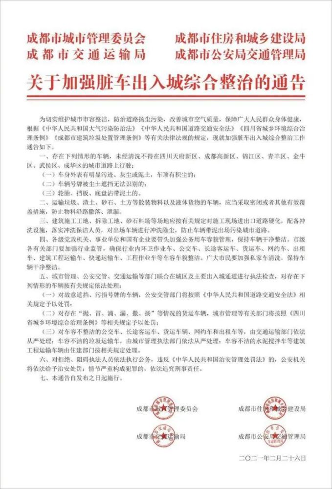 洗车靠天是不少车主的美容观念,不过这些车主恐怕以后没法开车去成都了。 因为从现在起,成都将禁止未经清洗的“赃车”进入成都都5+2区域城市道路上行驶。 这份名为《关于加强脏车出入城综合整治的通告》是由成都市城市管理委员会、成都市住房和城乡建设局、成都市交通运输局、成都市公安局交通管理局四部门联合发布的。 具体《通告》的部分内容如下: 一、存在下列情形的车辆,未经清洗不得在四川天府新区、成都高新区、锦江区、青羊区、金牛区、武侯区、成华区的城市道路上行驶: (一)车身外表有明显污迹、灰尘或泥土,车顶有积尘的; (二)车辆号牌被尘土遮挡无法识别的; (三)轮胎、挡板、底盘沾带泥土的。 二、运输垃圾、渣土、砂石、土方等散装物料以及液体货物的车辆,应当采取密闭或者其他有效覆盖措施,防止物料沿路撒落、泄漏。 三、建筑施工工地、拆除工地、砂石料场等场地应按有关规定对施工现场进出口道路硬化,配备冲洗设施,落实冲洗保洁人员,对出场车辆进行冲洗除尘,防止车辆带泥出场污染城市道路。 现在去成都开洗车店还来得及吗? 作为扬尘污染大户的工程运输车时刻保持车辆清洁无可厚非,目前国内大城市的施工工地都会在水泥搅拌车、碴土车出厂时做到彻底的冲洗,保证尽量少的扬尘和淤泥带出工地。 不过此通告中,针对私家车的“仪容整洁”倒是有些出人意外。我想作为车主应该都知道,国内空气灰尘比较普遍,要时刻保持车辆干净并不简单。就拿上海为例,如果停车都在地下车库,那一般能保证一周到半个月无明显灰尘。如果停在室外,那一般只能保证3天无明显灰尘。如果遇上雨天,等雨停后车身四周就是一圈泥灰。 成都作为内陆城市,又处于盆地位置,本就不利于空气的疏通,空气污染也相对严重,那么新规如果严格实施的话,对于成都市区的洗车店将是一大“利好消息”,洗车涨价也不是没有可能。 脏到什么程度才不能上路? 成都这项新规中说到:车身外表有明显污迹、灰尘或泥土,车顶有积尘的;轮胎、挡板、底盘沾带泥土的车辆属于未经清洗的赃车。但针对污迹、灰尘、泥土的定义都没有明确判定标准,会给交警的判罚带来一定的麻烦。新规立即施行后,“赃车”车主和交警的一番口舌之争看来也是难免。 环境保护和城市仪容怎么平衡? 另外有意思的是,成都最近几年针对洗车店都有严格的环境影响评价,控制新开洗车店的数量,并叫停了许多没有环评资质的传统洗车店。而新规实施后为了保证车辆的干净整洁,车主对洗车的需求会有明显的增长。 一边是洗车的废水对水质造成污染,另一边是覆盖污迹灰尘的汽车给城市仪容带来影响。看似矛盾的两个事情应该如何共存?