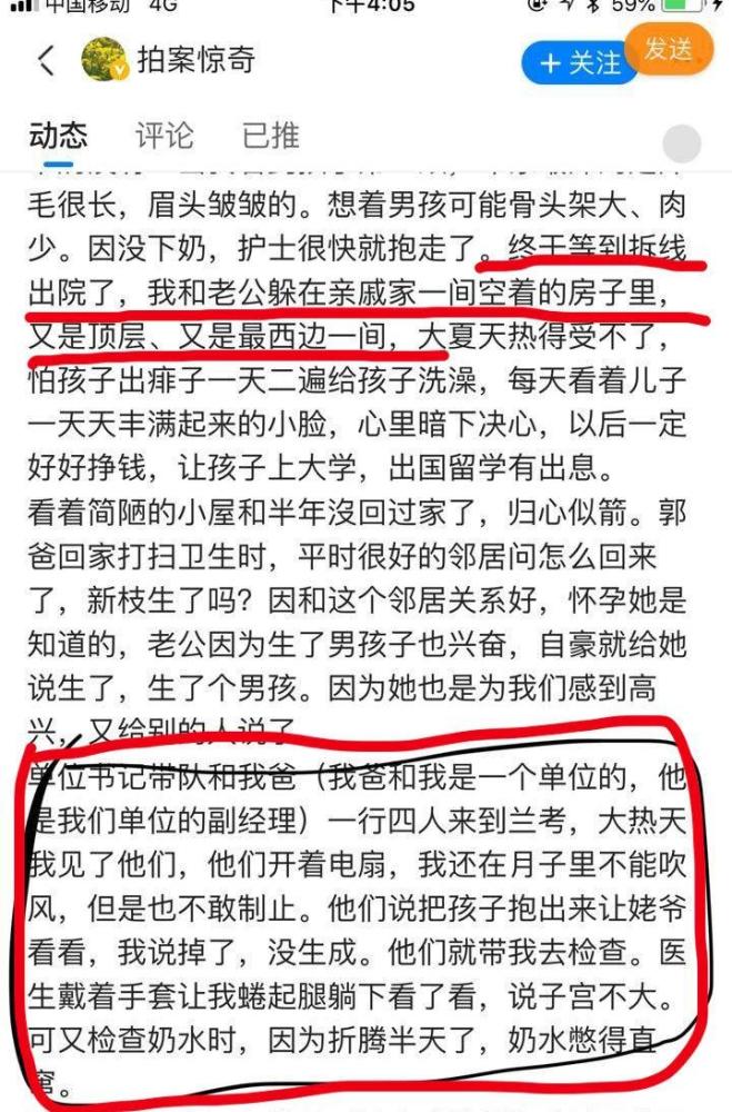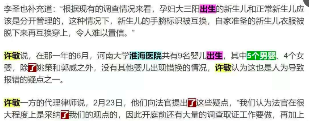 许敏还在查找真相,为自己为姚策为郭威查找真相。想要查找真相,就不得不从目前暴露出来的疑点开始,只有疑点查清楚了,才能有助于真相的查明。 到底是错抱,还是“偷抱”? 我们需要盘点一下杜新枝和医院有关的疑点,尽管说杜新枝查找真相的诉求已经结束了。但是,许敏这边查找真相,肯定也是离不开杜新枝的,毕竟是他们两个人生的孩子发生了错换。 因为是在医院错换的,所以,也和医院有关。 1、杜新枝到底有没有准生证,为何会有两种不同的说法? 以上是第一种说法,面对两家媒体的询问,杜新枝直接说没有准生证,没有准生证上不了户口,所以,95年准生证下来了,给郭威上了户口。 后来直播时又说有准生证了,这是在二审之后,医院答应承担姚策的住院费后,进行的一场直播中说的。 为何和前面的不一致? 当年没有准生证就不能进入三甲医院生孩子(没人敢收),但是,杜新枝却做到了。考虑到她认识郭希志,这一次改口有准生证,是不是和熟人郭希志有关系呢? 尽管之前我们推测过,杜新枝应该是有准生证的,但是,也仅仅是推测。这个疑惑也只有杜新枝能够给解开,至少当年有没有准生证,她是最清楚的。 2、郭希志是熟人,杜新枝的孩子错抱了,事发后杜新枝有没有找郭希志算账? 一般来说找熟人办事,是从安全上考虑的,杜新枝生孩子时,医院里有认识的熟人郭希志,这种情况下,不管是孩子,还是大人,都应该被更好的照看的。 可是,杜新枝生的孩子还是发生了错换。按理说有熟人的情况下,知道发生了错换后,得找这个熟人算账,怎么就在我的孩子身上发生了错换,是不是想要打击报复我? 更何况郭希志就是当年杜新枝的护士,按理说杜新枝知道孩子错换后,应该找郭希志算账才对,怎么当年就弄错了呢? 可是,庭审的时候,郭希志竟然没有出庭,也没有报道出和郭希志相关的信息。 3、杜新枝住院时怀孕39周了,婴儿脐带绕颈,为何在医院待了8天才剖腹产? 我们之所以有这个疑问,是因为剖腹产只要足36周就可以了,婴儿脐带绕颈的情况下,更应该足月就剖,而不是在医院待8天,等到41周的时候。 关键是给杜新枝剖腹产的郑引医生,还发表过婴儿脐带绕颈的论文,在这方面很专业。 郑引医生的论文上,也是写着婴儿脐带绕颈足月就可以剖腹产了,杜新枝住院时已经怀孕39周了,住院8天在41周的时候选择剖腹产的。 再结合许敏和律师在医院查找的这个数据: 所以,很有必要查清楚这个疑点。医院里那几天的孩子本来就不多,一家三甲医院,真的不应该犯这样的错误的。 4、杜新枝住院时有没有乙肝大三阳,目前医院没有留下书面证据(关键部分缺失了),庭审的时候,是杜新枝弟弟作证说她怀孕前有的。 若是有乙肝大三阳,医院不知道而是隐瞒了,生的孩子按正常生的孩子处理的,这种情况下,可能和健康的孕妇生的孩子放在一个房间。 若是医院知道杜新枝有乙肝大三阳,婴儿就应该和健康孕妇生的孩子分开,也不可能和郭威发生互换。 所以,当年杜新枝到底有没有隐瞒乙肝大三阳,这个也是很重要的一个点。 5、郭威生下来3500克,姚策3200克,即便是手环脱落了,两个孩子分不清了,重量称一称,就知道是谁的孩子了,按理说也不应该错抱? 当然了这个是需要调查医院的, 孩子的双手都带着手环,穿着自己家的衣服,按理说错抱的可能几乎是没有的。 但是,为何就错换了呢? 6、发生错抱后,为何两个婴儿该打的针没有打错呢? 顺产的郭威不需要打青霉素,剖腹产的姚策才需要。 本来错换后不知情的情况下,不该给许敏的孩子打青霉素的,但是,这个青霉素还是打在了姚策身上。杜新枝这边的婴儿本来是应该打的,毕竟她是剖腹产,但是,她生的孩子却没有打。事实上郭威也是不需要打的。 是不是不可思议? 7、许敏6月15号生的孩子,6月19号出院。生孩子后住院不到5天的时间,孕妇出院的时候,有医院工作人员核对孩子和孕妇信息是不是符合。只有完全核对好,才能让孕妇抱着孩子出院。 姚策和郭威互换了,两个孩子的重量不一样,为何层层把关还是没有发现错误呢? 8、杜新枝1985年生的大女儿(智残),1992年生姚策。这个时候的她是符合生二胎的,但是,出院后为何要躲起来。 躲起来还不说,还要告诉单位书记和探望自己的4个人,孩子没有生成,掉了。这个是最不可思议的事情了。 明明生了孩子,而且也抱着孩子呢?可是,为何要在这件事上撒谎呢? 9、为何要把92年生于淮河医院里的郭威,改为95年出生于驻马店计生站的郭威。 95年杜新枝明明没有生孩子,这个证明又是哪里来的?关键是之后的郭威都是以这个95年的出生信息,上的户口,办的身份证。 10、郭威为何从小就知道自己真实的生日? 若是不知道错抱,郭威应该过姚策的生日,杜新枝也是6月16号生的姚策,但是,郭威过的却是自己真实的生日。 这个消息还是跟踪报道错换人生一年有余的记者刘名洋透露的。 郭威的真实生日,到底是谁告诉他的? 11、淮河医院里的档案关于杜新枝的部分,为何会缺失、会填写错误、会有修改的部分。许敏的有关医生方面的记录丢失了。 12、淮河医院知道存在不排除人为错换的可能,为何不查明实情,就选择赔偿了,关键是赔偿的金额不低呀? 这些疑问都给捋顺了搞清楚了,也许,距离真相就不远了。不过,想要查清这些疑问,确实是有一点难度的。