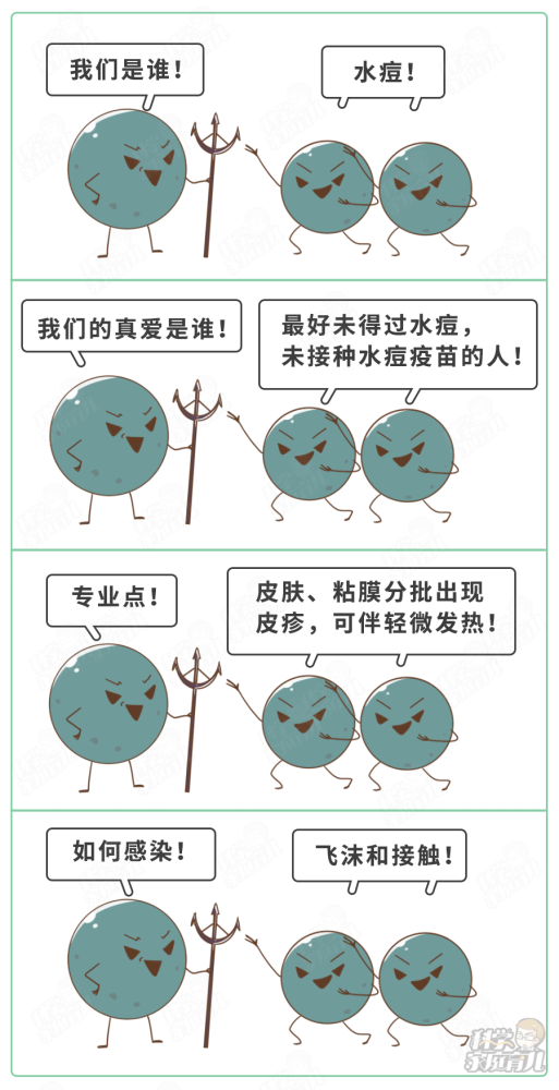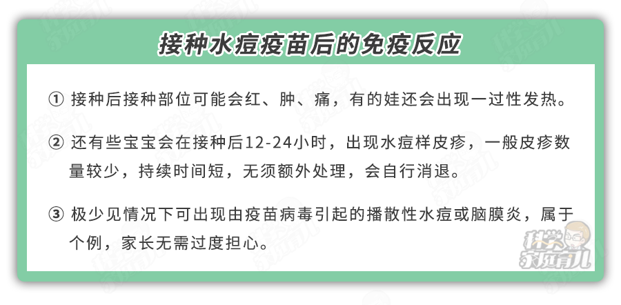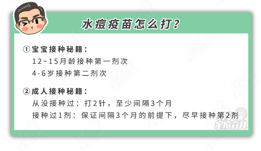 春季是出疹性疾病的高发期,尤其是水痘,传染性极强!一人得病,全家都能被传染! 而且儿童群体中1-14岁娃易中招,一般在发病24小时内即可出现皮疹。 出疹后,奇痒难耐,难护理,挠破容易留疤,特别容易影响娃的颜值! 最近在云南一中学就有学生得水痘后被居家隔离!这让不少家长和老师都担心不已。 图片来源:澎湃新闻 那娃得了水痘要如何护理呢?水痘疫苗要如何接种、打完疫苗还会被传染吗? 科大大今天就来教你击破水痘的防线,看它再敢嚣张害娃! 图片来源:科学家庭育儿原创 1 看图快速识别水痘真面目! 水痘是由水痘-带状疱疹病毒引起的儿童常见呼吸道传染病,冬春季高发。 未接种疫苗前,所有人都对水痘-带状疱疹病毒易感。 图片来源:科学家庭育儿原创 一旦被传染,通常会出现4个特征(水痘潜伏期通常为14-21天): 较大的宝宝和成人在皮疹出现前有发热、头痛、全身倦怠、恶心、呕吐、腹痛等前驱症状; 较小的宝宝则皮疹和全身症状同时出现。 典型的皮疹首先出现于头皮、面部或后背、臀部等,头面、躯干皮疹密集,呈向心性分布。 图片来源:科学家庭育儿原创 最初的皮疹为红色斑疹,逐渐变为丘疹和疱疹,最后结痂变成痂皮。 因身上同一部位会同时存在不同时期的皮疹,所以大家戏称水痘为“四世同堂”。 黏膜部位容易受侵,口腔、咽部、眼结膜、外阴、肛门等处会有疱疹出现,破溃后易形成浅溃疡。相信大家都会判断水痘了,科大大还要说说它的危害,水痘不及时治疗会影响肺、肝、肾。严重的会引发水痘脑炎、水痘肺炎、水痘肝炎、间质性心肌炎等,甚至危及生命。 而且水疱出现后,有明显痛痒感,抓挠会引发感染留疤,影响娃的颜值。 科大大要提醒大家,成人出水痘比儿童更严重,发烧热度更高、维持时间更长,感觉更疲惫乏力,水疱更多更痒。 所以,爸妈们在孩子得水痘时一定要做好防护,小心被娃传染! 那到底该怎么护理才能让娃快速痊愈呢? 2 水痘护理4招,赶紧学起来! 一般无并发症的水痘患儿是可以在家隔离,自我护理直至痊愈的。 家长们做好下面4点,能助娃早日恢复健康哦! 1、消毒隔离 孩子得了水痘必须隔离到疱疹全部结痂或者是出疹后 7 天为止。 家长要做好日常消毒,保持室内空气新鲜。 不与宝宝有直接的飞沫传播,不直接接触被水痘疱疹液污染了的床单、衣物、餐具、玩具。 图片来源:科学家庭育儿原创 2、皮肤护理 给娃穿柔软、宽松、轻薄的衣物,保持皮肤清洁,以免继发感染。 记得给宝宝剪短指甲或戴指套,避免抓破疹子。 图片来源:科学家庭育儿原创 疱疹破裂后,每日用安尔碘涂擦破损处,保持局部清洁干燥。 家长在给娃洗澡时动作要轻,用温水轻轻冲,别用沐浴露和润肤霜,擦干时用毛巾轻轻蘸干水分,避免碰破水痘。 口腔卫生也不能疏忽,早晚用生理盐水或漱口水清洁口腔,给娃吃清淡点。 3、用药护理 水痘是自限性疾病,约10 天左右自愈,无需特殊治疗,急性期卧床休息,补充水分和营养即可。 皮肤瘙痒时,可局部用炉甘石洗剂或 2—5% 碳酸氢钠溶液涂抹,禁用含激素的软膏。 图片来源:科学家庭育儿原创 对于可能出现或已出现并发症的宝宝,建议抗病毒治疗。 抗病毒治疗时多选阿昔洛韦,最好在48 小时内使用,疗程5-7天。 若出现了继发感染或并发症,要及时就医,治疗并发症。 4、病情观察 家长密切观察娃的体温、食欲、皮疹变化。 出疹后如有持续高热不退可给予对乙酰氨基酚退热,也可采用物理降温如温水擦浴,禁用酒精擦浴,以避免对皮肤的刺激。 图片来源:科学家庭育儿原创 科大大提示: 如果物理降温效果一般,家长一定要及时送医,尤其是3月龄以下的宝宝。 如果娃有呕吐、头痛、烦躁不安、惊厥、嗜睡等情况,也要及时送医哦! 宝宝出水痘后会终身免疫,不会再得水痘,但是还会得带状疱疹。 有些家长会错误地带宝宝去“主动免疫”,这种“主动免疫”的办法是万万不可的! 因为水痘痊愈后病毒不会被清除,病毒暂时留在颅或脊神经节,一逮到机会就会从神经节里出来让你得带状疱疹。 换句话就是,所有得过水痘的人将来都有可能成为带状疱疹的候选人。 图片来源:科学家庭育儿原创 那有没有什么好方法能预防水痘-带状疱疹病毒呢?跟着科大大往下看 3 水痘疫苗要打吗?这笔钱值得花吗? 预防水痘-带状疱疹病毒最有效手段当然是接种水痘疫苗,可有效降低接种儿童水痘的发病率。 尽早接种能武装儿童,保护家人,有利社会。 过去水痘疫苗只打一针,但研究发现1针不够,现在部分地区已经开始接种2针。 图片来源:科学家庭育儿原创 12个月龄以上的宝宝都可以接种,最好上幼儿园前接种完成,免得上幼儿园后传染上。 图片来源:科学家庭育儿原创 而且水痘疫苗是二类疫苗,需自费接种,但越来越多的城市逐步将水痘疫苗加入免疫计划。 目前北京、深圳、南京、嘉庆、杭州、青岛、常州、苏州等城市都可以免费接种。 不同宝宝接种水痘疫苗后的免疫反应不同,家长们可根据下图提示来应对哦! 图片来源:科学家庭育儿原创 家长要注意,抗体可不是接种后马上产生,而是接种1个月后才会产生抗体。所以接种完水痘疫苗依然要小心防范,不能掉以轻心。 图片来源:科学家庭育儿原创 科大大最后再提醒大家一点,打完了水痘疫苗之后在水痘高发季节也是可能会被传染上的。 因为水痘疫苗也不可能保证产生100%的保护力,尽量