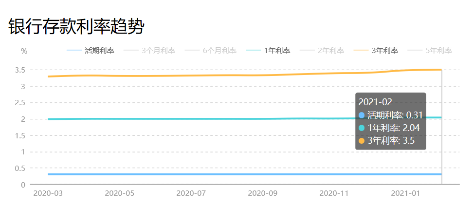 如果没有其它理财手段,是很值得存的,最起码比放在余额宝或腾讯理财通里的收益多多了。如果有其它理财手段,且收益比这更高、风险也差不多,那就不值得存。 从现在银行利率走势和按月付息两方面,咱们来聊聊”为啥值得存“。 01银行利率走势 下图是从2020年3月至今的银行存款利率趋势图。 从图中,我们可以看出: 在2021年2月份,银行的活期利率在0.31%左右;一年期定期存款的利率在2.04%左右;三年期在3.5%左右。所以,从这个角度来说,三年期定期存款利率在4.96%的产品已经非常稀少,也是很值得存的。 02按月付息 最值得存的理由其实是“按月付息”。因为银行每付一次利息,实际使用我们的资金就变少了。相对应的,我们存款的实际利率就会变得更高。 举个例子。比如在2021年4月,我们开始定期存款,金额为1万元。为了计算方便,假设银行每月付给我们利息100元(实际上没有这么高)。 4月份付息100元后,因为4月用我们的钱是1万元,那么月利率=100/10000=1%,年利率就是12%; 5月份又会给我们付利息100元,但因为银行上个月已经给了我们100元,所以实际上,银行在5月份只用了我们9900元的资金。 那么,5月份的实际月利率=100/9900=1.01%,年利率就是12.12%; 以此类推,6月份的实际月利率=100/9800=1.02%,年利率就是12.36%; …… 第36个月,即2024年4月份,银行此时已经付给我们了3600元的利息,所以它的实际月利率=100/6400=1.56%,年利率就是18.75%。 利息不变,银行使用我们的本金却越来越少,存款利率自然就越来越高,这就是“按月付息”的威力。 与之相对是,很多人经常使用的银行或余额宝的“分期付款”功能。看起来手续费很便宜,但实际上我们付出的利率会变得越来越高。 如果有一天本金还完了,利息还没付完,那我们付出的利率就是无穷大的,因为本金为0,即“利率=利息/本金”中的分母为0。 不过,在定期存款之前,需要注意一点:资金的流动性。因为如果在到期之前取出,有的银行会按照活期利率算,有的则是靠档计息。 什么是靠档计息呢?比如我们本来要定期存款3年,但在2年半的时候,因为急需用钱不得不取出,那么利息的计算就会按照“2年期定期存款利率+6个月的活期利率”来算。 03存款小技巧 除此之外,存款时还有两个小技巧也可以提高存款利率: 一是在季度末或年末存款的利率会高一点儿。因为在季度末或年末时,银行需要盘账,揽储压力比较大,所以就会稍微提高利率来吸引人们存款。 二是在城商行或农商行的利率也会更高一点儿。因为相比于国有五大行,不论是营业点还是服务、信誉度等,地方银行都跟不上,所以不得不靠高利率吸引人们存款。 5 Q8 A) B7 N3 ?' [