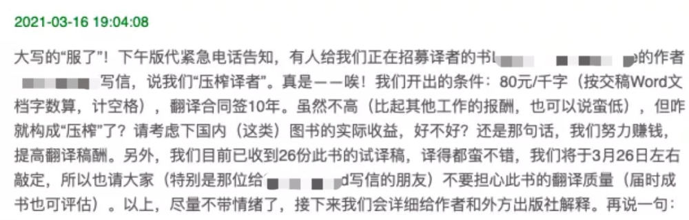 三月初,某专注于人文社科类丛书的出版品牌公开招募译者,开出的80元/千字翻译稿费被网友指责为“压榨译者”,甚至有热心人士直接给原著作者写了邮件“告状”。对此该出版品牌的编辑在豆瓣“直喊冤枉”,80元/千字实属业内平均水平。于是,一场关于译者稿费是否过低、为何出版业从业人员“人人哭穷”的讨论在豆瓣和微信两个舆论场相继展开。 豆友的广播引发了关于译者稿费是否过低、为何出版业从业人员普遍清贫的讨论。 紧接着,在3月15日国际消费者权益日,一篇聚焦盗版书销售现状的调查报道一石惊起千层浪,用准确的数据、扎实的求证把困扰众多出版社已久的盗版书问题摆在了台面上:按标价三折或四折就能买到的书籍,十有八九都是盗版书,所有商家,除了出版社自营店之外,几乎全是盗版书商。但有的评论却认为盗版书只侵犯了知识产权,并不属于“假货”,不符合“假一赔十”承诺,无论是出版社还是读者维权都难上加难。可谓“盗版如山倒,维权如抽丝。” 人文社科类图书出版的症结到底出在哪里?为何一旦此类争论出现,“用爱发电”便总是成为最后的解决方案?知识无价,但书籍再高尚归根结底也是一种在市场自由流通的商品,在情怀之外,出版行业能否找到一条可持续发展的商业逻辑?新京报记者采访了多位出版业责任编辑、营销编辑以及作者、译者,试图进一步厘清这些问题。 采写丨肖舒妍 面对译者和编辑“哭穷”、盗版书商却赚得盆满钵满这样冰火两重天的局面,我们首先要意识到,这两个语境中作为主角的书,本就不完全是同一批。 撇开作者自费出版或是学术基金资助的书籍不谈,一本面对图书市场、面对大众读者的书,也可分为畅销书和长销书——如网络小说、商业成功学或明星作者类书籍,便妥妥属于畅销书,自带“爆款”基因,根本不愁销量、不愁利润,哪怕在盗版冲击之下,出版方和作者也稳赚不赔。而人文社科类的学术书籍则多属于长销书,他们带有一定阅读门槛,本身受众群体有限,很难像畅销书那样一售而空,但他们所蕴含的学术理念或文学品味却不会过时,一代又一代的读者都能从中有所收获,因而能细水长流,甚至不断再版。但如果一本书籍本身内容糟糕或受众范围过小、翻译水平极低,则会沦为滞销书。 不过,长销书和畅销书之间并非泾渭分明,例如早前的《乌合之众》或近日的《棉花帝国》,原本属于较为小众的学术类长销书,却因为某个事件的推动、某位名人的推荐,一时间洛阳纸贵,一跃成为畅销书;而畅销书也可能因为观点过时、明星过气而被迅速取代,昙花一现后成为滞销书。 让自己手中的人文社科类书籍成为畅销书,这可能是每个编辑、译者的梦想。但残酷的事实却是,爆款类学术书可遇而不求,多数人文社科类图书还是销量有限,不求大赚,只求不赔。译者哭穷,编辑“头秃”,精打细算的读者在电商平台上凑够了满减还嫌书贵,转而投入盗版书的怀抱。 在作者、译者与出版方、读者构成的出版业闭环中,每一方能够做出怎样的努力来改善目前的困局呢? 译者: 稿费可以随着物价一起上涨吗? 首先来算一笔账,80元/千字的稿费,翻译一本20万词的英语书籍(由于稿费是按翻译完成后的中文字数计算,假定翻译后字数无大幅变化),所耗时间大约一年,译者最终能得到的稿费是1万6千元,平均每月1333.33元,甚至不够普通城市一个月的房租。 在这种情况下,译者显然无法仅靠翻译书籍维生。出版社编辑吴思博表示,她几乎没有遇到过专事图书翻译的译者,大多数书籍翻译靠高校教授、外语系学生或者纯粹爱好者兼职完成,在部分高校的外文学院,译作可以算入学术成果。但更多时候,翻译这项又苦又穷的工作确实只能“用爱发电”,靠译者的一腔热血维系。 与之对应的是,在四十年前,图书翻译还能给译者带来一份体面甚至富裕的生活。俄语翻译家蓝英年曾告诉新京报记者,1983年他翻译《日瓦戈医生》一书时,人民文学出版社开出的稿费是14元/千字,而其他书籍的稿费也在10元/千字上下。当年的正常工资水平在50元左右,这意味着,译者只需每月翻译5000字,即能维持日常生活,每月翻译1万字,就能步入“大富大贵”。 蓝英年译本《日瓦戈医生》 四十年过去,物价上涨了100倍,稿费却只增加了不到10倍。当然,这种比较如果脱离了时代背景则会显得毫无意义。在80年代、90年代,无论是知识还是书籍,都具有一定的“垄断性”,精通外语、能做翻译的译者人数有限,在市场上流通、可供读者购买的书籍也有限,一本书的销量和译者的收入都能有所保证。因此,诺贝尔文学奖得主帕斯捷尔纳克的长篇代表作《日瓦戈医生》,在当时绝对是一本畅销书。 如今翻译工作的门槛不断降低,各种语言译者的数量也不断增长,与此同时书籍品类大幅增长、平均销量下滑,在目前微薄的人文社科类书籍利润之下,出版方确实无法负担译者稿费的增长。译者的收入只能随着通货膨胀一缩再缩,图书翻译这项工作的重要性、严肃性也随之淡化。 目前,不少出版社和译者签订的都是一次性支付基本稿费的合同。曾有译者向新京报记者表示,他在交稿之后,甚至没有得到出版社出版书籍的通知,等他自费购买样书之后,才发现自己的译文被出版社单方面修改得面目全非、错漏百出。交稿之后,对于自己苦心培育出的“孩子”,他便不拥有任何决定权和发言