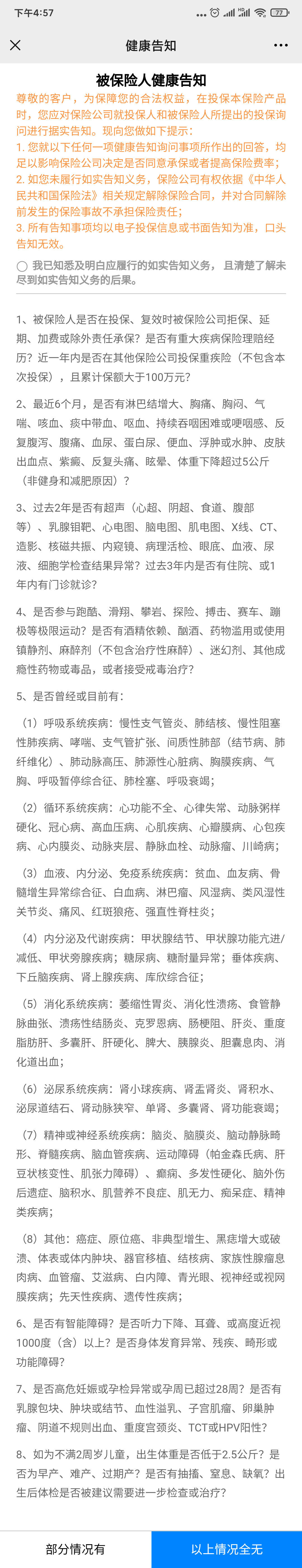 进入保险行业7年来,经常听到一些奇葩糟心事,套路最多的是保险中介不专业、不靠谱,一方面是花了冤枉钱产品不适合自己,另一方面还可能遇到更糟心的事——拒赔。 我在深圳一家比较知名的保险代理公司从事过一段时间,这家企业已经非常注重销售人员的专业能力和后期的理赔问题。 与坊间流传的“保险两不赔,这也不赔,那也不赔”的传闻不同,在协同理赔案件时,保险公司会尽可能的本着能赔尽赔的原则进行赔付。 不过还是有很多人疑惑,那为什么还有不少的拒赔例子出现。 于是我找到一些做理赔的朋友咨询,同时在网上收集了一些资料。 其中一份资料引起了我的注意,据江苏银保监会一份资料数据显示:52%的拒赔,是因为被保险人没有如实告知既往病史;27%属于条款约定的除外责任,剩下12%属于不符合条款约定的保障范围。 一、为什么购买保险一定要如实告知病史 今年1月保险新规生效,很多人赶在去年年底投保,但是不少人被挡在了核保这个阶段。 想要买自己心仪的保险,核保可能有问题怎么办? 自己的客户核保可能不能通过怎么办? 不专业的保险中介加上小白的客户,瞒报漏报既往病史的情况就容易出现。 买保险应该注重哪些环节? 有朋友说,保险客户对价格、保障服务、理赔问题了解的很清楚,然而对核保不重视,甚至有人刻意隐瞒既往病史,认为给保险公司说了自己曾经得过什么病是一件坏事。 我们来看一个例子,就知道核保有多么重要了。 相x宝目前全国投保的人数接近1亿人,加上引入投保人陪审团机制,赔付和拒赔的问题,在这个平台上就会被无限放大。 事情的经过是这样的: 2018年唐某某加入相x保,意外摔伤导致双股骨折,陷入深度昏迷,满足重疾理赔标准。 按照他的情况来算,可以领取10万互助金。 但是,他在加入相x保时,并没有满足其中一条健康告知:唐某某长期服用激素类药物,不满足两年内无连续服药超过30天的要求。 所以,被相x保拒赔了。 二、不重视核保,保险可能白买,被拒赔的风险巨大 虽然中国的保险中介行业已经有了很大的进步,大部分的中介或者保险代理会按照标准流程操作,但是我们自己对保险核保的流程和重要性很了解,买保险的坑就又少了一个。 一个保险产品好不好,比较容易分析,看价格、对比保障范围、看条款;但是保险有没有资格买,起决定因素的是我们的身体状况。 所以买保险的时候,某个保险我们有没有资格购买,代理人说了不算,只有如实核保才知道。 投保时有三个关注点需要重视:投保须知、健康告知、免责条款。 投保须知是对保险的基本情况告知,比如被保人年龄范围、等待期时间、犹豫期等 健康告知是相当重要的一步,把我们的健康状况告知给保险公司,保险公司依据这个来审核是否符合投保要求。如果近期有体检报告。一定要逐项核对填报。 最后是免责条款,这个条款是避免骗保,这些内容或者情况是不保的。 如今大部分保险产品都可以在网上进行智能核保,按照体检报告逐一填写,如果智能核保有问题,就会进入到人工核保阶段。 核保最好的情况就是正常投保,如果有一些问题是可能会要求加费承保,主要的影响是每年多收点保费,对以后的理赔没有影响。最坏的结果是被拒保,只能寻找其他产品替代。 投保前,要不要先做个体检? 像我这样稍微上了年纪,每次体检都战战兢兢的,深怕一次体检就改变了人生。 需要注意的是,体检对投保是有影响的。 特别是线上保险,基本上不会要求投保前体检,如果没有体检或者医疗报告,默认健康。 买保险前最好不要体检,买完等待期过后再体检,避免因为一些小问题导致保费增加或者被拒保。 当然,我们不能因噎废食,每年一次深度体检还是非常有必要的。