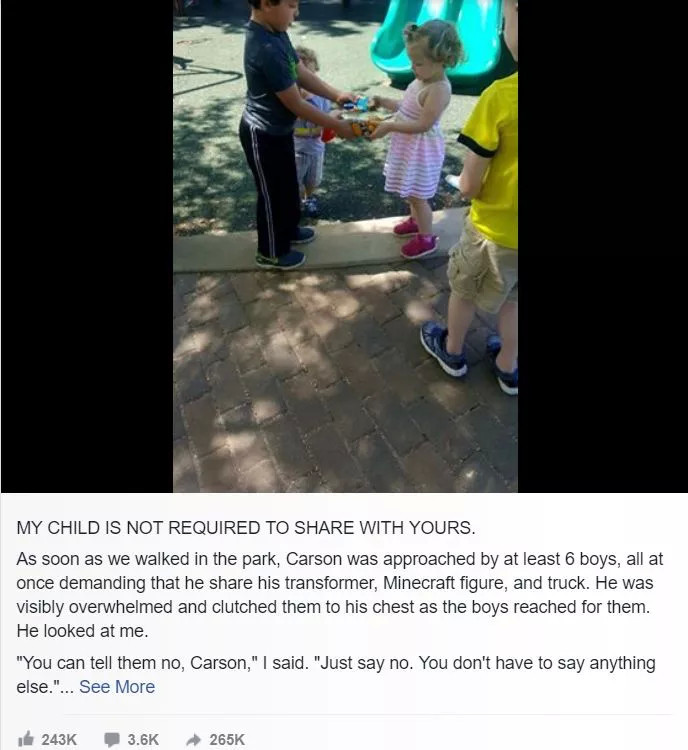 每个家庭或许都碰到过这样的难题: 别的小朋友想玩自己家孩子的玩具,别的小朋友想吃自己家孩子的零食,孩子怎么都不愿意。 我也曾看到过一个极端的情况,孩子老吃独食,不愿意别人吃自己家的东西。 一天,家里来了许多客人,妈妈洗好水果。 刚端上茶几,孩子把水果直接端走了。 妈妈很懊恼,她问我: 孩子怎么会这么自私? 要怎么让孩子更爱分享? 其实,这只是一个正常的发展阶段。 在这个阶段,更是需要父母智慧的引导,帮助孩子建立分享意识。 李玫瑾教授分享了自己女儿的一次经历。 春节期间,一家人看着电视。 她剥了一个橘子,女儿就在一旁眼巴巴等着。 可她没有立刻满足孩子,而是给了女儿一瓣,说: “给爷爷送过去。” 女儿看看手里的橘子,又看看她,眼里都是不舍,也挪不动脚。 李玫瑾严肃起来: “如果不给爷爷吃,我就不给你了。” 女儿没办法,给了爷爷,爷爷特别高兴,亲了他一下。 迈出第一步,尝到了甜头,女儿开始学会了分享。 紧接着,她给了奶奶、姑姑、爸爸。 李玫瑾手中只剩下最后一瓣橘子,她没有吃,而是给了女儿。 没想到,女儿拿起那一瓣,就搁到了李玫瑾嘴里。 李玫瑾及时反馈,说: “真乖!” 于是,又剥了一整个给孩子。 虽然是件小事,却包含了教会孩子有能力分享的重要因素。 想要引导孩子走出自我中心的状态,走向更宽广的世界,首先要学会这三个基础。 分享的前提,是物权意识的建立 学会分享,有一个前提,就是“物权意识”的建立。 什么是物权意识呢? 1岁的孩子,被抢了玩具,可能吓一跳,撇撇嘴,一会儿就忘了。 2岁的孩子,被抢了玩具,就可能开始动手,大哭大闹,演变成一场冲突。 这种变化并非是孩子变得自私了。 而是2岁以后,孩子有了“物权意识”,逐渐理解到“我的、他的、大家的”。 这时,孩子会开始说“我的”,比如他会觉得: 玩具是我的,零食是我的,妈妈是我的,爸爸是我的,全都是我的。 这是一个正常的心理发展阶段,不是成年人所理解的“自私、任性”等道德标准。 想要教会孩子分享,就从此开始。 ● 首先,我们也需要扩大孩子对世界的认识,理解“他的、大家的”。 李玫瑾谈到自己的孩子,5岁前后会和大人一块吃饭。 她给孩子立了一个规矩:“大人不动筷子,你就不能先吃饭。” 为什么这样做呢? 李玫瑾说,孩子4、5点放学,就开始饿了,可我们家吃饭一般在6点左右。 “饿”这个小小的痛苦,能帮助他体谅别人的痛苦。 同时,也能帮他意识到:我们是一个家,我们是一个整体,在心里面有“别人”。 后来,爸爸没回家时,孩子都会帮爸爸拨出一份饭菜。 ● 其次,我们需要帮助孩子捍卫“我的”。 林静的孩子刚刚3岁,小伙伴来家里玩时,一碰到他的玩具车,他“哇”一声就哭了,怎么哄都没用。 等孩子平静下来,林静问:“你为什么不想和他一起玩呀?” 孩子这才说: “我怕他玩了,不还给我,幼儿园就有人这样抢我的玩具,老师都说要分享,我才不要。” 你看,很多时候,孩子不是不愿意分享,而是总被成年人道德绑架着分享。 他们从没真正拥有过属于“我的”东西。 于是,在不安之下,更加拼命地抓住手中的事物。 其实,只有真正拥有过,才会主动分享给别人。 那,如何帮助孩子捍卫“我的”呢? 当孩子说“这是我的”,你就可以回应到: “对,这是你的。” 当你想吃孩子的零食,想玩孩子的玩具,你也需要尊重他,先征求他的同意: “妈妈也想吃,给我吃一口可以吗?” 想让孩子分享,先从拒绝分享开始 一位妈妈在Fackbook上谈到自己的一个经历: 当我跟儿子Carson走进公园的时候,至少有6个小男孩向Carson走过来。 而且都要求他将自己的变形金刚,乐高小玩偶和玩具卡车分享出来。 很明显,面对这些要求Carson有些不知所措,而且当那些孩子靠近他的玩具时,他还会把这些玩具护在胸前。 然后,Carson看向了我,显得很困惑。 于是,她跟儿子说: “Carson,你可以跟他们说不,只是拒绝就可以,其他的什么都不用说。” 当儿子说完后,其他家长向她摆出了臭脸,说他们“没礼貌”。 她仍旧坚定地告诉其他家长: “他不是必须要把自己的玩具分享出来,他已经说了不愿意。” 能够允许孩子拒绝分享,考验的不仅仅家长对孩子的尊重,还有家长坚定自我的勇气。 你会发现,很多成年人强迫孩子分享,不是因为他们认为“分享”是美德,而是他们怕丢了面子。 当孩子拒绝分享时,他们急于找回面子,通过指责、威胁、惩罚的方式强迫孩子。 比如:“你怎么这么小气啊!” 比如:“你怎么都不知道让让弟弟!” 再比如,不征得同意,就把孩子的玩具送人。 这就像同事走到身旁,拿起你的早餐吃了一口。 你一生气,他还说: “你怎么这么小气啊!这有什么大不了的。” 你气不气? 但“讨好型”的成年人,并没有勇气维护自己的边界,反而会说:“那你拿去吃吧!” 如果,你因为这种“我不想,但我必须”的讨好行为常常觉得憋屈。 那么你在教会孩子分享之前,要记得自己先学会拒绝。 如此一来,才有可能帮助孩子学会拒绝,不卑不亢地面对他人。 当孩子有权力决定是否分享,才有可能学会真正的分享。 而不是发展成为一种“讨好”的行为。 分享的基础:互利互惠 我曾经刷到一个短视频。 一岁半的小女孩独自面对面前的美食,被妈妈叮嘱“一定要等妈妈喔,等妈妈回来再吃喔。” 于是她乖乖坐在凳子上,等着妈妈回来。 可面前的零食实在太诱人了,她实在是太