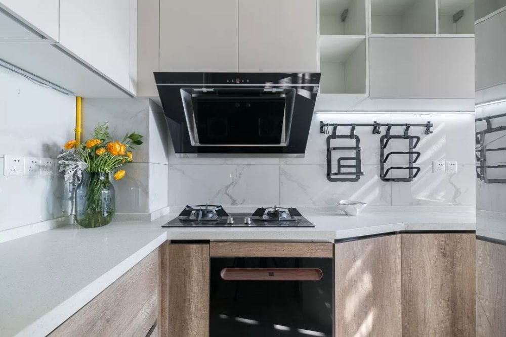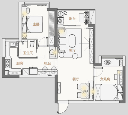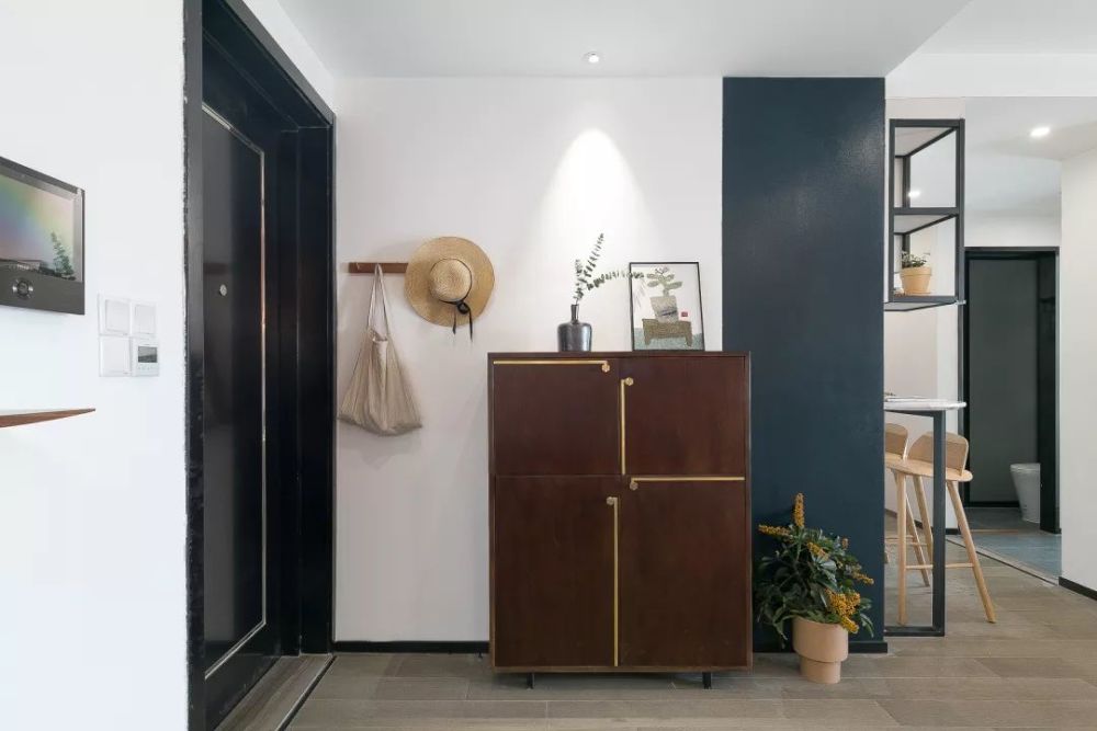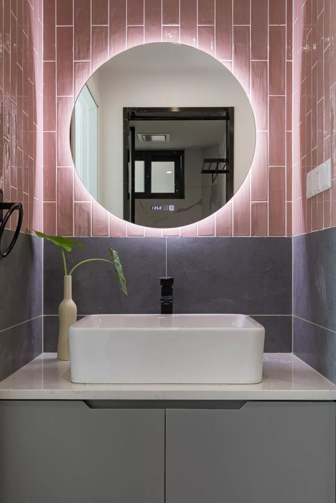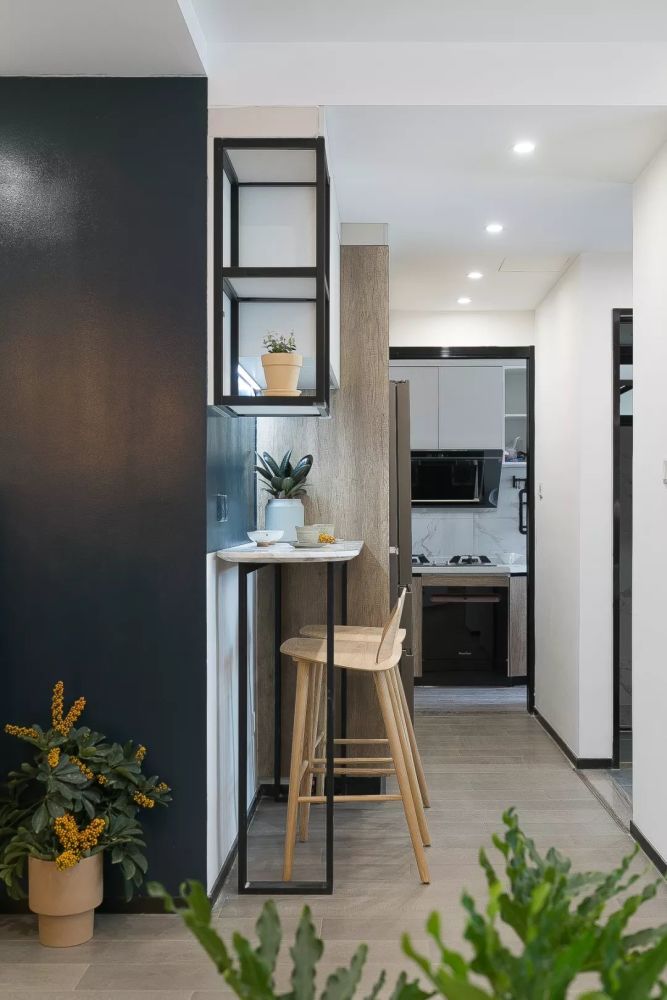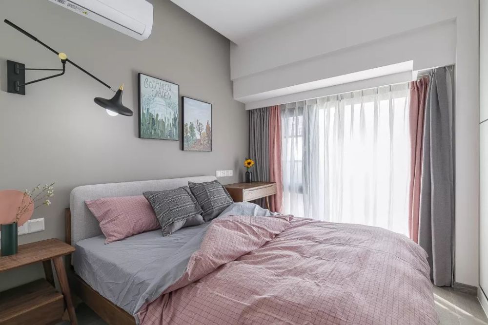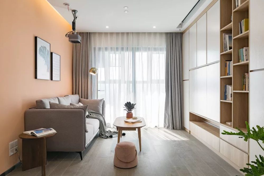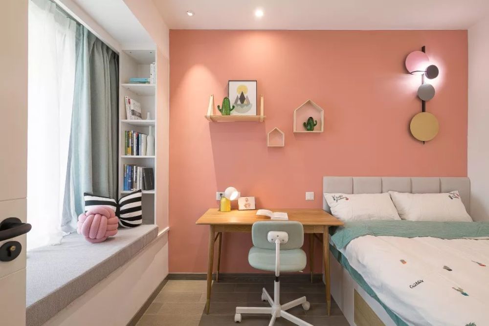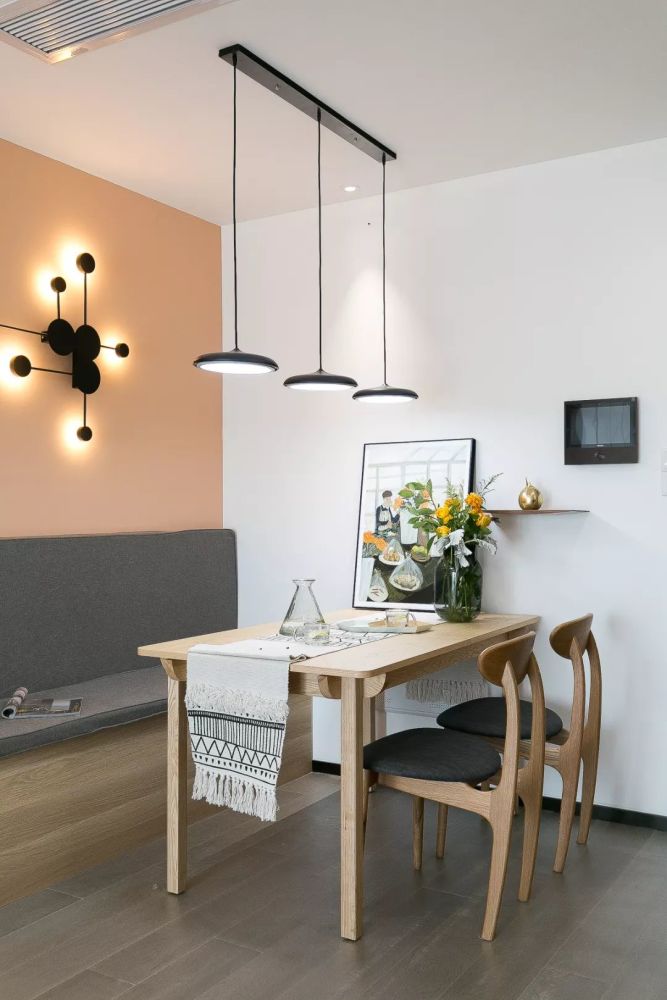 今天小编分享的是一套建筑面积76平的北欧风小户型二居室案例,设计师选择了用丰富的色彩来提升整个家的层次感,也让简洁的北欧风多出了浪漫、优雅等感觉。大胆的用色加上舒适的软装,整个家让人感觉轻松而又惬意。 平面布置图 入户没有玄关走廊的户型,设计师选择在入户门的侧方墙面做挂衣钩、摆放一个斗柜来方便日常使用,斗柜上的门把手非常有设计感。 在入户门的另一侧就是餐厅空间,卡座式的餐厅设计轻便又实用,橘黄色和白色的墙面交替,创意的吊灯和壁灯结合,让餐厅看起来很有格调感。 客厅处选择了舍弃电视的设计,把电视背景墙做成储物柜、书架,隐藏式的投影幕布满足观影需求。同样是橘黄色的墙面,在吊顶边缘留出藏光的设计,看起来更为时尚。 通往厨房的走廊过道也被充分利用了起来,一个迷你的吧台和置物架、黑板墙结合,显得很有文艺范。吧台边上做上柜子,也把冰箱给嵌入了柜子当中。 厨房内部的橱柜根据厨房的格局做了异型的处理,大理石的墙砖搭配木质的柜门,整个厨房看起来简约自然而又宽敞明亮。 主卧室的床头背景墙刷成了灰色,在窗帘和床品上加入了粉色作为点缀,让卧室更加优雅。一侧床头柜被梳妆台所代替,更利于日常使用。 儿童房的墙面是选择了更为浪漫、可爱的橘粉色,用隐藏的筒灯和壁灯来代替主灯,看起来更为简洁。书桌靠着床摆放,方便孩子平时学习。 卫生间选择了把洗手台给放在门外,这样平时使用会方便一些。粉色的墙砖和灰色的墙砖结合,圆镜加入了背光的设计,看起来层次分明。 卫生间内部的墙面铺贴了白色的大理石瓷砖,淋浴区和马桶之间加上了磨砂的玻璃门作为隔断,整个空间看起来明亮而又宽敞。