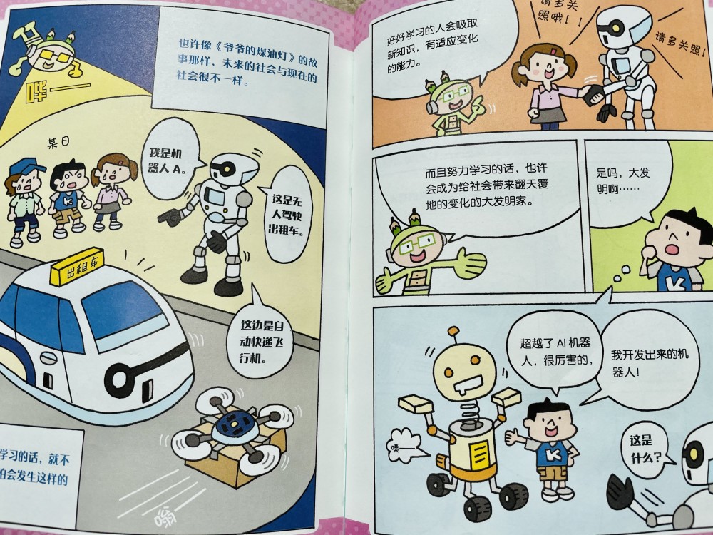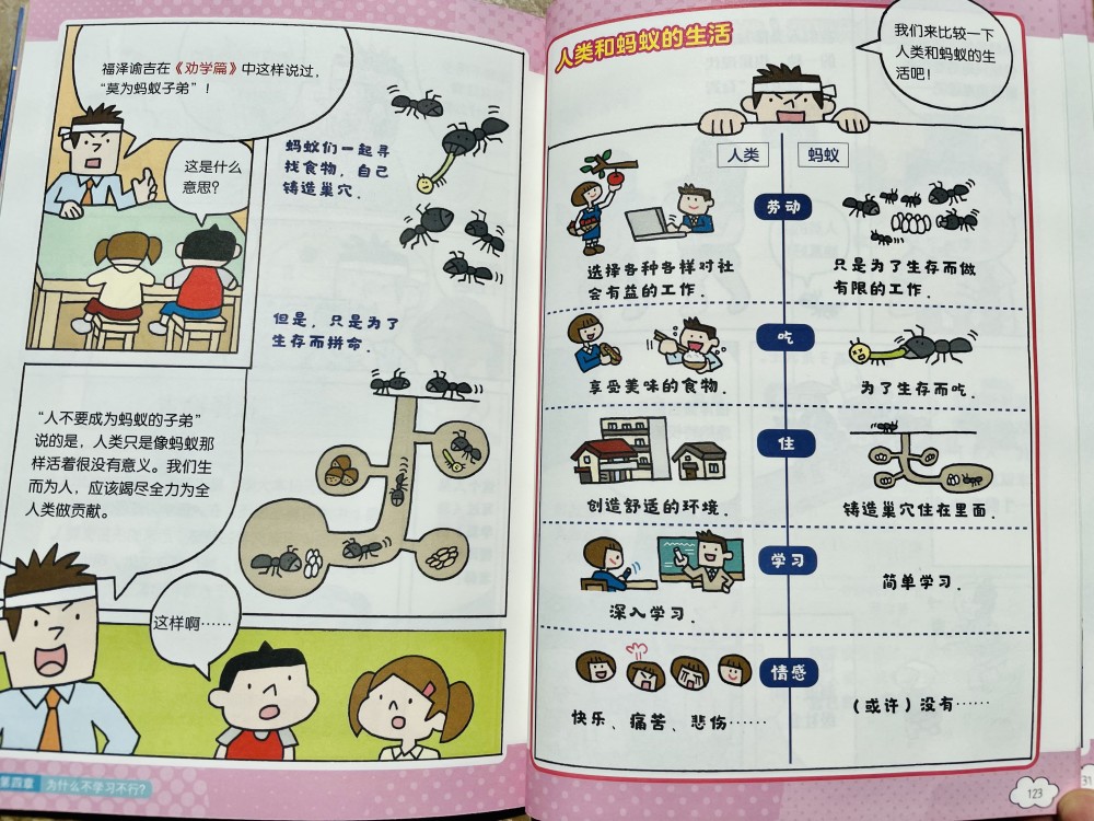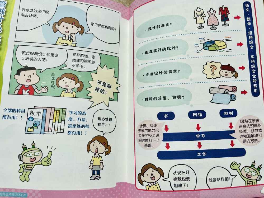 孩子在学习时会出现懈怠,不想学习。当我们要求孩子努力学习时,孩子会问“我为什么要努力学习?”遇到这种情况该怎么回答呢? 有家长这样回答:读书可以明理,可以使人的视野变得开阔,可以改变人的命运!道理讲得很好,但是孩子不明白理、视野开阔、命运背后的真正含义。 也有家长这样最通俗的回答:努力学习将来考上好初中,再考好高中,最后考上好大学,将来能找一个好工作。这个回答也不足以调动孩子的情绪,为什么要找好工作呢?我现在不是很好么,什么都不缺。 还有家长想让孩子吃点苦头,告诉孩子:不努力学习将来就去扫大街、捡垃圾。孩子却说,妈妈我们去捡垃圾吧,捡来的钱养你。看来,孩子也没有受到很好的触动。 好话不能说、坏话说不得,到底怎么让孩子感受到学习的重要性呢? 看了一本书叫做《不学习行不行?》,以漫画故事的形式介绍了关于学习的问题,其中一章专门讲到“为什么不学习不行”。看完之后很受启发,这些触动孩子的方式,才是最好的答案。 有幸成为人类,为快乐生活而学习 孩子喜欢和动物比较,羡慕动物不用学习,吃吃睡睡玩玩就好,想法虽然可笑,但这正是我们劝孩子学习的好机会。 我们可以对比一下动物和人的生活,让孩子了解本质区别,向往更有品质的生活。比如用蚂蚁和人类做对比。 从劳动方面来看,蚂蚁为了生存而做有限的工作,人类则是为社会做各种各样有意义的工作。 从吃饭方面来看,蚂蚁为了生存而吃,人类则是为了享受美食。 从居住环境来看,蚂蚁只能住在狭窄黑暗的巢穴里,人类则可以为自己创造舒适的环境。 这样对比来看,蚂蚁只是为了活着,而人类则有更多可能,学习会让我们的生活更加丰富多彩,可以玩乐、可以交流,想拥有怎样快乐舒适的生活,都可以通过学习去创造。 学习会让人实现梦想,开启美好人生 孩子可能认为,职业会遗传,父母从事什么职业,自己将来也能从事这个职业。孩子真的是太天真了,职业是不能遗传的,以后想成为什么样的人,只有努力学习这条路能走。 从另一方面来说,并不是所有的孩子都想成为父母那样的人,他们都有自己的职业梦想。想成为设计师、糕点师、作家、歌唱家等等五花八门。只要摸清孩子的梦想,就从这方面入手,和孩子交流。 比如孩子想成为一个服装设计师,需要了解设计的历史、现在流行的设计、将来设计的需求、面料的质量和价格。这些知识和语文、数学、历史、化学、美术等等都有关系,孩子在完成学校学习任务的基础上,还要通过书、网络来学习,并进行多次实践,才能实现梦想。 学习能够满足好奇心,帮助成长 孩子天生就有好奇心,喜欢问十万个为什么。植物为什么会生长,汽车为什么会在路上跑,“实验”这个词是什么意思。不管是实际物品,还是文学词汇,孩子都会感到好奇,想一探究竟。 我们不要直接告诉孩子答案,而是用满足好奇心的方式鼓励孩子努力学习。告诉孩子,所有问题,都可以在课堂上、在书上、在网络上找到答案,孩子会发现学习妙不可言。 当孩子了解得越多,好奇心就越强。就像打开了潘多拉的盒子,刹不住车。这个世界上有太多有趣的事情等着去探索,方法就是努力学习。孩子在这个过程中认识更大的世界,不断成长起来。 学习能让自己有用,适合社会发展 这个社会并非一成不变,而是在不断飞速发展中。如果固步自封,认为自己上了几年学,有些文化,就可以在社会上混了,那肯定不行。 以前通讯落后,人们通过慢悠悠的书信、电报等形式传递信息。现在通讯发达,依靠强大的网络瞬间就能取得联系。将来可能是人工智能的天下,没有足够的知识储备、没有强大的思维能力,可能会被机器人取代,自己将一无用处。 将来的竞争更加激烈,不仅要和人一比高下,还要和机器人同台竞争。不学习就落后,落后就要挨打,没有生存的空间。只有那些努力学习的人,才更有能力吸收新知识,适应社会发展,让自己成为有用的人。 上面只是总结了其中几个方法,还有更多让孩子感到有趣的方法,用图文并茂的方式展示给孩子。 同时,这本《不学习行不行?》介绍了20个学习工具图标、15个高效学习方法、6个学习窍门,很适合提升孩子的学习力。 B) ^- `/ z) ^/ C5 }7 G! d