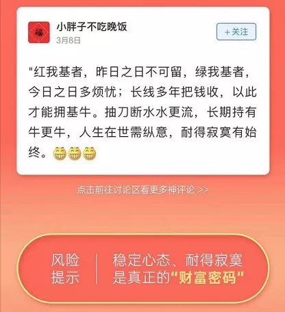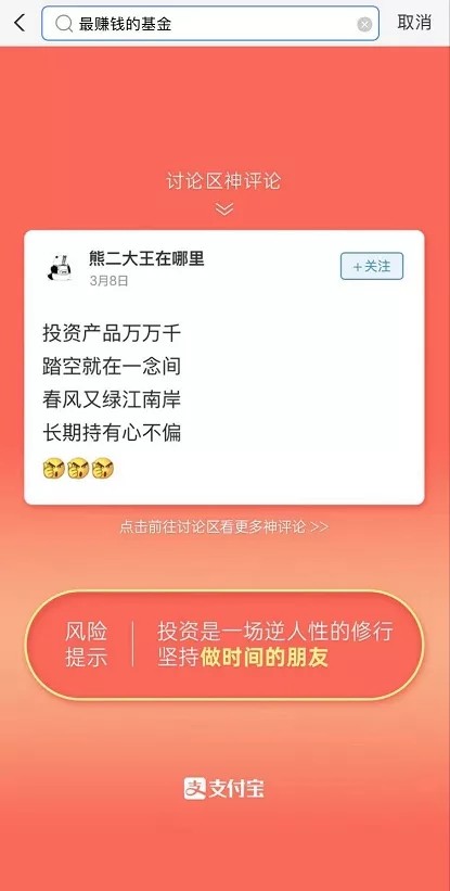 最近,各大基金公司开始密集披露年报。尽管大家都知道总会出现几家欢喜几家愁的情况,但几乎所有的投资者还是会寄希望于选购的基金能够一骑绝尘跑赢市场。相信这两天有不少投资者也已经因此更换了所持有的基金产品。 巧合的是,支付宝平台最近正好上线了一项新的投资搜索功能。有网友声称可以在支付宝首页的搜索栏以“最赚钱的基金”为关键词进行搜索。究竟是支付宝推出了基金产品的优化算法,还是网络传闻不足采信?带着好奇,笔者亲测了支付宝的相关搜索功能。 01 解密支付宝“最赚钱的基金” 打开支付宝APP,在首页上方的搜索栏录入“最赚钱的基金”,即可获得结果。但不同于大家的想象,搜索结果并不是给出某款具体的基金名称,而是弹出了一段网友评论。该段评论取自于支付宝话题广场“理财大诗集合”中的网友发言。“投资产品万万千,踏空就在一念间,春风又绿江南岸,长期持有心不偏”,文末支付宝还提示投资者“投资是一场逆人性的修行,坚持做时间的朋友“。 满满的文艺青年感觉有木有?反正笔者是被惊艳到了,相信这位网名为熊二大王在哪里的作者一定也非常满足吧。其实,不仅仅输入“最赚钱的基金”会有特殊弹窗提示,“内幕消息”、“零风险高收益”、“稳赚不赔”、“财富密码”等,都会有支付宝的风险提示,而且内容各不相同。 无一例外,这些弹窗文案都是来自于草根网友的民间智慧。一直以来,支付宝因为缺乏社交属性而饱受诟病。但是看到如此可爱俏皮又紧贴地气的风险提示,是不是不禁要多看几遍呢?反正笔者是一字不落的认真拜读了,估计有不少网友甚至萌生了自己也要创作一段风险提示的想法了吧。 体会了支付宝的用心良苦后,我们更需要反思为什么一家平台企业会有如此神奇的操作?其实,如果不是因为每天有大量投资者搜索所谓的“最赚钱的基金”和“零风险高收益”等关键词,估计没有谁会想到用这种方式来进行投资者教育吧。在之前的一期文章中,我们也曾披露了很多时候基民亏损和基金本身没有太大关联,而是输在了持有时间太短和频繁换仓上面。事实再次证明,国内的投资者教育工作刻不容缓。 02 怎样才能找到“赚钱的好基金” 经常使用线上方式购买基金的理财客户应该都比较熟悉基金的工具助手。基金排行、基金筛选、基金对比、省心定投、智能投顾等,都是基金用户们常用的赋能工具。虽然这些工具能使得我们更好地了解了基金产品,但却难以帮助大家透视人性。 用好定投工具 很多人听说基金投资收益回报高 ,就希望能够尽快实现投资收益。但往往购买的基金正好处于单边下跌通道,就急于割肉止损。其实,任何投资都会有风险波动,市场下跌也是压力释放的正常状态。对于正好处于下行通道的基金产品,完全可以借助定投方式来降低持仓成本。 现在不少初入基金市场的投资者,完全没有风险概念。觉得某只基金过往业绩较好,就把所有的资金全部投入进去。其实,完全可以借助一些智能定投工具,化整为零分散投资。这样做的好处,既可以避免短期内投入大量资金,又可以实现投资收益的相对优化。 做时间的朋友 过往事实往往证明基民想要实现投资收益,了解基金产品固然重要,克服人性弱点同样不可或缺。在支付宝的用户盈亏分析功能中就反映了同一款基金产品中,亏损客户和盈利客户的行为特征区别。而在其中是否长线投资基本成为了基民盈利与否的晴雨表。 以某款明星基金产品为例,过去一年实现了近乎100%的年化收益,但却有7成的客户处于亏损状态。究其原因就是,短线持有和追涨杀跌。而同样购买该款基金却能实现盈利颇丰的客户都秉持了长线投资、不随意买卖等行为特质。 舍弃暴富心态 “最赚钱的基金”名称非常吸引人,但是投资者需要知道,高收益的背后通常就是高风险。基金产品因为有专人打理,能在风险总体可控的情况下实现相对更高的收益,这也使其成了懒人理财的最佳选择。但是既然选择了通过基金经理代为投资理财,投资者们就应该充分相信他们的专业性和风控能力。 一夜暴富固然值得期待,但投资基金切忌短期致富思维。普通投资者更应该有风险意识,不要过度相信所谓的投资神话,迷恋于“零风险高收益”、“稳赚不赔”等舆论误导。 03 结语 支付宝平台的新玩法,可以帮助投资者搜索到“最赚钱的基金”。虽然最终投资者得到的只是“坚持做时间的朋友“这句忠告,但是相信这也是平台为了帮助投资者理性投资的无奈之举。希望以后类似的忠告出现的越少越好,更希望类似的搜索从此绝迹。