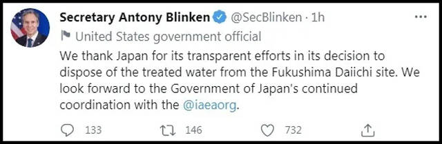 但美国媒体却再次陷入可怕的沉默。甚至,在社交媒体上大量的反对声中,美国国务卿布林肯还发了一条“画风清奇”的推特公开感谢日本。