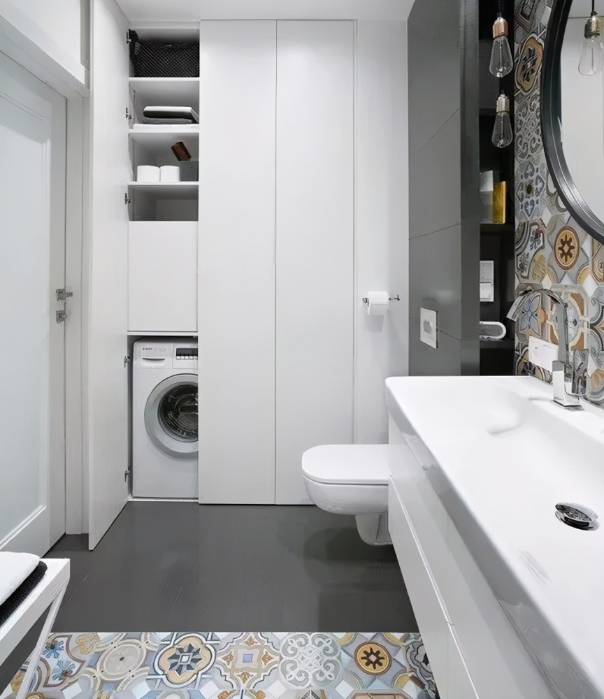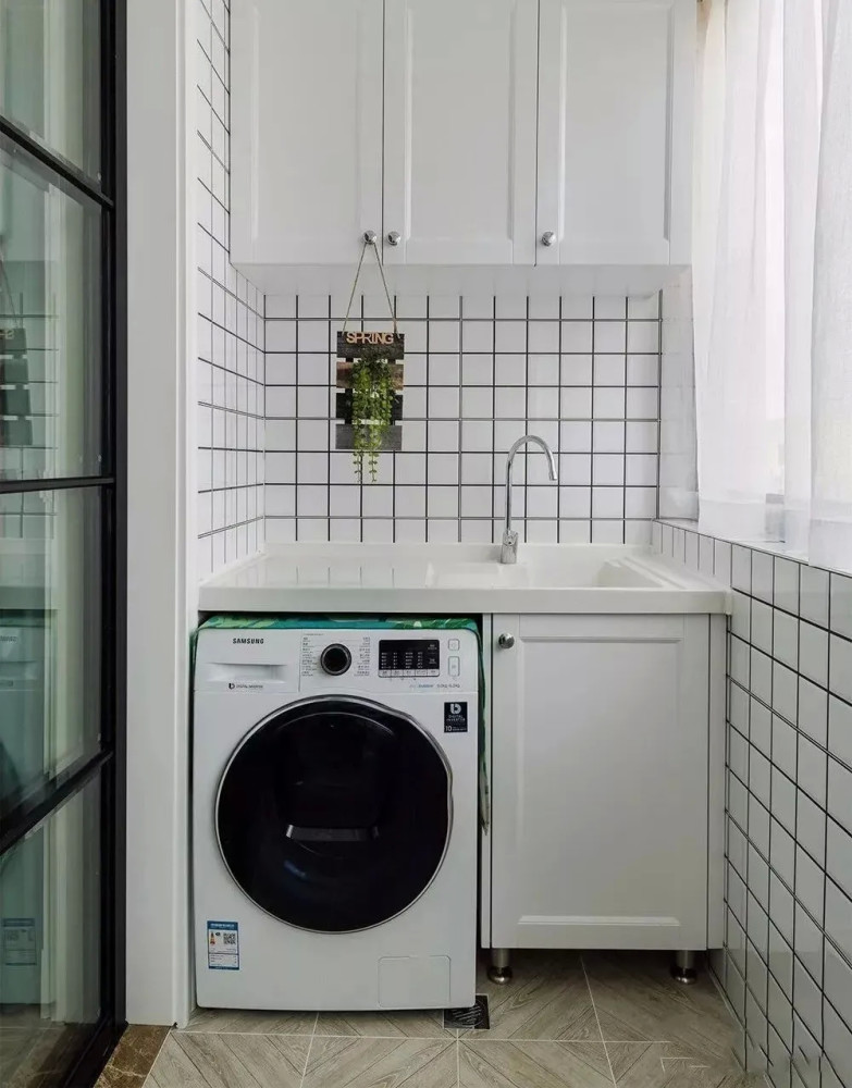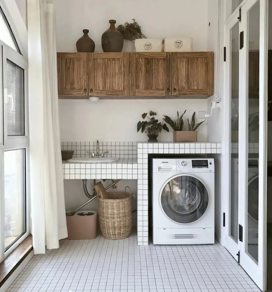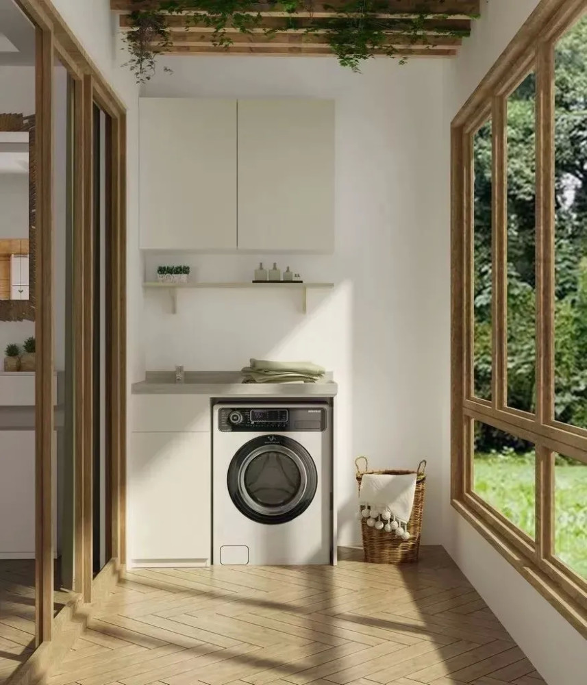 洗衣机是家家必备的电器,一般来说,是放在卫生间居多。 但如果遇到小户型,卫生间放不下,那该怎么办?这个时候,我们可以换个思路,想想家里还有什么地方可以放洗衣机。今天就来看一些别人家是怎么灵活运用的吧! 01同样是放在卫生间,你还可以这样做 很多人都会首选在卫生间放洗衣机,方便换洗衣服。但他们并没有好好利用洗衣机上方的空间,而是让它空着。其实,可以在洗衣机上方上加一个柜子或是隔板,放放洗衣液、护理液之类的物品,收纳能力翻倍,还能为卫生间扩容。 也可以将洗衣机完全隐藏在柜体里,打造简约的现代感。尤其是小户型的空间,越是简洁,越是大气,洗衣机完全可以藏起来。 02 放在阳台,方便晒衣服 阳台光线充足,晾洗衣物非常方便,所以也可以把洗衣机顺势放这里,洗完衣服直接晾晒。 但如果采光很好,光线太足,有人会担心把洗衣机晒坏。这时,可以根据自家的洗衣机尺寸,打造一个封闭式橱柜/台面,把洗衣机靠里放。 03嵌在厨房橱柜里,新尝试新体验 最近几年,洗衣机放厨房成了新的流行趋势。高低操作台的设计让洗衣机在厨房也有了安身之地。厨房里密布水源与电源,用水、用电都方便。 04 独立洗衣房,你值得拥有 在家里,也可以利用一些角落,比如类似楼梯下方、不规则墙面构成的鸡肋角落,提前规划好水电路,就能加以利用变身独立的洗衣区。 4 G6 v& c6 K) N