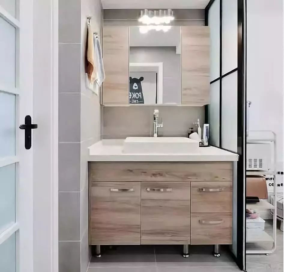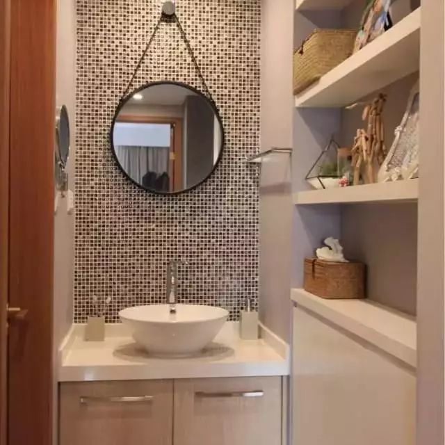 很多小户型屋主都会觉得自家的卫生间太过迷你,想要做出干湿分离都比较困难,其实干湿分离最重要的还是洗手台位置的设置,将洗手台放到卫生间外,开个彻底的干湿分离是最好的,今天分享一些小户型卫生间洗手台的摆放设计给大家,希望你们能从中找到适合自家的做法。 卫生间的设计以灰色为主,搭配白色的卫具,洗手台被放在了门外,这样内部的空间会宽敞一些,也方便一家三口的日常使用。 卫生间做了彻底的干湿分离,把洗手台放在了门外,还做了嵌入式的柜子和镜柜,卫生间的内部也用玻璃隔断门来分隔淋浴区和如厕区。 洗手盆有条件的,可以做到门外面,不要占了本来就小的卫浴空间。 卫生间内部的空间不够,把洗手台给移到门外来也不错,特别是卫生间这里是走廊的,放在走廊的最里面,边上还可以做嵌入式的柜子。 像这样马桶水槽一体的设计,对于小户型卫生间来说是绝对有用的,省空间又实用。 与其把它们挤在一起,还不如把洗手台搬出来,解放卫生间面积,这样一来,如厕、淋浴的体验也会更好,洗手也更加方便,何乐而不为! 一般来说,洗手台外移的位置要靠近卫生间,因为我们习惯上完厕所就洗手,这样能大大提高便利性和实用性。而且水管能穿墙而过,施工方便又省钱。 在洗手盆与过道中间,砌一堵矮墙,墙的顶部可以摆上绿植、小饰品、肥皂盒等,避免洗手台的水溅到外面,又能保证空间美观与实用。 如果前期没有砌墙,又想后期增设隔断的话,可以利用木质屏风、置物架、玻璃进行隔断,图案随着自己喜欢的来,颜值相对的也会高些。