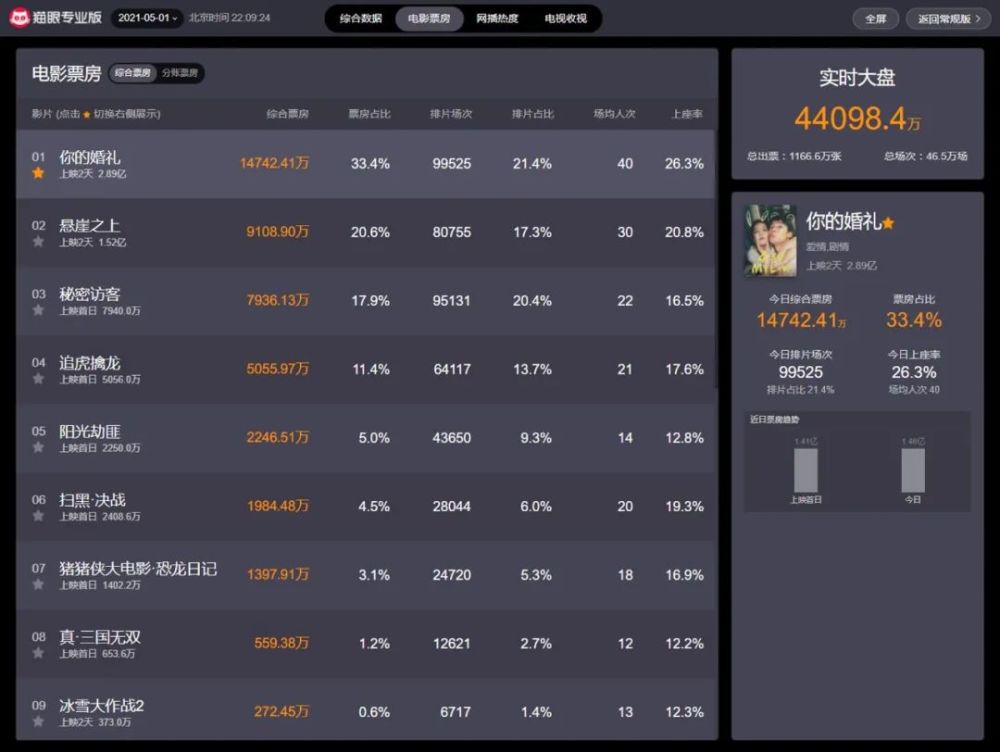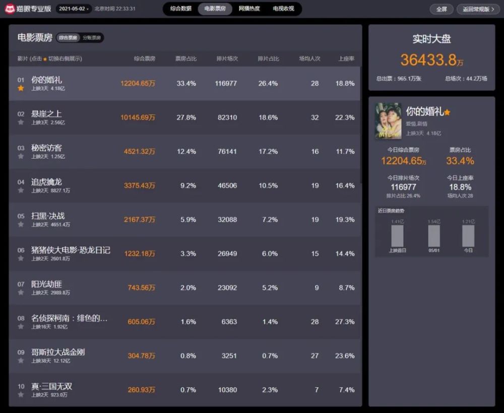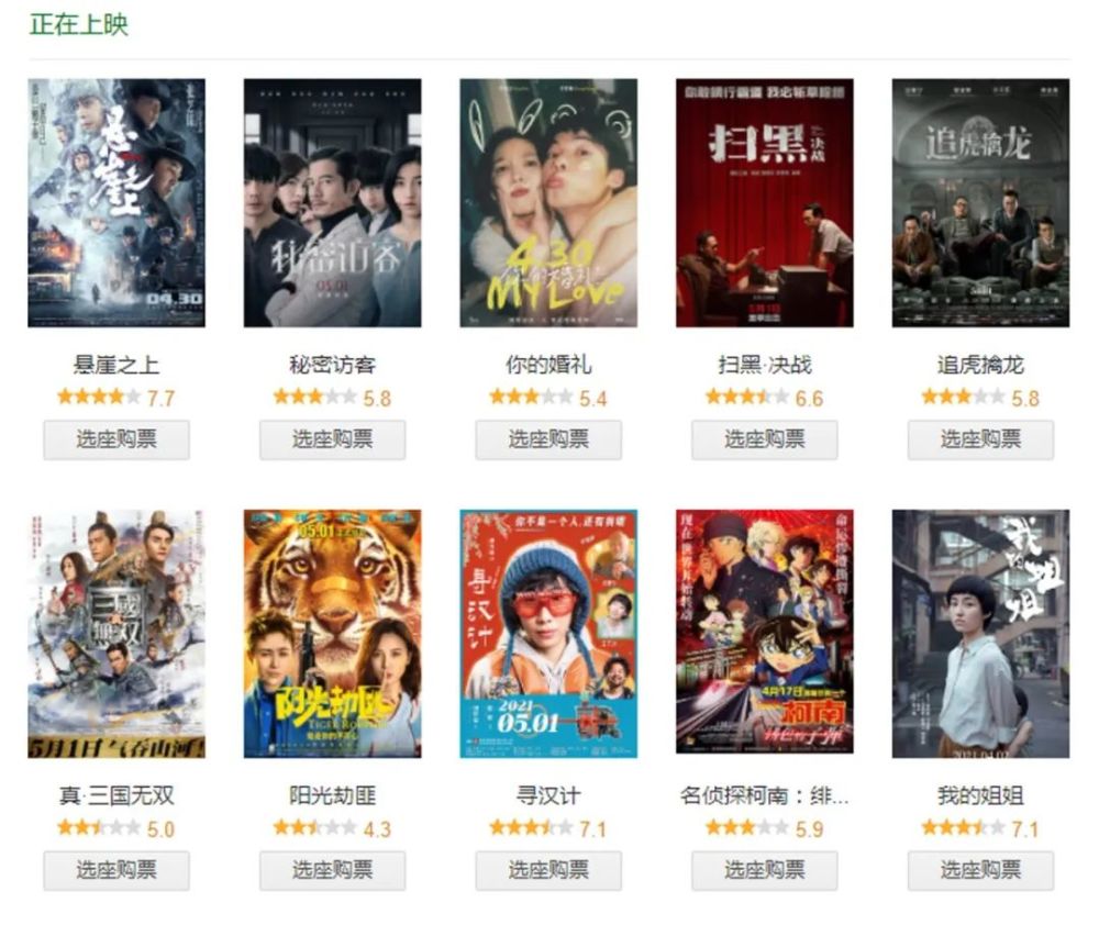 【五一档电影票房大战:《悬崖之上》靠口碑逆袭,《阳光劫匪》评分垫底,《你的婚礼》低分高票房】 2021年的五一,差点成了史上最拥挤的五一档期;虽然开赛前有几部大片提前退出,但仍不影响这个档期票房竞争的精彩。 五一档期的第三天,5月2日,所有的新片都凑够了豆瓣点评人数开分,7.7分的《悬崖之上》排名第一,具体评分结果如下: 《悬崖之上》7.7 《寻汉记》7.1 《扫黑·决战》6.6 《秘密访客》5.8 《追虎擒龙》5.7 《你的婚礼》5.4 《真·三国无双》5.0 《阳光劫匪》4.2 及格线以上的3部,其中2部过7分,张艺谋的《悬崖之上》评分最高; 超过5分的4部,《真·三国无双》勉强踩线; 最烂的竟然是《阳光劫匪》,只有4.2。 5月3日一早,部分数据出现微调:《寻汉记》7.0,《秘密访客》5.7,《追虎擒龙》5.6,《你的婚礼》5.3,《阳光劫匪》4.4。 实在想不到,有拿过威尼斯、柏林、东京等几大国际电影节奖项的导演李玉;有金鸡奖影后、白玉兰奖视后、金鹰奖最佳表演艺术奖的宋佳;有多次上春晚的准百亿票房女主角马丽;还有金像奖影帝曾志伟和一只真老虎。 这样的《阳光劫匪》评分垫底,烂得让人无话可说。 相比豆瓣评分上的差距,票房的落差更加惨烈。 评分倒数第3的《你的婚礼》3天4.2亿的票房遥遥领先,标准的低分高票房;《悬崖之上》3天2.5亿,《秘密访客》2天破1亿;其他的都没有过亿。 《真·三国无双》主打视觉特效,远赴澳洲取景,票房只有900多万,预测总票房不过2000万,绝对赔钱;评分第二的《寻汉记》却只有不到1%的排片,上映2天票房不到140万,还不到某女明星一天的工资。【有消息说《真·三国无双》会马上线上放映,但这评分还是推不动票房啊!】 实时总票房排名,截止2021年5月2日22:33 1 《你的婚礼》4.18亿 2 《悬崖之上》2.56亿 3 《秘密访客》1.25亿 4 《追虎擒龙》8827万 5 《扫黑·决战》4651万 6 《阳光劫匪》2989万 7 《真·三国无双》926万 8 《寻汉记》136万 唯一连续三天单日票房过亿的《你的婚礼》稳居第一档,同时还占据排片场次、上座率和场均人次的第一。 《你的婚礼》在猫眼和淘票票上的评分只有8.0左右,排名中下;在豆瓣上则从5.6分一直滑到了5.3分,排名倒数第3。 可是,这都不影响观众购票的热情。 5月2日开市,《你的婚礼》的排片场次比昨天多了1万6千多场,而口碑和评价最好的《悬崖之上》反而少了1千多场,《扫黑.决战》多了1千多场;《秘密访客》少了1万多场,《追虎擒龙》少了1万多场,《阳光劫匪》少了近2万场。 所以,豆瓣评分对电影排片和票房影响有多大呢? 对部分影片影响巨大,对部分影片的影响,短时间内几乎看不到,但后劲很足。 根据5月1日收市前的最终数据,上座率第1的《你的婚礼》场均人次是40人,平均票价是37.2元,那么电影院每场票房收入可达1488元。 上座率第2的《悬崖之上》场均人次30人,平均票价是38元,每场票房收入是1140元。 上座率第7的《真·三国无双》场均人次12人,平均票价39.5元,每场票房收入是474元。 也就是说,每放一场电影,《你的婚礼》比《悬崖之上》多赚300多,比《真.三国无双》多赚1000多。 真金白银在帮电影院做选择,而电影院的选择限制了观众的选择。 电影院肯定会给上座率高、票房收入高的电影多排片,而且霸占了最黄金的时间段;而上座率低、票房收入也低的影片,电影院不可能给它优质的排片,否则放一场的收益都不够交电费。 最惨的《寻汉记》,场均人次是3人,平均票价是36.2元,平均每场票房收入只有108.6元。 一家电影院,除去片方抽成、电影基金和专项税等,还要算场地、人工、水电,以及设备、装修折旧等等成本。 一般,一家电影院一个厅场均卖不出10张票,基本是要亏损的。IMAX影厅成本更高,虽然票价贵,但设备贵啊!所以,一般只有万达广场这种人流量巨大的商场,才敢做IMAX影厅。 很多时候,一家电影院的票房收入只够成本,真正要赚钱主要靠爆米花、饮料及各种电影周边的销售。 很明显,《你的婚礼》这样的爱情电影,爆米花肯定会比其他电影好卖得多。 当然,豆瓣高分的好口碑还是可以推动票房的。 从5月2日起,《悬崖之上》的场均人次和上座率已经反超《你的婚礼》:《悬崖之上》场均人次达到32人,而《你的婚礼》已经从40人跌到28人。 所以,在昨天排片差距加大的情况下,单日票房差距反而减少了。 上映首日,《悬崖之上》4678.8万,《你的婚礼》1.41亿,相差0.93亿; 上映第二日,《悬崖之上》9409.9万,《你的婚礼》1.54亿,相差0.62亿; 上映第三日,《悬崖之上》1.04亿,《你的婚礼》1.27亿,相差0.23亿。 上映第四日,开市时《悬崖之上》的排片增加到21.9%,达95060场;《你的婚礼》的排片为25.8%,达112112场。 两片的排片场次差,从5月2日的34667场,变成5月3日的17052场,差距小了一倍。【实际场次,到晚间还会有上千场左右的增补。】 《悬崖之上》单日票房连续三天上涨,《你的婚礼》从昨天开始下跌。 按照这样的票房涨势,实际排片涨势,《悬崖之上》单日票房有望今天就能逆转《你的婚礼》。国师果然宝刀未老,名不虚传。 拭目以待!