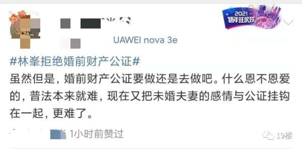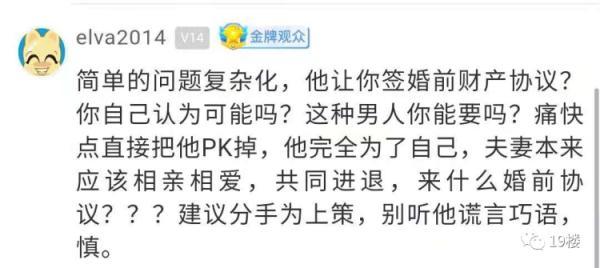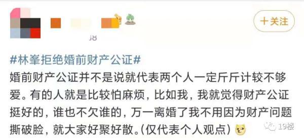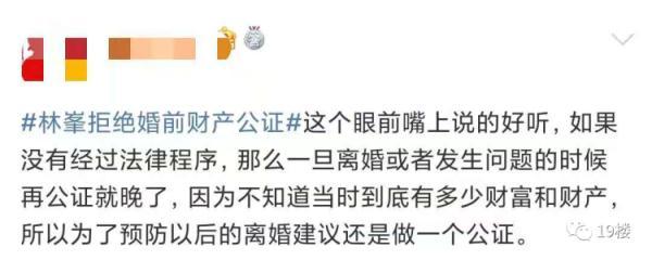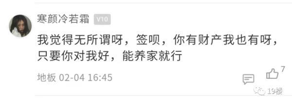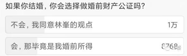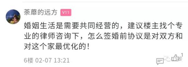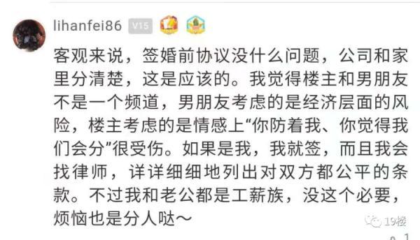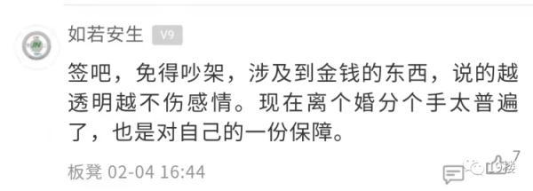 亲兄弟明算账 那么夫妻之间呢? 最近有网友发帖称 男朋友在婚前 突然提出要签婚前财产协议 这让她感觉关系被划得太清了…… 19楼用户@穿越人海相拥 我和男朋友马上就要结婚了,但男朋友却突然提出要跟自己签婚前财产协议, 自己心里难以接受。 因为男朋友是自己开公司的,然后公司有股权, 所以就说要签个协议,说什么要不然公司其他人可能会有担忧??? 我就说这有什么好担忧的,难道是担忧哪天我们分了,我卷着钱跑了?而且我们都还没结婚呢,就想着分了的事... 男朋友就说,他并没有这么想,只是觉得万事都得提前做好预防,有个planB。说也是为我好,万一将来他公司赔了,我也不用一块承担。他觉得应该把公司和家里分清楚…… 话虽这么说,但是我还是不太能接受跟老公签财产协议这种事。 我就觉得签了这个,感觉关系划得也太清了,夫妻难道不是荣辱与共吗?我都从来没想过他公司万一哪天赔了的事,他却想着要防我! 如果真的签了,是不是就代表婚后他公司赚的钱跟我一毛关系都没有了,我也不是说要分多少钱,但是总感觉这就不像个夫妻了。 你们觉得我应不应该签这婚前协议呢? 楼主的帖子引起了热议。在帖子的评论区,部分网友表示签订婚前协议后,双方相处能更加的透明,两个人之间的感情也不会受影响。 不少网友表示婚姻生活需要共同经营, 并建议楼主可以咨询律师制订公平合理的条约 ,以更好地保障自身权益。 也有网友表示签订婚前协议很见外,易伤夫妻和气。 新闻多看点 婚姻是一件很神圣、美好的事情,可当爱情与财产纠结在一起,婚姻关系就容易变得模糊不清,甚至是迷雾重重。于是,很多夫妻达成共识,会做婚前财产公证。 在某综艺节目上,模特张馨月表示曾提出与丈夫林峯做婚前财产公证,但林峯认为没必要,并表示“我的东西全部都是你的。” 之后,“林峯拒绝婚前财产公证”登上热搜。 热搜下,有网友发起投票,大多数网友同意林峯 的观点,选择不做婚前财产公证。 但也有网友认为婚前财产公证无关信任危机,反倒可以避免婚后的经济恐慌,减少双方的纠纷。 你觉得楼主这协议该不该签? 对于婚前财产协议这事 你怎么看