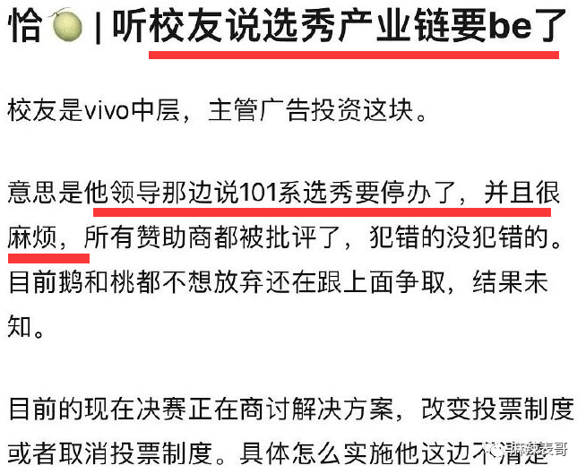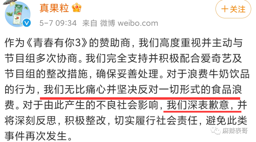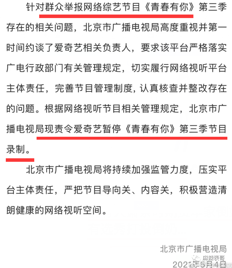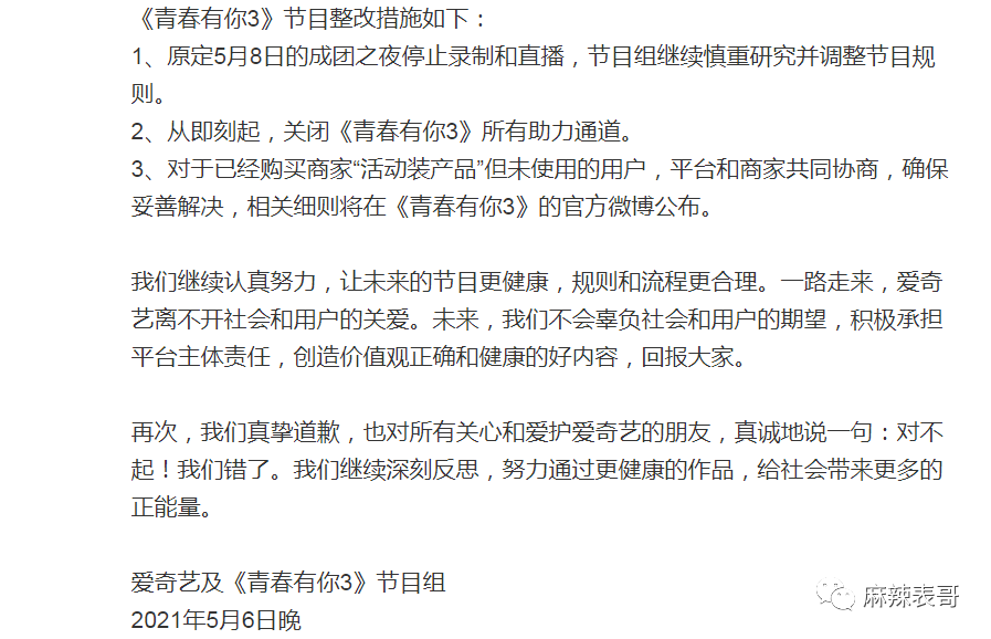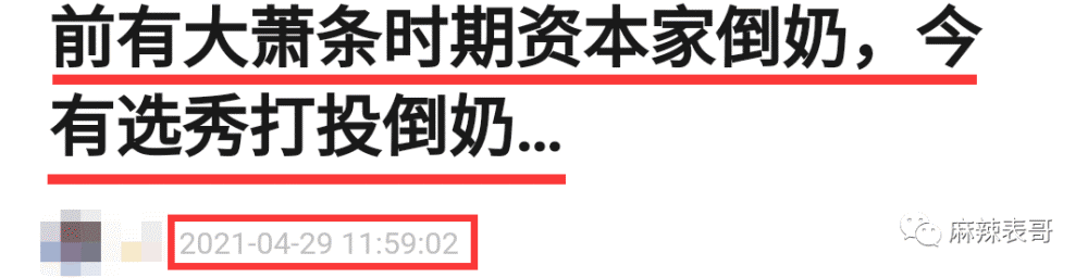 2021年是娱乐圈里值得纪念的一年。 为什么? 因为选秀出大事了。 是天意啊,是注定啊,是活该啊。 这一切,要从一个叫“余景天”的小孩说起。 2002年的夏天,四川成都出生了一个名为“余景天”的小孩,他是谁不重要,重要的是,他的爸妈在成都KTV界画了一个圈。 名为“景立KTV”。 功夫不负有心人,多年后,景立KTV成为成都赫赫有名的歌城,余景天顺利变成富二代+继承人。 可年轻小孩志不在此,他的梦想是璀璨舞台。 17岁那一年,余景天去到韩国闯荡,加拿大人身份+卖萌可爱加持,却遗憾未能出道。 之后,余景天改变策略,出口转内销。 他回国了。 回国参加《青你》这一年,正是2021年。 余景天再次出发,加拿大人变成中国人,即便弹性爱国人设明显,但依旧圈到一波粉丝。 大量粉丝为他打投,助他出道,送他登上顶峰。 可就在决赛的前几天,余景天爸妈经营的KTV疑似涉黄涉毒被爆。 父母之爱子,则为之计深远。 当即余景天妈妈为保余景天,下场为儿喊冤,并同时甩出律师函,警告广大网友闭上嘴巴,再叭叭,我告了你们。 《青春有你》节目组同时未发一言,迟钝的制作组当时没明白,何为断臂求生,何为弃车保帅。 更何况新的风暴早已出现,他们却停滞不前。 很快,群众告诉节目组,谁才是真正的青春制作人。 大众不允许,有涉黄涉毒父母背景的人当青少年的偶像。 大众不允许,父母在圈外涉黄涉毒,儿子在圈内选秀争C,尽享鲜花掌声。 大众更不允许,涉黄涉毒的底线被打开,还熟视无睹。 于是,网友举起了监督的大旗,把《青春有你》举报了。 选秀节目问题,不是一天两天,广电重视程度远超节目组想象。 3天,就3天的时间,结果出来了。 节目暂停,余景天因身体原因(是伤心过度吗?)退赛。 本以为摘掉这颗烂苹果,整棵树还有希望。 可实际上,整棵树从根上就彻底烂了。 余景天一事成引子后,5月5日,选秀打投倒奶一事终于爆发。 一瓶一瓶地奶,一箱一箱地奶,被全部倒掉。 要不是电视剧情节里的“牛奶浴”,你可能一辈子都不会看到整桶奶被倒。 哦,不,国外以前为了维持市场平衡也倒过奶,宁愿浪费都要倒掉,被称为资本主义经济的畸形现象。 那为什么选秀节目里好好的奶也要被倒掉? 说来话长。 选秀节目不只是看帅哥美女唱歌跳舞,“打榜”“投票”是传统,票数高的前几名才能出道。 零几年《超级女声》,那会就是发短信投票,一条短信一块钱。 相对简单,看电视的粉丝都是拉着家里的亲戚朋友给自己的偶像投票。 快男超女红了5年左右,到达选秀周期,开始衰败。 直到2018年,《偶像练习生》把韩国的养成系选秀搬到国内,选秀节目又再一次火了起来。 粉丝一颗真心+一手钱财,节目组不割白不割,他们推出了各种打投,比如买会员啦,买奶啦。 简单来说,就是粉丝花钱送爱豆出道。 在资本的控制之下,秀圈攀比之风有多无少。 原本搞了几年都没什么事,这一次《青春有你》踩了一块铁板。 他们设置了一个扫码打投。 买一瓶奶,就可以扫码一次给爱豆投票,次数不设上限。 畸形竞争就算了,赞助商蒙牛真果粒,竟然把码印在瓶盖内。 为什么要印在瓶盖内,而不是像《创造101》印在瓶子外面?那我们就不得而知了,或许就是为了防止粉丝二次销售,影响原价商品。 粉丝为了送爱豆出道,自然大下血本。 他们要么自己买,要么给后援会打钱,后援会统一组织买奶。 开盖扫二维码,导致奶保存不了太久,多了又喝不完,最终只能倒掉。 据说《青春有你》一次排名倒了27万瓶奶,将近180万人民币。 赤裸裸的浪费,令人咋舌。 不过有粉丝提出,他们没有倒奶,倒奶的应该是去年的《青春有你》。 但实际上,确确实实是这一次。 今年的《青春有你3》和去年的《青春有你2》外包装不一样。 而且,把倒奶图片放大来看,能找到生产日期。 2021年3月生产。 打投的粉丝们喊冤,他们买到的是电子卡,压根不知道这些成批成批的奶到底是谁在倒。 可实际上,对于围观者来说,去年和今年并不重要。 重要的是,倒奶是真的。 九年义务教育学过吧,没上初中也不要紧,《悯农》是小学二年级课本上的诗。 浪费食物,家家户户也应该都教过吧,吃饭米粒掉桌子上,从小是要被爷爷打手背的。 但凡是个正常人,都知道浪费可耻。 哦,还不仅仅只是浪费,《青春有你》节目组这么一搞,可能违法了。 我们前段时间才刚刚通过《反食品浪费法》,倒奶的荒唐操作就是顶风作案。 也是因此,第一次,秀圈事件成为大型社会事件。 “倒奶”彻底出圈了。 CCTV13新闻频道、CCTV2财经频道、CETV1教育频道,以及各大官媒通通下场报道。 被当头打了一棒的爱奇艺这时候才真正醒过来。 内疚、自责,深深地表达歉意。 至于神隐了一整天的真果粒,到了今天才姗姗来迟。 “无比痛心”这词,你听着信吗? 鲁豫说,她不信。 典型的汽车撞墙了,知道拐了;股票涨了,知道买了;鼻涕掉嘴里了,知道甩了。 而往往这个时候,就是彻底晚了。 有小道消息称,101系选秀要停办了,并且很麻烦,鹅和桃都被波及到。 想想前几天,爱奇艺还在冷处理余景天的事,寄希望于拖到5月8日总决赛,把余景天送上C位,割完最后一波韭菜,简直就是笑话。 这样一来,完全是偷鸡不成蚀把米。 也怪高层没有一丁点大局观,选秀辉煌4年,如今终于要彻底整顿。 要说活该也是真活该,这些年,吃瓜群众早就苦粉圈不良风气久矣。 但凡粉圈所到之处,没有一个正常的。 张云雷