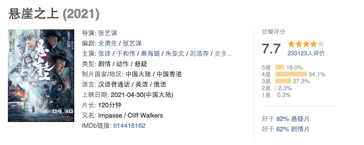 《悬崖之上》五一档逆袭,短短5天时间票房超6亿,豆瓣评分7.7,算是“国师"十年来评价最高的商业电影了。 自从十年之前《金陵十三钗》拿到8分之后,张艺谋的商业电影都参差不齐。 其中4.9分的《长城》口碑垫底,2016年度烂片之一,那个大红大紫大蓝大金的配色,还有莫名其妙的“飞索攻击”,是小姐姐这辈子都难忘的尴尬银幕体验。 至于票房,《长城》最后报11.74亿,可影片成本据说有好几个亿,说它口碑与票房双双跌落,不为过吧。彼时不少言论认为,《长城》对张艺谋中国导演界“头号交椅”地位损伤极大,小姐姐也担心过那会66岁的他还能不能爬起来。 但“国师”就是“国师”,2年之后携《影》决战国庆档,影片放弃了他非常钟爱的大红大绿配色,黑白灰的水墨风格让人耳目一新。 尤其是镜州回故乡这场戏,马跑过湿漉漉的街道,雾气纷扰的巷子,然后滴答家门外的一座小桥。看到这一幕,任谁心里不是在默念“古藤老树昏鸦,小桥流水人家,古道西风瘦马,夕阳西下,断肠人在天涯。”国师就是国师,一句台词都不用,镜州思乡的感慨,物是人非的悲痛,全都出来了。 同档期竞争对手并不强,但《影》票房止步6.28亿,说到底还是有硬伤。 像影片仍有些“团体操式”审美,比如王千源撑着伞扭着腰的那场戏,跟《长城》尴尬的“飞索攻击”如出一辙,而且人物和故事也不够精细,相较于4亿投资来说,比《长城》好不了多少。 按说都到古稀之年了,也功成名就数十年,张艺谋就地“躺下”并不会被非议,偏偏他就是很有韧劲和拼劲,这几年在自己不熟悉的领域不断摸索,比如这次的《悬崖之上》。 谍战片拍的人不少,张艺谋是头一回。五一大早冲去赏片的小姐姐,第一个感触就是这个“国师”好陌生。 不仅因为他在片中完全摒弃了过往作品里根深蒂固的团体操审美。刻意渲染的景象,如大雪、黑夜、皮衣、枪声、俄式建筑,都呈现出一种冷冰冰硬邦邦又迷人的美术风格,而雪色笼罩的哈尔滨,更自带一种五六十年代黑色电影的质感,沉浸感极强。 因此,《悬崖之上》上映8天票房破6亿,评分也有7.7,这个成绩不能说差,但离优秀国产电影的8分线,还是差着一口气,今天小姐姐就想说说这其中的原因。 很多人因为影片太过“政治正确”而骂张艺谋,其实大可不必。想想《一秒钟》的多次推迟上映,你就知道“国师”身上的枷锁有多重。枷锁之下,他还冒着被骂的风险,去尝试新的类型,已经很不容易了。 再说嫌《悬崖之上》没有作者性的批评,这就离谱啊,为啥非要跟一部纯娱乐的商业电影要作者性?商业电影最主要最根本的目的,就是提供娱乐啊。 可能责之深爱才切吧,虽然张艺谋自谦是“职业导演”,但自1988年推出《红高粱》技惊四座至今,他已经成为观众自发称道的“国师“,大家天然就对他有更高的要求:不能是纯粹的娱乐,不能是纯粹的商业电影。从这点来看,《悬崖之上》面对的就是比别人更严苛的审视标准。 可认真讲,《悬崖之上》最大的问题始终是故事的bug(不包括那些说总是下雪不真实的批评,电影不负责提供真实),只要改进7个bug,叫好叫座的张艺谋商业电影或许就此诞生。 01 小兰和刘浩存,为什么会这样? 刘浩存出演的小兰,是《悬崖之上》上映后被吐槽火力最集中的。毕竟角色本身存在着难以自洽的矛盾。她小白花似的形象,被当成乱世中纯洁与希望的象征,但同时她又缜密且杀人利落,这让象征也不够纯粹。 而当象征不够纯粹,张宪臣与周乙解释”乌特拉“是黎明,和要让她活下去的几场戏,就没有了本该具有的力度,毫无感染力。 演技成熟些的女演员也许能把小白花和老练杀手这两种场景统一起来,让角色复杂立体,但刘浩存真的不行,她让小兰的这两种特质呈现分裂状态,毫无章法。 02 小兰和王楚良尴尬一吻,有必要吗? 自从《山楂树之恋》之后,张艺谋就不太会拍这种情情爱爱的戏了,因而看到树林离别一幕,楚良第一个动作是强吻小兰,小姐姐脚趾头抠地尴尬至极。此外,让刘浩存和朱亚文这两个年纪相差16岁,明明没有任何火花的人,一出场就来个吻戏,隔着屏幕都能感到那嘴唇的不情愿。 其实,不是非要吻戏才能展现爱情。分别时候深情拥抱,开开玩笑,哪怕讲个冷笑话展现一下年轻人的乐观也行啊,革命感情大家都懂。 03 车厢四目传情,有这么放肆的特工吗? 影片开场十分震撼,4个降落伞如同四朵花在雪原森林上盛放,接下来镜头穿过树林的第一视角,更让观众有代入感,更让人好奇兵分两路的双线叙事,会有怎样的戏剧张力。 雪地遇特务的两场戏虽不够严谨,却也足够令人期待,接下来要如何识破特务、如何接头、如何完成任务,每一环节都扣人心弦。没想到下一步,双线成一线,2组人马坐到了同一个车厢里。 有人吐槽说,哈尔滨可是个大城市,开行列车班次不少,怎么可能这么巧地4个人上了同一列车,还在同一个车厢?!而且,在苏联受过7个月训练的专业人员,就这么在车厢里眉目传情,特务还看不出来,只有特务都瞎一种解释了。 就算想表现出传递消息却受阻的紧迫性,也不必在一个车厢,4个人分散开,狭窄的通道和可疑的人群,不是更会增加紧迫感和故事性?! 04 主角“自然”被怀疑,谁给开了上帝视角? 还是车厢预警戏份,厕所门口排队的人非常多,谢子荣装成醉汉硬插队进去改了张宪臣留下的密码之后,王郁接着进去,但王郁之后还有很多人去上厕所,怎么这么自