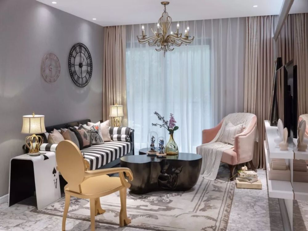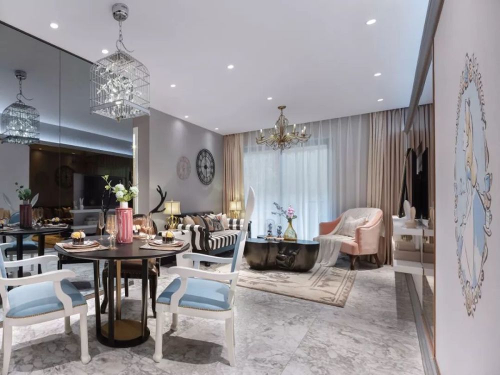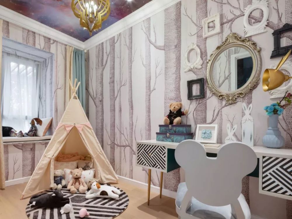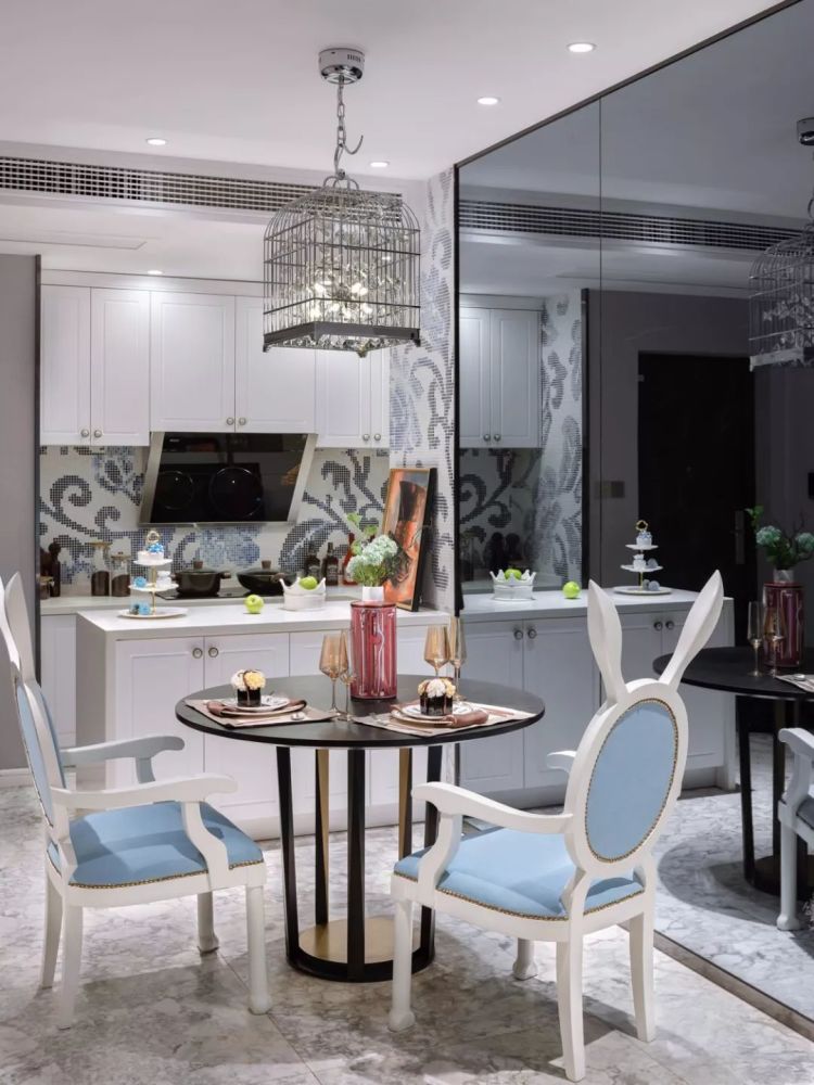建筑面积72平米的古典范小户型二居室案例,房子的实际使用面积在58平米左右,整个家虽然面积并不宽敞,但设计师通过古典风的家具、装饰,华丽的色彩搭配,来营造出了这样一个优雅浪漫的小窝。 平面布置图 入户玄关和餐厅、厨房、客厅之间,选择了做开放式的布局,让整个空间的光线能够流通起来,避免采光不好的问题。 迷你的厨房做了U字形的橱柜布局方案,那厨房和餐厅变得更有独立感。餐厅处的背景墙被设计成了黑玻的款式,显得更加时尚。 而大理石的地砖和这款蓝白相间的欧式风餐椅,都给餐厅带来了更为优雅、端庄的感觉。背景墙上的简单装饰,也起到相互呼应的效果。 客厅的设计也同样给人一种古典风的感觉,沙发背景墙刷成灰色,搭配创意的时钟,显得格外有趣。黑白条纹的布艺沙发和纸牌造型的边几,也非常独特。 电视背景墙是做了茶玻的设计,这些黑玻、茶玻都是能够带来复古感的设计,让整个小户型多出了很多别致的感觉。 还有这个造型独特的茶几,也让人觉得非常别致。搭配上木质单椅和粉色的小沙发,地面铺贴大面积的地毯,整个客厅看起来非常美观。 儿童房的墙面铺贴了壁纸,这种森林图案的壁纸在北欧风设计当中,出现得比较多。儿童房暂时被作为书桌和娱乐区来设计,小帐篷搭配一个书桌非常实用。 很有趣的是儿童房的天花板设计,通过星空图案来营造出梦幻感,整个儿童房的配色绚烂多彩,却又不会让人觉得太花哨。 卫生间的墙面和地面通过不同颜色的马赛克瓷砖,铺贴出了创意的图案,在洗手台和马桶之间,还加上碎玻璃隔断,整个空间都充满了创意感。 " Q6 _. V5 n9 Z6 C, ~+ T' m' x; L