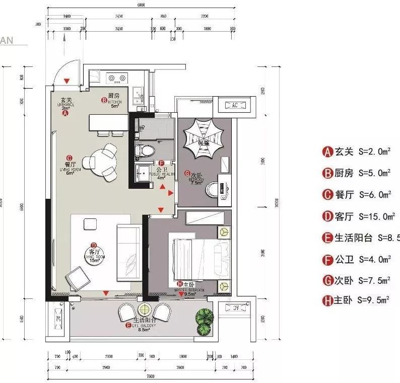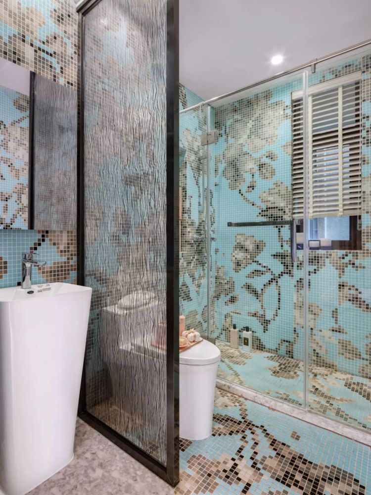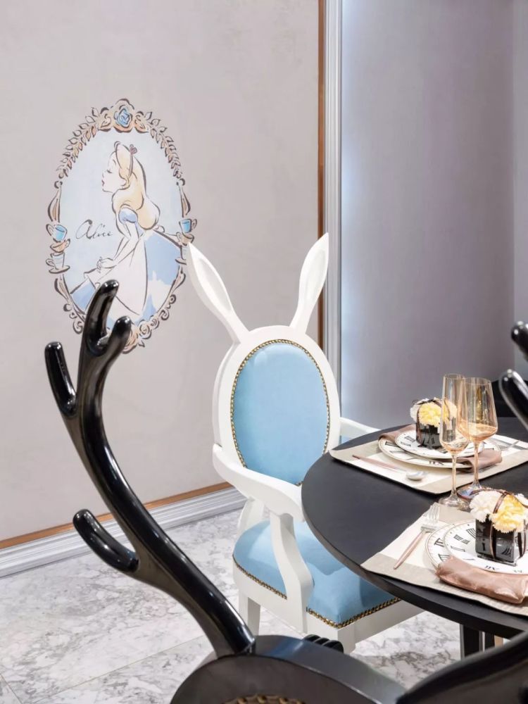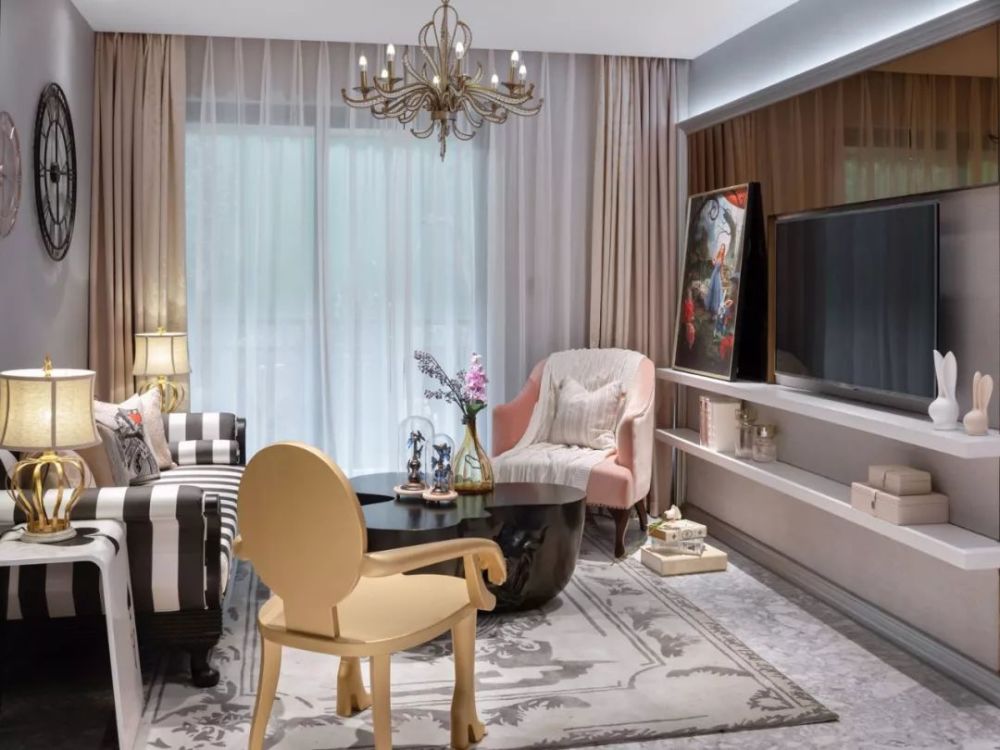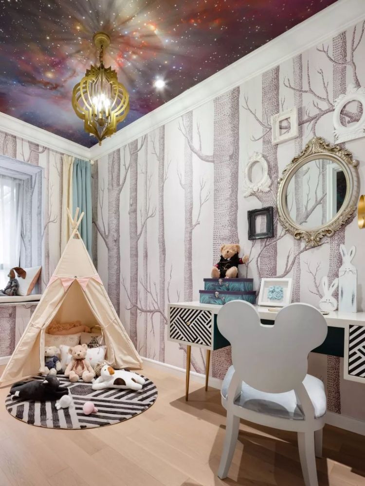建筑面积72平米的古典范小户型二居室案例,房子的实际使用面积在58平米左右,整个家虽然面积并不宽敞,但设计师通过古典风的家具、装饰,华丽的色彩搭配,来营造出了这样一个优雅浪漫的小窝。 平面布置图 入户玄关和餐厅、厨房、客厅之间,选择了做开放式的布局,让整个空间的光线能够流通起来,避免采光不好的问题。 迷你的厨房做了U字形的橱柜布局方案,那厨房和餐厅变得更有独立感。餐厅处的背景墙被设计成了黑玻的款式,显得更加时尚。 而大理石的地砖和这款蓝白相间的欧式风餐椅,都给餐厅带来了更为优雅、端庄的感觉。背景墙上的简单装饰,也起到相互呼应的效果。 客厅的设计也同样给人一种古典风的感觉,沙发背景墙刷成灰色,搭配创意的时钟,显得格外有趣。黑白条纹的布艺沙发和纸牌造型的边几,也非常独特。 电视背景墙是做了茶玻的设计,这些黑玻、茶玻都是能够带来复古感的设计,让整个小户型多出了很多别致的感觉。 还有这个造型独特的茶几,也让人觉得非常别致。搭配上木质单椅和粉色的小沙发,地面铺贴大面积的地毯,整个客厅看起来非常美观。 儿童房的墙面铺贴了壁纸,这种森林图案的壁纸在北欧风设计当中,出现得比较多。儿童房暂时被作为书桌和娱乐区来设计,小帐篷搭配一个书桌非常实用。 很有趣的是儿童房的天花板设计,通过星空图案来营造出梦幻感,整个儿童房的配色绚烂多彩,却又不会让人觉得太花哨。 卫生间的墙面和地面通过不同颜色的马赛克瓷砖,铺贴出了创意的图案,在洗手台和马桶之间,还加上碎玻璃隔断,整个空间都充满了创意感。 " Q6 _. V5 n9 Z6 C, ~+ T' m' x; L