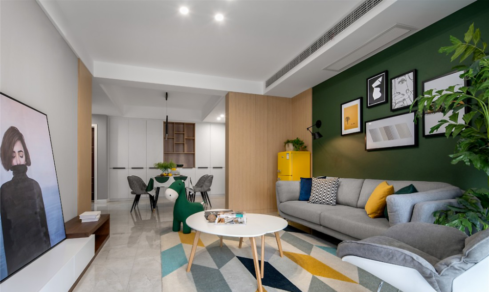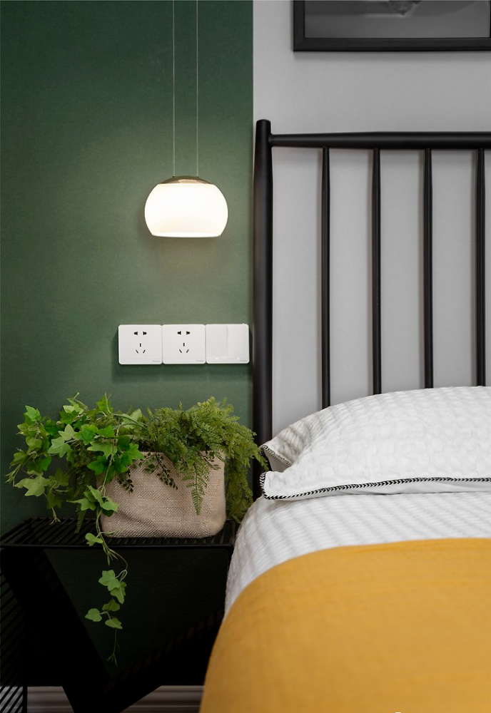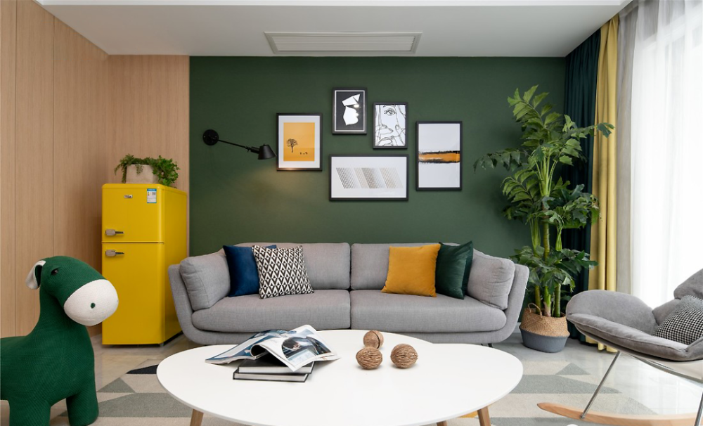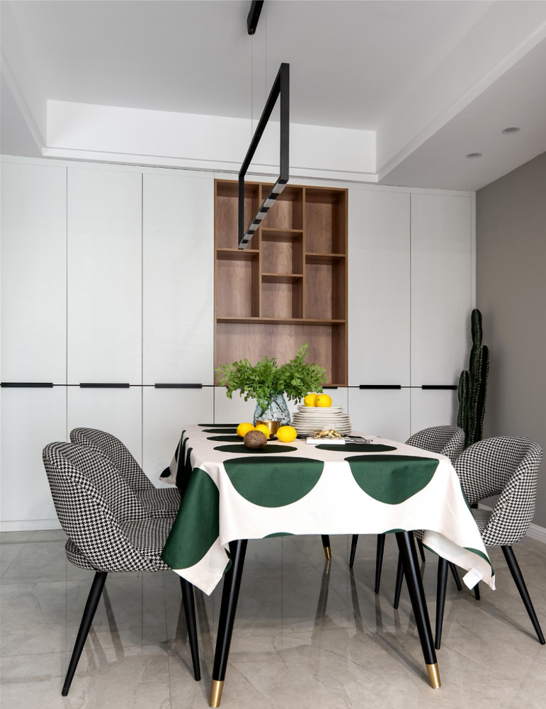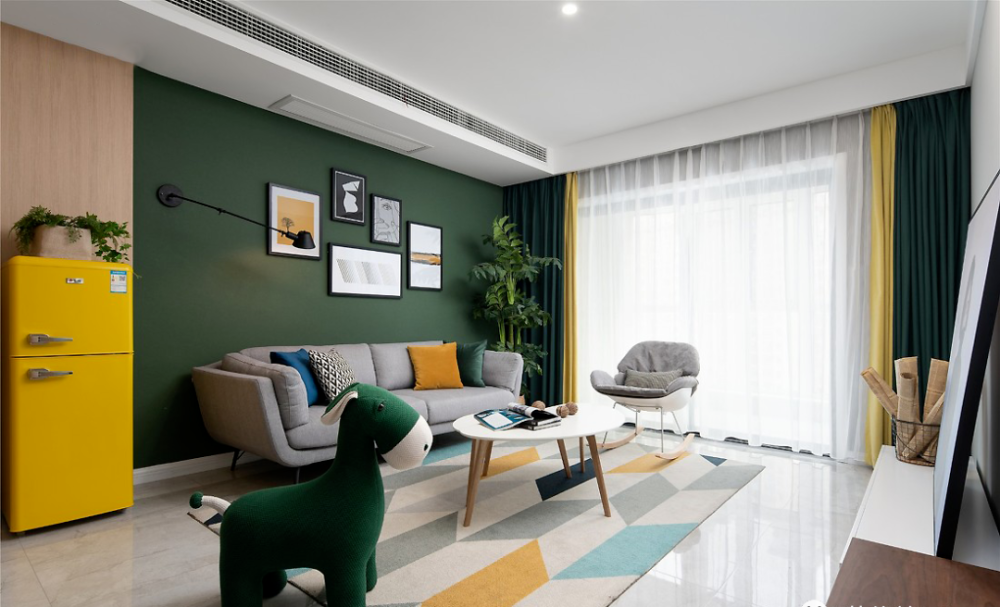 ” 设计理念 这是一套北欧风格的装修案例,家对于屋主而言,不仅仅只是一个住所,更是可以燃烧生活热情的地方,因此屋主期望格外注重“氛围感”,期望设计师可以多加把控。希望这套装修案例能给大家带来一些灵感。 ” 客厅 ▲ 当高级优雅的墨绿遇见温润的原木,是专属于自然的味道。 ▲ 亮黄色冰箱置于客厅也不会觉得突兀,与整体氛围融合的刚刚好。 ▲ 无论是背景色还是绿植,也在无形中强化视觉舒适度。 ▲ 或许你会觉得客厅配色略显张扬,但是另一侧电视背景墙的浅色却让色调得以沉淀。 ▲ 柔化空间氛围,也让空间主人的休闲时刻更为安逸。 餐厅 ▲ 餐厅,收纳柜占据了整面墙却因其浅色调不会给屋主压抑感,细腿餐桌椅搭配不同质感及色彩也可满足空间主人的时尚追求。 ▲ 桌布的配色都与墨绿主色调相呼应,配合整个餐厅呈现出的优雅气质,也是屋主所中意的。 厨房 ▲ 主打实用的厨房并没有强加装饰,石材和原木的结合也让空间布满自然简约气息。 主卧 ▲ 与客厅的活泼不同,屋主期望个人空间还是低调为主,因此并没有选择明艳的色彩,软装也遵循极简风,与整个设计形成反差。 儿童房 ▲ 孩子的房间,设计师则提取了客厅的墨绿及亮黄做搭配。 ▲ 天真烂漫的氛围,对于孩子的成长来说再好不过。 w& M5 t z' G9 B% y7 @9 p1 f