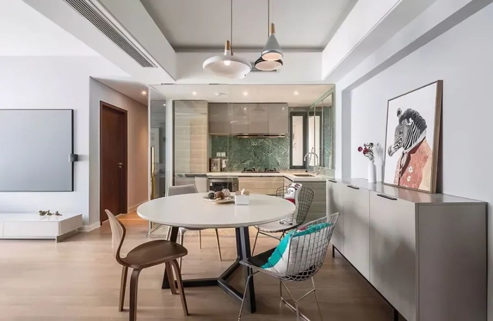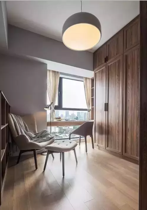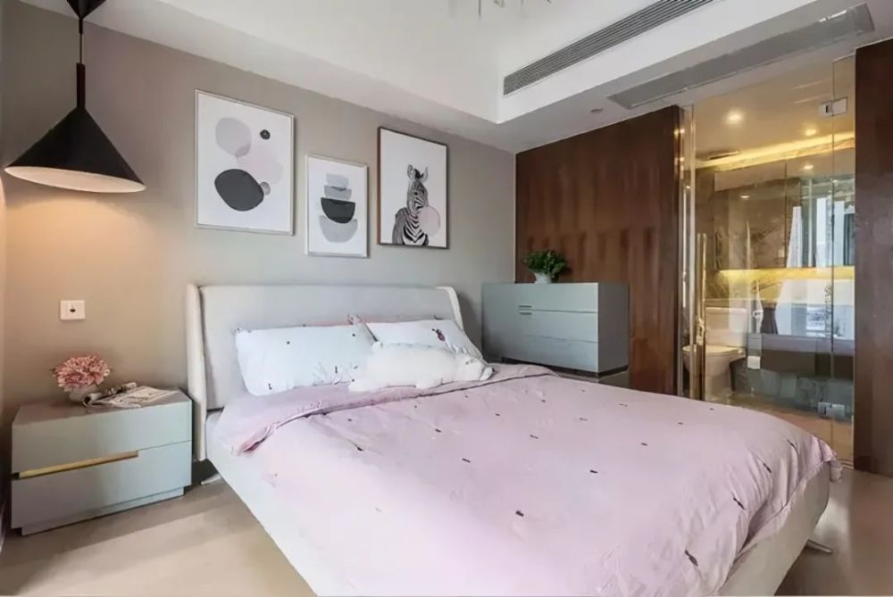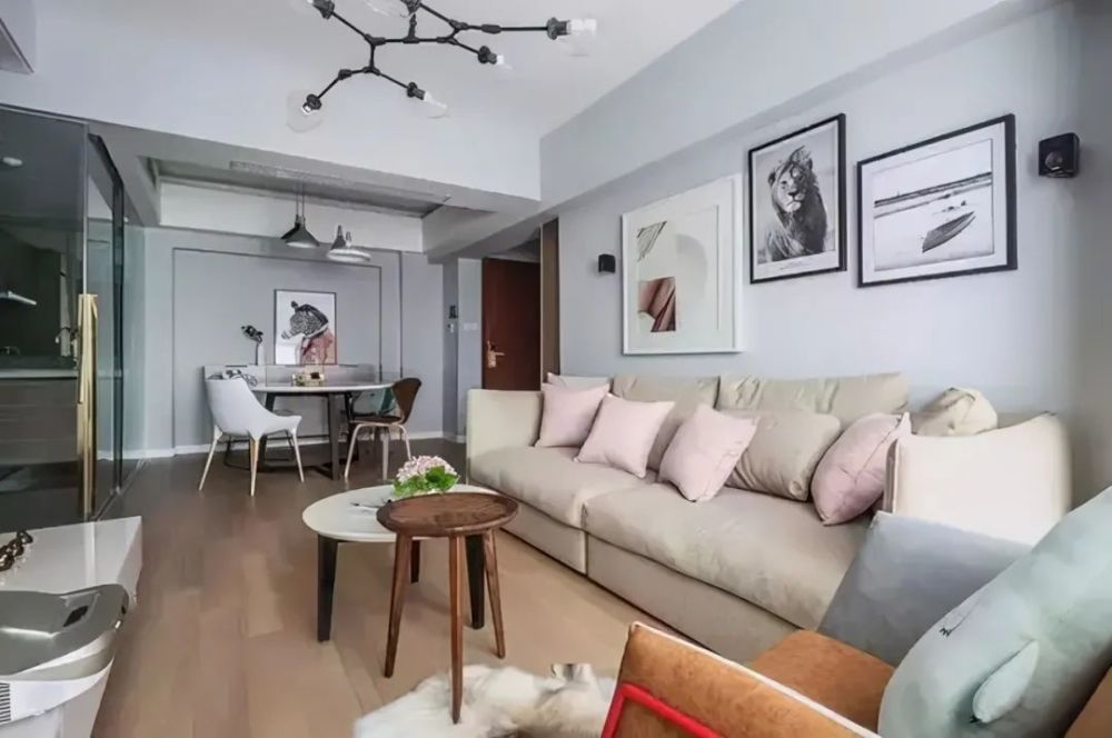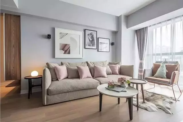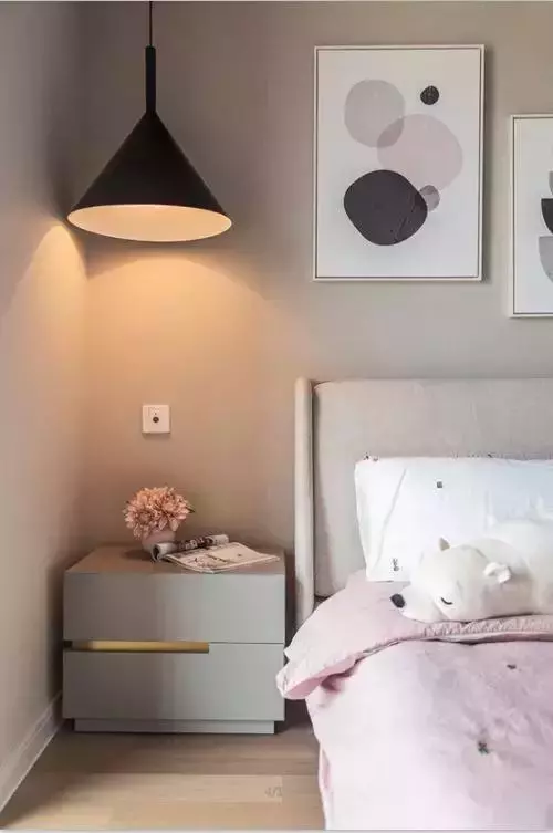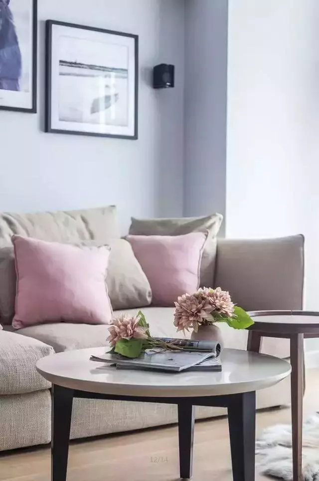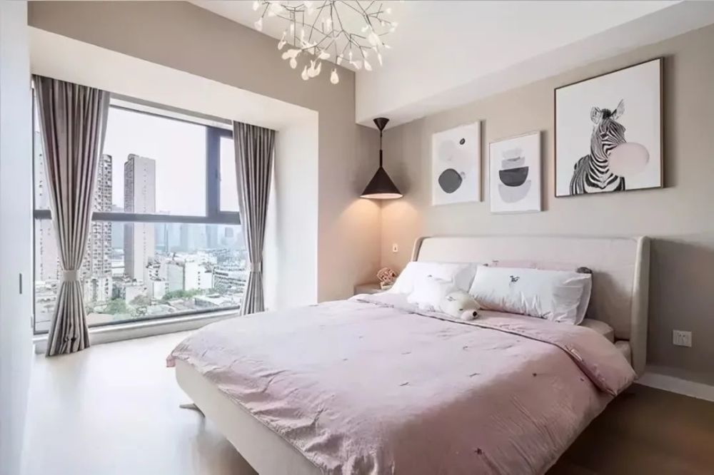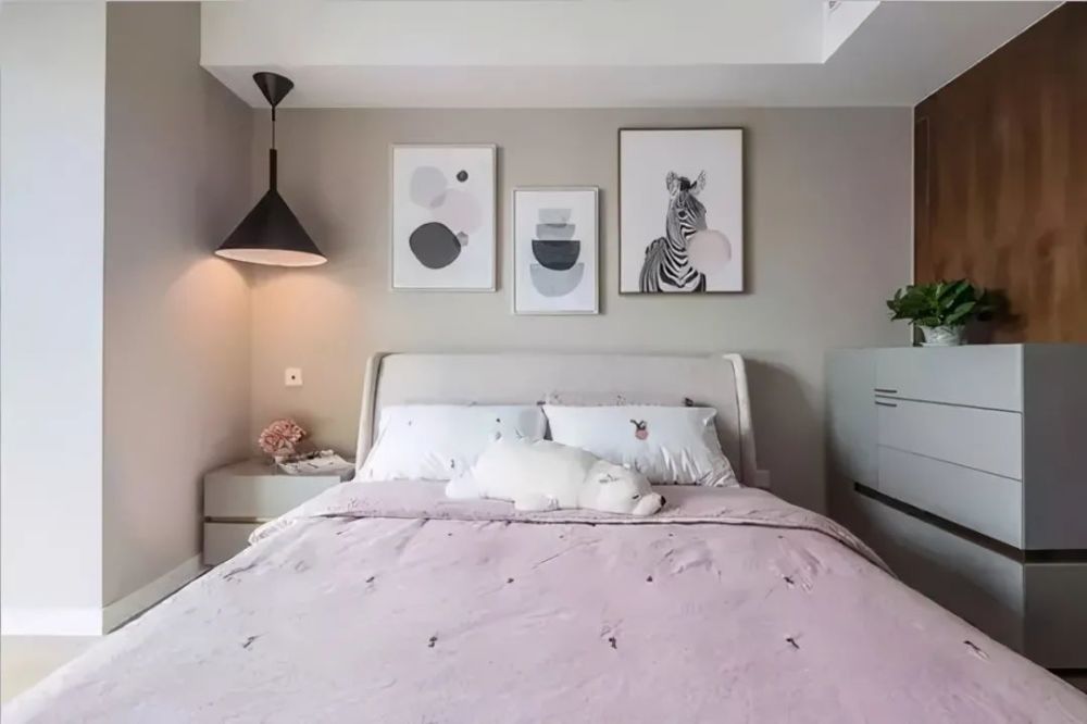 一套95平米的两房两厅精装房改造案例,风格定为简约清新的现代北欧风,硬装方面,以灰、白色为主色调,简洁大气,软装以粉色为主,跟所有女生一样,业主是一位粉色控的小仙女,超级喜欢粉色。 客 厅 客厅选了一款米色棉麻3人位沙发+单人椅组合方式,用灰粉色抱枕做为点缀,舒适柔美。 茶几选择的是定制款以高低大小的组合方式,让客厅空间更宽敞也实用美观。背景墙三副画风大小不同的组合方式,不中规中矩和空间协调又不失个性活力。 沙发墙装有3D环绕立体音响,还有台灯的设计方便看影院时弱光源,营造了极好的家庭观影体验。在过道设计到顶的定制柜体,方便收纳,也不影响美观。 餐 厅 餐厅选用圆形餐桌和圆形三色大小不同吊灯相呼应,增加空间灵动性,即有圆润和谐之意。 金属镂空餐椅,与木制,布椅混搭,文艺又不失个性。 主 卧 进入主卧室映入我们眼前的首先是一面大大地落地窗,视野好,采光也非常好。 床头背景是两副现代北欧几何喷绘画+斑马创意喷绘画,显得充满活力与创造力。 1.5米的米白布艺床,左手边选择常规床头柜,方便睡前看书,放手机水杯等,右边的斗柜方便放小衣物首饰等。 黑色吊灯与装修画色彩呼应,让单一的床头背景增添趣味性空间饱满而不局促。 衣 帽 间 次卧改成衣帽间+休闲书房设计方式,窗户边设计了一个简易书台,简洁宽敞。