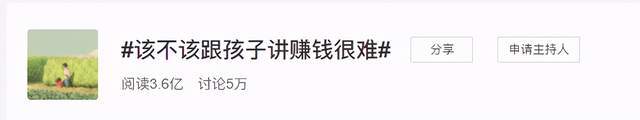 前几天,Mommy在网上冲浪的时候,看到一个热搜话题“该不该跟孩子讲赚钱很难”,吸引了5万网友的讨论。 有人说不该说,觉得不应该把社会残酷的一面过早让孩子接触,以免影响孩子的身心发育;有人说应该说,早点让孩子认清生活的真相,更有利于孩子的成长。 网友各说各有理,到最后也没有争出个结果。 该不该跟孩子讲赚钱很难?或许我们可以从下面这两组家庭中,找到答案。 要不要告诉孩子赚钱很难? “你这顿饭,花了我半天工钱” Mommy曾在知乎上看到过这样一件事,题主说自己在肯德基看到一个爸爸带着儿子来买儿童餐。 当坐下来吃的时候,爸爸对儿子说了一句话:“你吃这一顿饭,就花了我半天辛苦工作的钱。” 听完爸爸的话,男孩低着头慢慢咀嚼着手中的食物,没再说一句话。 在爸爸看来,这是一次教育孩子勤俭节约和挣钱辛苦的好机会,但从孩子的反应来看,这顿饭他吃得很有罪恶感。 “家中存款2万,女儿花4000元追星” 之前,一位追星女孩在网上发帖求助,说自己手上原本攒了三四千块钱,但后来打投败光了。 可恰巧妈妈这时候发来短信说,想让她转2000块买种子,她一时间不知道该怎么跟妈妈开口说钱被她败光了。 因为家里只有2万元存款,妈妈一直都舍不得取出来,如果中途取出来就没利息了。 我们都知道如今存款的利息有多低,可为了赚这点利息,妈妈一直舍不得动存款,而女孩知道家里这种情况的前提下,却“阔气”地花好几千给爱豆打投。 该如何跟孩子正确谈钱? 这两组家庭,恰好也反映了网友的两个观点:告诉孩子赚钱很难和不告诉孩子赚钱艰难。 但结果却都是我们不愿意看到的,一个被打击得低下了头颅,而一个却没心没肺地花着父母的血汗钱,不知珍惜。 该不该告诉孩子赚钱很难?Mommy自己是会跟孩子讲的。 Mommy一直都觉得不应该让孩子活在“真空”里,只跟她说美好的一面,而将社会残酷的一面暂时隐藏起来,等她长大以后慢慢去发现。 Mommy觉得这样对孩子是很残忍的,因为孩子终将长大离开我们,融入社会,接受社会的毒打,如果从小不知道现实的残酷,那么巨大的落差可能会给孩子致命一击。 在Mommy看来,让孩子体验真实,是一门很好的成长实践课。 可跟孩子讲赚钱很难,也并不是意味着要像肯德基里那位爸爸一样“哭穷”,时常把“爸妈挣钱很辛苦”“你省着点花”这样的话挂在嘴上。 这种“哭穷”式教育,会逐渐吞噬孩子的自尊、自尊,把自卑刻进孩子的DNA里,让他做任何事情都没有底气。 教育是讲究方式方法的,我们既要让孩子知道赚钱的艰难,让孩子懂得合理规划和使用金钱,也要让孩子对生活充满信心,不至于一生被“钱”所困。 在Mommy家谈钱并不羞耻,日常生活中Mommy会带着女儿去菜市场买菜,去超市买东西认价格, 她想要的东西也不会都给她买,而是鼓励她自己做家务赚钱、卖二手玩具等来获得自己想要的东西。 学会跟孩子正确谈钱,给孩子树立正确的金钱观,是我们每个父母义不容辞的责任。
