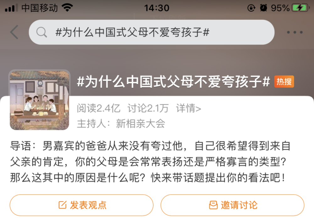 前几天,微博上的一条热搜吸引了我#为什么中国式父母不爱夸孩子# 原来是在综艺节目里,一位男嘉宾提到自己的父亲从来不夸自己,自己特别希望得到父亲的肯定。 主持人孟非有感而发: 他提到"中国式父母不爱夸奖自己的孩子",尤其是严肃的父亲,总是居高临下地坚决不夸,似乎是契合了传统观念中的"严父"的形象。 作为父母,我们会给孩子最初的无条件积极关注,满足孩子心理上的发展需求。 被满足好的孩子在父母那里得到的是喜爱和欣赏,长大了会自信热情。 没有被满足的孩子在父母那里得到的是忽略和批评,长大了会自卑消沉。 不被父母肯定的孩子有多惨?不被赞赏的孩子,一生都可能深陷在自卑的漩涡里。 为什么有的父母不爱夸孩子? 一是含蓄不善表达;二是害怕孩子因此骄傲自满;三是父母的父母就是那么教育他们的,他们也并不知道什么是正确的教育方式。 心理学家詹姆斯曾说过:“人类本质中最殷切的要求是渴望被肯定。” 每个孩子对自己的认知,很大程度上取决于父母对他的评价。为人父母,就是要不断向孩子传递注重过程和成长的信息。 因为在中国的传统文化里,谦虚,内敛才是正理。 我都三十好几的人了,家里长辈还是经常把“低调做人,高调做事”这句话挂在嘴边,告诉我千万不要沾沾自喜,不管有什么成就都要继续努力。更何况是对年幼的孩子了。 对孩子的教育,适当的表扬和鼓励是必不可少的。其实,不仅仅是小朋友,大人们也是需要表扬和鼓励的。 打压式教育要不得 当然也有对孩子夸赞的家长,但更多的是严要求高标准,拿自己孩子的短处跟别人家的长处比: 你看谁家孩子考100分,你只有85分。 你看人家孩子钢琴八级都过了,你还连曲子都弹不利索。 父母总觉得孩子永远有不足,而不轻易认同孩子的优点。总是把孩子说的一文不值,做好了也不会夸奖,生怕说你几句好,你就飘起来。 可是一昧否定孩子对孩子成长没有好处,鼓励和表扬很有必要。 还有的父母不仅从来不夸,生怕孩子骄傲,还擅长批评和泼冷水式的打压教育。 打压就是打压 它永远不会变成激励孩子的动力。 如果父母总是贬低孩子,不给孩子充分的肯定,孩子对自己的接纳度就会变低,总觉得自己不够好,不肯定自己的优点,就会变得自卑。 当他们长大后,内心就会有“不配得感”,他们会在遇到机遇时犹豫、纠结,觉得自己不配拥有。 这样孩子很容易变成讨好型人格。 学会明智的表扬方法 1. 描述具体的事实和感受 很多人表扬孩子就只会“宝宝真棒”“你真厉害”这样笼统的词句。避免用带有笼统评价含义的词汇,只具体描述事实,描述我们的感受就可以。这对父母是一个挑战,因为比笼统说一句“真棒”“真好”要费心地多,需要父母去仔细观察,倾听,体会,然后再具体描述事实和感受。 例如:孩子经常玩完玩具后忘记收拾。当他在你的提醒下主动收拾好玩具,你就可以这样说:“哇,宝宝把玩具柜收拾地很整洁,玩具们都乖乖地呆在自己应该呆的地方,很整齐。” 或“我看见你自己穿好了衣服,衣服扣子也没有系错,自己的事情自己做,是个小大人啦!” 当父母用赞赏的语气描述出眼睛看到的事实后,其实是父母通过描述来肯定了孩子的努力,而不是笼统的夸奖,让孩子自己也能够认可自己的努力,带来继续努力的勇气和动力。 2 .夸具体,有针对性地表扬 要具体针对孩子做的一件事情上进行表扬。 比如对孩子说“今天宝宝刷牙很认真,没有马虎,牙齿一定会越来越健康的。要继续保持哦!”或者“谢谢宝宝今天帮爷爷拿报纸,爷爷很开心。” 这样有针对性的表扬会让孩子更容易理解,并且知道今后应该怎么做,怎么努力,方向感更强。 3.要注意孩子的进步和努力,而不是结果 举个例子,孩子想用积木搭建一座火车站,但是搭来搭去也没搭好。这件事的结果就是,搭建火车站失败了。 很多父母只能注意到这个结果,说,这么简单都做不到,是不是有点笨啊? 像这种评价,就属于只是评价了孩子的人,而没有去评价孩子的具体行为。这种做法是错误的。 孩子为了能搭好积木,来来回回实验了好几次,换了好几块积木。在这个过程中,他们不怕失败,锲而不舍,一直在努力的不放弃。 这个不断努力的过程,才是父母应该关注的,也是值得父母去鼓励的。 再比如,孩子想帮你擦地板,可是因为不小心碰到了水桶,水洒了一地。那地没擦干净,到处是脏水是这件事的结果。 而实际上是,孩子一直在认真地想把地板擦干净。这才是父母要去注意和鼓励的过程。 所以,跟孩子说一句:刚才你一直擦得很认真,也很努力,前面那边的地板也擦得很干净,妈妈都看到了。有你帮我我也很轻松,碰到水没关系。下次我们把水桶放在远一点的地方不就ok了吗? 说这句话,不难。但是,对孩子来说这句话真的是寒冬里的暖流,通过这样的做法父母传达给孩子的就是:犯错误和失败,是学习的大好机会。再试一次不就可以了嘛。 4.不要拿你家孩子和别人家的孩子做比较 即使是同龄人,也存在很大差异。有的人擅长画画,有的人擅长音乐,有的人内向,有的人外向。 不要总拿自家孩子缺点去比较别人的优点,然后企图用存在的差距对孩子进行激励。很可惜,这不是激励,而是压力。 这种做法会让你家孩子觉得:别人做得好,我做得差。我总是比不上人家。 想比较的话,应该让孩子自己跟自己比。 如果他以前做事不专心,现在变