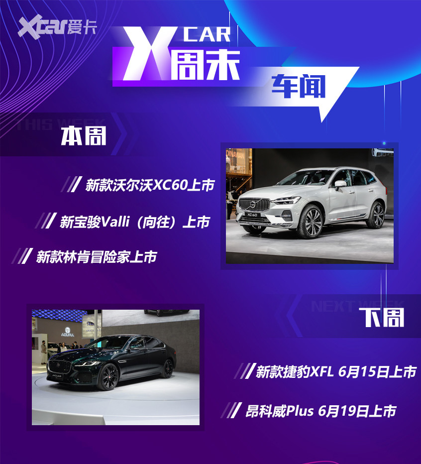 又到了周末,爱卡汽车新一期的周末车闻也如约而至。本周国内上市的新车较多,主要一个原因是因为本周六有重庆车展,其中重量级的车型包含了宝骏Valli旅行车、吉利星瑞时空版、新款沃尔沃XC60、路虎新款卫士110、长城火炮、新款林肯冒险家、长安福特锐际PHEV、2021款欧蓝德、传祺M8四座版/福祉版等。而在下周,新款捷豹XFL、昂科威Plus等车型也将与我们见面。闲话不多说,下面就跟我们一起回顾一下本周车市重点事件。 本周重点新车回顾 车型:新款沃尔沃XC60 售价区间:37.39-60.39万元 6月11日,新款沃尔沃XC60正式上市,售价区间为37.39-60.39万元。新车依然保持着经典的家族式设计风格,具有极高的辨识度,内饰方面也是针对科技感方面进行了提升。在动力方面,搭载全新的2.0T+48V电机组合而成的轻混系统。 沃尔沃 沃尔沃XC60(询价模块,请勿手动编辑,如需删除,请在图片上右键删除询价) 外观方面,作为中期改款车型,新款沃尔沃XC60在外观方面依然保持着经典的家族式设计,针对细节处进行调整,从而使新车看起来更加时尚,符合当下消费者审美。新车的进气格栅由银色镀铬竖条变为内嵌黑色,外部采用了银色的镀铬包裹设计,车头的Logo采用了实心镜面的设计,放弃了现扁平镂空的设计。两侧的大灯组采用了“雷神之锤”的设计,T型的日间行车灯辨识度极高,全LED大灯内部采用了上下各三颗矩阵式灯组,这样的设计更加简洁、时尚。下侧的银色镀铬装饰条贯穿了整个保险杠,保险杠的造型更加简洁,整体取消了更多繁琐的线条,相比现款车型更具豪华感。 从车身侧面来看,新款沃尔沃XC60与现款车型基本保持一致,车身比例协调,保持着优雅大气且充满力量感的设计风格。新车的轮圈采用了全新的多条辐设计,采用了黑色+高亮银色拉丝搭配。 在尾部方面,新款沃尔沃XC60变化不大,采用了隐藏式的排气布局,采用了最新样式的“维京之斧”尾灯组,内部使用了横向展开的线条,进一步拉伸了尾部的视觉宽度。 在内饰方面,首先来看,沃尔沃XC60的内饰并不是简单的堆砌用料,而是营造了一种来自北欧的豪华氛围,新款沃尔沃XC60全系标配电子换挡,低配以及运动款车型采用了皮质换挡杆,豪华版车型配备了Orrefors水晶电子换挡杆,造型极其精致。新款沃尔沃X60全系标配12.3英寸液晶仪表盘,并且配备了9英寸中控屏。 中控屏内部系统升级为原生安卓系统,搭载了英特车规级四核CPU车载芯片,响 应更快,功能更强大,运行更安全。语音助手来自于科大讯飞,智能方面得到了进一步提升。值得一提的是,新车配备了宝华韦德Bowers&Wilkins音响,这套音响拥有15个扬声器,1100W功率。 动力方面,新款沃尔沃XC60搭载的2.0T高低功率版本发动机(B4/B5)均配备了48V轻混系统,其中B4动力最大功率145kW(197马力),最大扭矩300Nm。B5动力最大功率184kW(250马力),最大扭矩350Nm。插混版的T8车型最大功率288kW(390马力),峰值扭矩达到了640Nm。 车型:吉利星瑞时空版 售价区间:13.27-15.27万元 6月11日,吉利星瑞时空版正式上市,包含两款车型,售价区间13.27-15.27万元。主演过《夏洛特烦恼》、《飞驰人生》、《鬓边不是海棠红》等知名影视作品的演员尹正成为星瑞时空版代言人。 作为新增车型车型,星瑞时空版沿袭了星瑞车型的设计,针对细节处进行了调整:进气格栅及车尾标加入黑色装饰件,大灯及尾灯采用熏黑处理。相较普通版车型,星瑞时空版看起来更具运动气息。 吉利 星瑞(询价模块,请勿手动编辑,如需删除,请在图片上右键删除询价) 车身侧面,一根自翼子板延伸至尾灯的腰线赋予了车辆更强的俯冲感,并让车身侧面线条更为流畅、动感。全黑涂装的后视镜以及新样式轮圈都进一步增强了星瑞时空版的运动气息。 来到车辆尾部,星瑞时空版对尾灯及尾部字标都采用了熏黑设计,视觉效果更为出色。新增的熏黑处理扰流板非常吸引眼球,双边四出排气采用了椭圆样式,搭配黑色下护板,整体战斗气息非常浓郁。 来到车内,星瑞时空版采用了全新的悬浮能量设计,座椅、门板、车顶等处均覆盖了大面积的意大利进口Alcantara麂皮,无论是视觉还是触觉上都有了较大的提升。并且,星瑞时空版还在座椅、中控、门板等各处增加了极光绿缝线装饰,增加了车内的运动氛围,与外观上的调整相呼应。 中控台副驾驶前方位置与车门板上还采用了星河镭雕3D设计,不规则排列的几何图案搭配银色饰板与麂皮材质呈现出强烈的视觉冲击力。 动力方面,吉利星瑞时空版依旧搭载现款车型的2.0TD发动机,匹配7速湿式双离合变速箱。 星际领航电子挡把的顶部也采用麂皮材质进行覆盖,让每一次的换挡都成为一种享受。 在配置方面,星瑞时空版搭载整车OTA云端升级系统、L2级自动驾驶技术系统等配置,还配备了上帝之眼540°透明底盘、7.5英寸全彩HUD抬头显示、RPA手机遥控泊车、BOSE高级音响系统、世界顶级车载香氛系统等。 新款沃尔沃XC60/吉利星锐时空版 车型:新宝骏Valli(向往) 售价区间:7.98-10.58万元 6月10日,新宝骏品牌旗下的全新休旅车Valli(向往)正式上市,售价区间为7.98-10.58万元。Valli作为RC-5W的继任者,采用了“星际几何”家族设计语言,在动力方面新宝骏向往全系搭载1.5T发动机。 RC-5W的继任者 新宝骏 宝骏Valli(询价模块,请勿手动编辑,如需删除,请在图片上右键删除询价) 外观方面,新宝骏向往造型与已停产的新宝骏RC-5W基本保持一致,包括车身