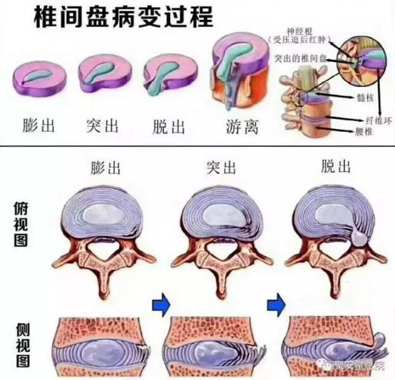 有一种悲伤,叫做“哪儿都不突出,只有腰椎间盘突出”。 目前,在我国,腰椎间盘突出的发病率约为18%。而且,此病正以惊人的速度年!轻!化!20-40岁的患者,已经占据患病人数的60%以上。 一、什么是腰椎间盘? 这腰椎间盘看也看不到,摸也摸不着,究竟是个啥呢?它怎么就突出了呢? 上图的蓝色部分就是腰椎间盘 人体有5根腰椎,椎间盘位于腰椎的中间,起缓冲作用。有了腰椎间盘的存在,我们的脊柱活动范围才大大加大,我们才可以做弯腰等动作。 所以,腰椎间盘可以理解为上下两个腰椎之间的“保护垫”。 腰椎间盘由髓核、纤维环和软骨终板三个部分构成,当受到不良体态、错误运动方式等因素影响时,纤维环开始退化、破裂,使髓核开始向外膨胀、突出,形成腰椎间盘突出。 二、腰椎间盘突出有哪些症状? (1)腰痛:是大多数患者最先出现的症状。腰痛的原因是由于突出的髓核刺激到了后方的神经。 (2)坐骨神经痛:90%以上的腰椎间盘突出患者是腰4-5,腰5-骶1的间隙突出,所以,容易刺激坐骨神经,发生率在97%左右。 典型的坐骨神经痛表现为:从下腰部向臀部,大腿后方,小腿外侧直到足部的放射痛。约60%的患者在咳嗽或喷嚏时会有疼痛加重。 (3)马尾神经受压:见于脱垂游离型,表现为大/小便障碍。 三、哪些动作容易 引起腰椎间盘突出? (1)久坐:一个姿势长时间固定,腰椎间盘长时间承受某一方向的压力,时间久了,腰椎间盘就会受损。 (2)错误动作:腰部反复弯曲、扭动、都容易造成椎间盘的损伤,使其突出,比如日常的一些不良习惯: (3)过度负重:当腰部负荷过重,可能导致椎间盘纤维环破裂,这也是为什么举重运动员、建筑工人等重体力劳动者是腰椎间盘突出症高发群体的原因。 (4)腰椎退行性改变:随着年龄的增加,腰椎自然会出现退变。 (5)潮湿环境:腰椎长期处于阴冷潮湿,可引起小血管收缩肌肉痉挛使椎间盘的压力增加,也可能造成退变的椎间盘破裂。 (6)肥胖:肥胖使腰部负荷过重。亚洲人肥胖患者通常都是中心型肥胖,也就是肚子胖。除了本身脂肪组织多的原因外,腹部的重量也让腰部负荷过重,加速腰椎的病变,从而更容易得腰椎间盘突出。 四、腰椎间盘突出怎么治疗? 非手术治疗是大多数腰椎间盘突出病人一线治疗,包括休息、物理治疗、中医传统疗法、药物治疗等。 (1)一般治疗:急性发作期需卧床休息,但不主张长期卧床,鼓励进行适当的、有规律的日常活动,活动时可佩带腰围。 腰椎间盘突出的病人根据情况可进行牵引、推拿、按摩等一般治疗。 (2)药物治疗:对乙酰氨基酚、非甾体抗炎药(如布洛芬、塞来昔布、依托考昔等)、离子通道调节剂(如加巴喷丁、普瑞巴林等)、曲马多、阿片类药物、脱水药物(甘露醇)、糖皮质激素、中枢性肌肉松弛剂(乙哌立松、氯唑沙宗等)、神经营养剂、改善微循环及中药等药物,对腰椎间盘突出都有一定的疗效,这里需要注意,一定要到正规医院诊疗后由医生开具处方使用药物,切不能自行使用药物。 (3)微创手术与治疗:包括软组织松解术、注射治疗、射频热凝术、经皮椎间盘臭氧消融术、经皮椎间盘等离子消融术、经皮低能量激光椎间盘修复术、经皮椎间盘胶原酶化学溶解术、经皮椎间盘旋切术、经皮脊柱内镜腰椎间盘摘除术。微创手术与治疗的目的是缓解疼痛和(或)神经损害症状,而不是治愈椎间盘退变和逆转椎间盘突出。 (4)手术治疗:经严格正规的保守治疗无效且无法用微创技术处理时,可以考虑手术治疗。 (5)物理治疗:包括牵引疗法、体外冲击波、中低频电疗、高能量激光治疗。 五、如何预防腰椎间盘突出? (1)不要久坐久站:坐30分钟,起来活动一下,放松一下腰部肌肉,减轻同一角度引起的腰椎间盘的压力。 (2)不要长时间弯腰:某些工作需要长期弯腰用力的,腰椎间盘承受压力较一般站立时增大!因此,长期弯腰工作的椎间盘突出症的发病率亦高。尽量避免长时间的弯腰,适当的休息,间歇工作。工作很重要,保护好腰椎间盘更重要哦。 (3)保持正确的姿势:改变日常生活的一些使腰椎受累的不良姿势,如躺在软沙发上看电视、直接弯腰搬重物等。 (4)适当的腰背肌功能训练:比如猫式拉伸,五点支撑,游泳等。 (5)避免剧烈运动,避免外伤:剧烈运动同样会使腰椎间盘突出者破裂的纤维环伤口撕裂,加重突出。特别是在腰椎间盘突出的急性期的患者,禁止剧烈运动。 (6)选择中等硬度的床垫:我们正常脊柱有一个“S”形的生理弯曲度,睡觉的时候姿势不好、枕头过高、床垫过软或者过硬,都不利于脊柱的生理弯曲度。 (7)控制体重。 (8)注意保暖。 ( A& E6 Z& z; G$ X2 }% W% r