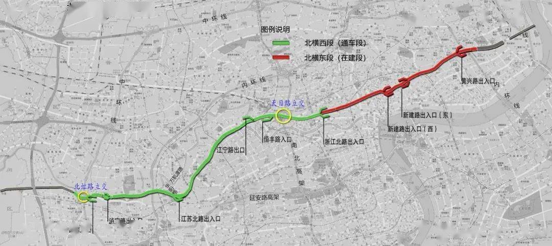 该工程于2014年开工,其中北虹立交部分匝道、天目立交部分匝道和隆昌路下立交已先期通车,目前, 北横通道西段主线(北虹路立交-天目路立交文安路接地点)已竣工,计划于近期开放交通,剩余东段工程预计2023年底前竣工通车。