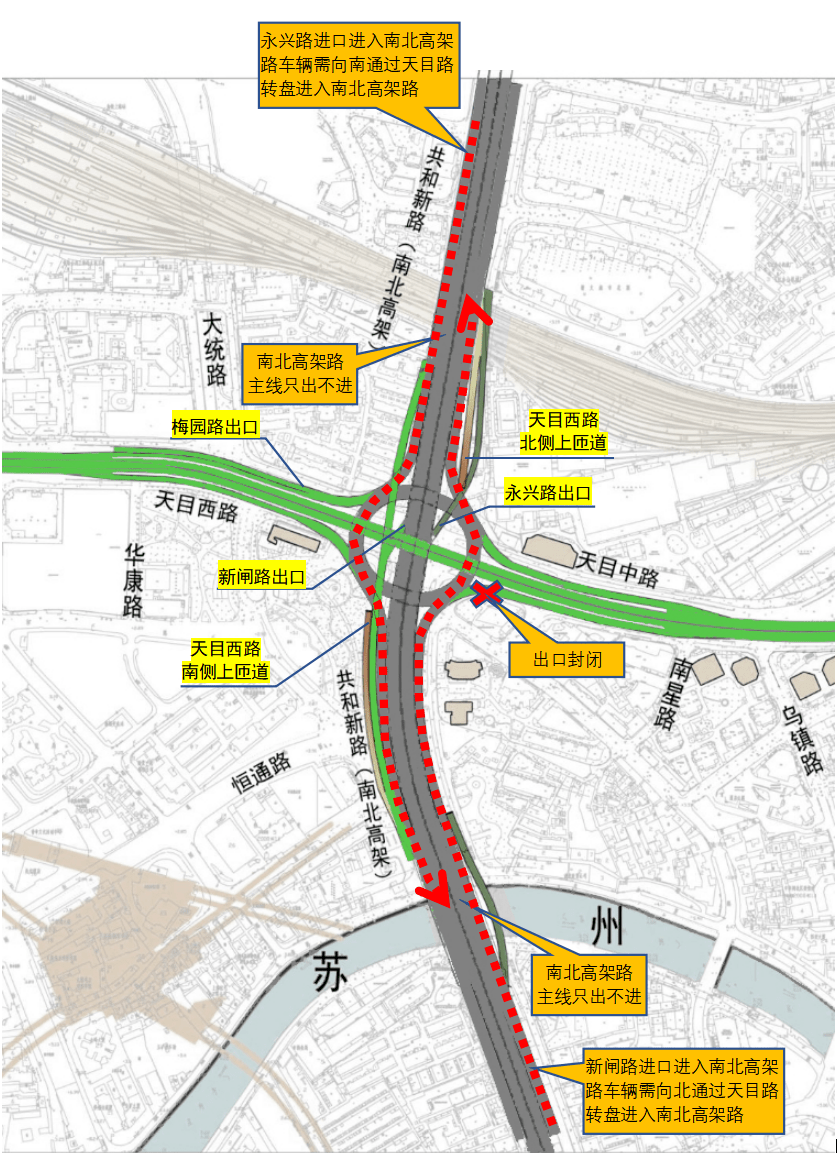 3、天目立交范围内南北高架主线段东西两侧将进出交通剥离,主线采用只出或者只进的形式,同时,南北高架往北横通道东向的匝道此次不开通,请车辆通过地面绕行。