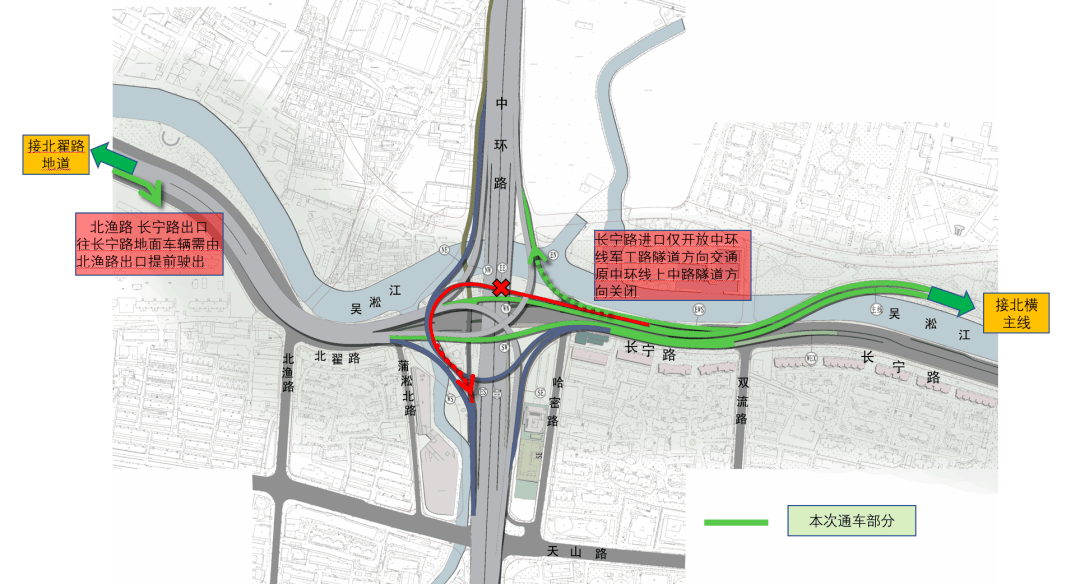 2、北虹立交取消长宁路上匝道进入北横通道和中环线外圈(上中路隧道方向),仅保留往中环内圈(军工路隧道方向)的功能,北翟路地道西向东方向往长宁路下匝道的车流需提前从北渔路出口驶出。