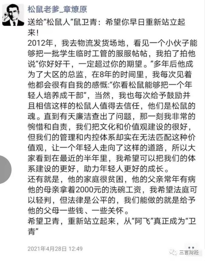 三言财经注:蒋某在公司花名为“鼠卫青” 章燎原写到,自己见证了蒋某在公司的成长,并对其抱以厚望。然而当出现廉洁问题时,章燎原感到惋惜,公司的文化和价值观建设的很好,但是管理和内控体系却没能匹配这种价值观,导致让一个年轻人走上这样的道路。 章燎原还透露,蒋某家庭很贫困,其父亲常年生病;母亲依靠2000元的洗碗工资养家糊口。章燎原表示希望法庭可以轻判,但法律是公平的,公司会给予蒋某家庭物质和精神关怀。