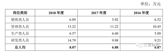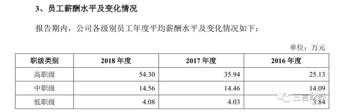 根据三只松鼠递交的招股书中数据显示,公司2018年高职级员工平均年薪54.3万元;中职级14.56万元;低职级4.08万元。