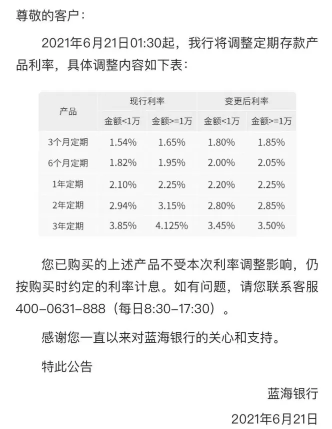 银行年中“揽储大战”熄火?存款利率生变,揽储利器相继失效。 临近年中,“揽储大战”却并未打响。 中国证券报记者日前走访调研多家银行网点了解到,以往在季末会蠢蠢欲动的存款利率今年不升反降,经常以高息存款吸引客户的民营银行APP上,也很难见到年利率4%以上的存款产品。 01 揽储利器失效 记者了解到,当前存款利率自律上限确定方式已调整为在存款基准利率基础上加上一定基点确定,多家银行已明确下调1年期以上定期存款利率。 北京市西城区某国有大行客户经理告诉记者,该行从周一起调整了定期存款利率,目前3年期定期存款年利率为3.25%,3年期、20万元起存的大额存单年利率为3.35%。“我行之前同类型的定期存款和大额存单年利率分别为3.85%和3.987%,建议您转变投资方式,分散投资,如果单纯靠定期存款收益太低了。”他说。 某城商行客户经理介绍,目前该行已经调降了大额存单利率,目前20万元起存,1年期、2年期和3年期的大额存单利率分别为2.25%、2.9%和3.55%。“目前短期理财没有特别合适的产品,如果期限在1年以内,我们更推荐买结构性存款,年化收益率约在3.4%左右。” 随着存款市场秩序逐步规范,保本理财产品、靠档计息产品、结构性存款、互联网平台存款等揽储利器相继迎来严监管,银行此前的揽储利器一一失效。 以往常常以高息存款吸引客户的民营银行近期也纷纷下调了1年期以上的存款利率。记者浏览多家民营银行APP发现,此前常见的5年期、年利率4.8%以上的存款产品均显示已售罄,4%以上的存款产品已很难见到。 例如,蓝海银行6月21日公告称将调整定期存款利率,已购买的产品不受影响。其中,3个月和6个月定期存款年利率有所调升,1万元以下、1年期的定期存款年利率由2.1%调至2.2%,1万元及以上、1年期的定期存款年利率维持2.25%不变。2年期和3年期的定期存款利率均有所下降,其中,调整幅度最大的是1万元及以上、3年期的定期存款年利率,由4.125%降至3.5%。 来源:蓝海银行APP 一度被认为是保本理财替代品的结构性存款,在经历整顿后,规模仍在持续压缩。央行数据显示,截至5月末,中资银行结构性存款规模为6.35万亿元,今年在经历小幅回升后再度跌破去年末的水平。融360大数据研究院报告显示,5月份发行的人民币结构性存款平均预期最高收益率为3.55%,环比下跌5BP。 02 负债端压力长期存在 专家认为,存款利率自律上限确定方式调整有助于打击银行高息揽储行为,但在存款利率降低的同时,银行揽储的难度随之加大,存款竞争压力仍然存在。 中金公司固定收益首席分析师陈健恒分析,调整后大额存单、协议存款等利率降幅更大,考虑到大额存单、协议存款多为中小行揽储的工具,因此中小行受到的影响可能更大。对于大行和头部股份制银行而言,缓解银行负债端压力的方式和工具相对丰富,面临的存款分流压力也相对较小。相比之下,中小行尤其是城商行,吸存压力一直较大,更依赖高成本中长期存款客户的拓展,叠加此前监管部门禁止地方法人银行异地吸存,城商行负债管理压力可能会进一步抬升。 “自去年结构性存款受到监管压降以来,银行的稳定性存款(定期存款+结构性存款)增长难度加大,尤其是中小银行,同比增速下降明显。”中信证券固定收益首席分析师明明表示,今年以来,“存款搬家”现象仍然严峻,如果存款利率进一步降低,则意味着对于储户的吸引力下降,可能流失更多长期存款。 因此,后续银行还需要从其他方面提高软实力,如存款是否便利、网点是否充足、网银或手机银行操作是否快捷、用户体验是否更好。