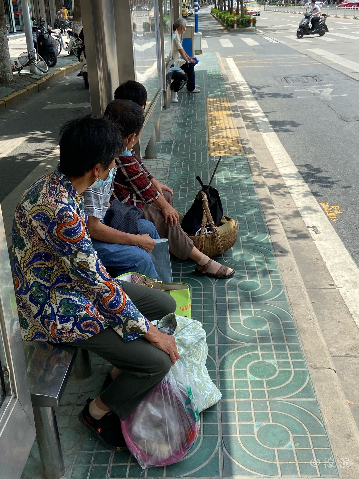 在市区等公交车的南通市民的随身行李 |