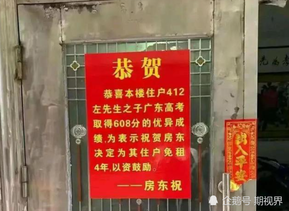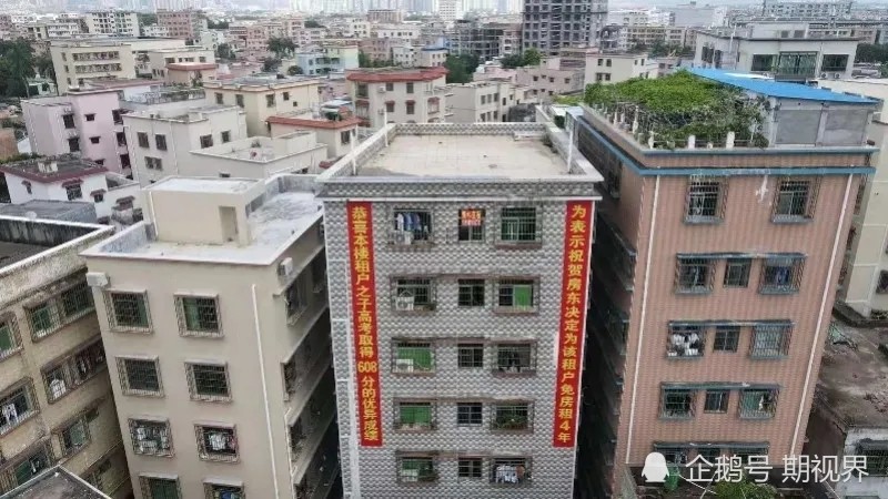 事情是这样的,近日是广东省高考成绩放榜的日子,房东张先生的一家租户的孩子取得608分的优异成绩,房东张先生为了表示祝贺,决定为其一家免去4年的租金,张先生还在自建楼外墙上挂出巨型条幅,楼的大门上也贴上了红底黄字的恭贺告示。