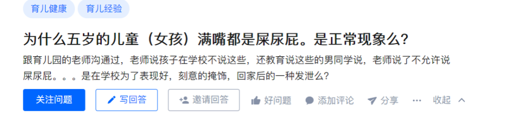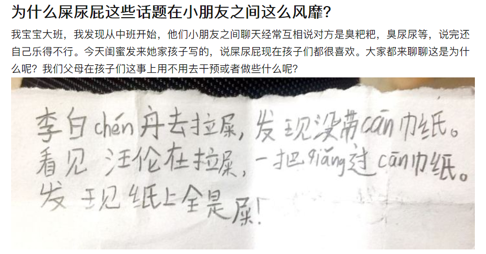 “刚刚是不是有人在放屁呀。”前不久,朋友向我吐槽她的带娃趣事。当带着孩子去朋友家做客,一个长辈放了一个屁,孩子却对此有了兴趣。不仅不停地问,是谁放的屁。还会学着放屁的声音,说着“好臭好臭”。弄得她十分尴尬。 这让我想起,就在前不久,我带着4岁的儿子去朋友家做客。 面对桌上的一碗南瓜粥,他突然大声喊道:“啊,黄黄的,就像是大便!” 还没等我反应过来,朋友家6岁的孩子又跟着起哄:“你要是吃了,就是吃屎了,有没有闻到屎味啊?啊哈哈。”我儿子听到这句话,更是嘻嘻哈哈笑起来,还学着发出放屁的声音:“噗噗噗,噗噗噗” 上网一查,我发现这并不是个例。 在孩子3岁之后,太多孩子就喜欢把“屎尿屁”挂在口中。 很多人家长都会很疑惑:为什么不说话时,大人们觉得他可可爱爱。可,一说话不知道怎么的,全是关于屎啊屁啊的词语? “小朋友为什么喜欢屎尿屁?” 其实,著名心理学家弗洛伊德早就定义了这个特殊的阶段。他把性心理个体发展划分成了5个阶段,其中3-6岁是第三阶段的生殖器期。 这个时期的孩子会认为“所有的排泄都是快感”。处在这个阶段的孩子,开始对“屎尿屁有”有了兴趣,对诅咒性词语或脏话也异常敏感。这个阶段,在心理学上被称为“诅咒敏感期”。因为开始学着用各种词语表达自己了。 于是,他们开始着迷于从这些特别的词语中发现别样的快乐。 最典型的,就是“屎尿屁”:这个菜就像是臭粑粑……这个样子就像是在尿尿……放屁好丑啊……屁股好大啊…… 孩子甚至会在这个阶段进行一些组合创作。比如突然说一句:“屁股股”“吃个屁股饭”又或者“汽车大便”“飞机大便” 所有的“外星语言”都被统统都组合在一起。 除了屎尿屁类,孩子也会把“脏话”挂在了嘴边。比如说一句:“你这个臭妈妈!” 孩子的狠话还会因为接触的词语越来越多后,开始升级。 比如儿子有一次生气了,竟然说:“我就要把你打得稀巴烂!可说完后,他又会问我:“稀巴烂是什么意思?” 你可能会有些疑惑:原来,孩子并不知道这些话的真正含义,可他们又怎么会爱上说这些词呢? 《儿童行为心理学》一书中曾写到: 当孩子疯狂地学习语言、运用语言时,他们就会特别钟情于各种“脏话”和“狠话”。当孩子发现语言本身是有力量的,尤其是有些话能够像利剑一样刺伤别人时,就会使用强而有力的语言来试探、发展自己的力量,观察别人的反应。 也就是当孩子处于“诅咒敏感期”的时候,孩子不断使用这些有魔力的词语,来激发听者的反应,是为了体验“自己好厉害”的错觉。 对孩子来说,他并不是真心要“诅咒”我们。 只是,他碰巧发现了这句话的力量,于是就想去实践一下。简而言之,这一切都是孩子正处于探索自我的阶段。 孩子们最爱干的这些“坏事” 其实是他们的社交工具 你恐怕想不到,全世界的孩子在“屎尿屁”这点上都有着相同的喜好。 就比如曾经有个妈妈就很疑惑:为什么屎尿屁这些话题会在小朋友之间很风靡? 有一次,我朋友也向我吐槽,她发现了四岁的孩子自造了新奇古怪的脏话,“莫名骄傲”地向班上的同学分享。说完后,两个人还靠得很近,一起笑得可欢了。 其实,“屎尿屁”的话题,也是孩子独特的社会交往方式,是两个不熟悉的孩子互相“确认同伙”的手段。 有一次,我带着4岁的儿子回老家过年。在远房亲戚家,遇到了一个5岁的孩子。 孩子们第一次见面,两个人显得很生疏,都不说话。可我没想到,最后却是一个“屁”的响声,让两个孩子笑成了一团。 也因为这个屁,两个孩子迅速熟络起来,一边玩一边说着悄悄话。一个小小的“屁”字,功效实在是非常神奇。 简 尼尔森在《正面管教》一书中提到: 孩子的行为背后有其行为目的和观念,但孩子意识不到,那是隐藏的“密码”。 成人要做的是识别出这些行为背后的目的,进而有效地帮助孩子改变某些行为。 两个年龄在3-6岁之间的孩子,究竟为什么能靠“屎尿屁”来交友呢? 从心理学上来说,“屎尿屁”这类私密的话题,处在“禁忌词语”和“正常用语”的交界线上。一旦使用,便能激起孩子某种趣味相投的“幽默感”,瞬间拉进孩子的距离。 “竟然你也知道!”“我们都会说这个,我们是一样的!”“我们是一伙儿的!” 在团体里的孩子,如果都会一个词汇,或者一句话而有相同的感受,那则会更容易让孩子融入这个集体。 所以,如果当你看到两个孩子在一起比赛尿尿,看谁尿得远...甚至拉着小伙伴围着自己的大便观察,比较谁拉得粑粑更长时。其实,不必惊讶。 这都是一种识别“友军”的暗号: 要是你也和我一样做这个事情,那你就和我一样“有趣”了。 做自己身体的小主人正确认识有味道的“屁”在绘本《呀!屁股》里,作者用了动物和人类的屁股做了开头。花了很多笔墨描述了自己4岁的孩子对自己屁股的极度好奇,以及如何做观察和探索的故事。 作者的描述十分平静,对于孩子的行为也十分淡定。四年后,当孩子大了一些,我才感受到这本书的神奇力量了。原来,很多带着在世俗、道德里并不很受“欢迎”的词语对孩子而言,ta只是在客观地表达,不带任何感情色彩。 当孩子满嘴“屎尿屁”时,要知道这是自然而然的发展必经阶段,也需有智慧地对应: 1、读绘本,正确认识生理现象。孙瑞雪老师的《捕捉儿童敏感期》里说到:在孩子的“诅咒敏感期”,不单单是