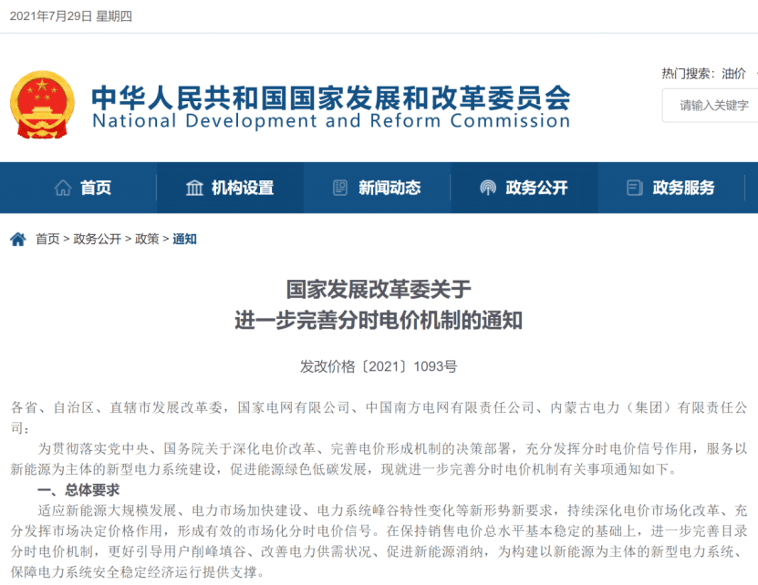 图源:图虫创意 本次进一步完善分时电价机制的最大亮点,就是合理拉大了峰谷电价价差,这为引导电力用户削峰填谷、促进储能加快发展释放了清晰强烈的价格信号。 7月29日,国家发展改革委发布《关于进一步完善分时电价机制的通知》,对现行分时电价机制作了进一步完善,包括优化峰谷电价机制、建立尖峰电价机制、建立健全季节性电价机制和丰枯电价机制、明确分时电价机制执行范围、建立动态调整机制以及加强与电力市场的衔接等。 发改委有关负责人指出,近年来,我国能源消费结构快速变化,用电负荷对气温变化更加敏感,电力系统负荷夏、冬两季尖峰化特征日益突出。据统计,各地夏季最热、冬季最冷时段的全年累计时间普遍低于60个小时,但对应的尖峰电力需求可较平时高出1亿千瓦以上,保障电力系统安全稳定运行面临更大挑战,去年以来部分地方已不得不实施有序用电。 该负责人表示,进一步完善分时电价机制,特别是优化峰谷电价机制、出台尖峰电价机制,有利于充分发挥电价信号作用,引导用户错峰用电,尽可能少地启动有序用电,保障电力系统安全稳定运行,降低经济社会运行成本。 同时,进一步完善分时电价,特别是合理拉大峰谷电价价差,有利于引导用户在电力系统低谷时段多用电,并为抽水蓄能、新型储能发展创造更大空间,这对促进风电、光伏发电等新能源加快发展、有效消纳,着眼中长期实现碳达峰、碳中和目标具有积极意义。 (截图来源:国家发改委官网) 六方面完善现行分时电价机制 《通知》主要从六个方面对现行分时电价机制作了进一步完善: 一是优化峰谷电价机制。要求各地结合当地情况积极优化峰谷电价机制,统筹考虑当地电力供需状况、新能源装机占比等因素,科学划分峰谷时段,合理确定峰谷电价价差,系统峰谷差率超过40%的地方,峰谷电价价差原则上不低于4:1;其他地方原则上不低于3:1。 二是建立尖峰电价机制。要求各地在峰谷电价的基础上推行尖峰电价机制,主要基于系统最高负荷情况合理确定尖峰时段,尖峰电价在峰段电价基础上上浮比例原则上不低于20%。可参照尖峰电价机制建立深谷电价机制。 三是建立健全季节性电价机制和丰枯电价机制。要求日内用电负荷或电力供需关系具有明显季节性差异的地方,健全季节性电价机制;水电等可再生能源比重大的地方,建立健全丰枯电价机制,合理确定时段划分、电价浮动比例。 四是明确分时电价机制执行范围。要求各地加快将分时电价机制执行范围,扩大到除国家有专门规定的电气化铁路牵引用电外的执行工商业电价的电力用户;对部分不适宜错峰用电的一般工商业电力用户,可研究制定平均电价,由用户自行选择执行。 五是建立动态调整机制。要求各地根据当地电力系统用电负荷或净负荷特性变化,参考电力现货市场分时电价信号,适时调整目录分时电价时段划分、浮动比例。 六是加强与电力市场的衔接。要求电力现货市场尚未运行的地方,电力中长期市场交易合同未申报用电曲线或未形成分时价格的,结算时购电价格应按目录分时电价机制规定的峰谷时段及浮动比例执行。 合理拉大峰谷电价价差 谈及现行分时电价机制存在的问题,发改委有关负责人指出,当前,我国新能源装机规模不断扩大,电力消费结构加快变化,用电负荷呈现冬夏“双高峰”特性,电力生产侧与消费侧双向大幅波动,保障电力安全经济运行面临更大挑战,对进一步完善分时电价机制提出了迫切要求。 各地现行分时电价机制已实施多年,在形势明显变化后,存在时段划分不够准确、峰谷电价价差仍有拉大空间、尖峰电价机制尚未全面建立,以及分时电价缺乏动态调整机制、与电力市场建设发展衔接不够等问题,需要适应形势变化进一步完善。 因此,该负责人指出,本次进一步完善分时电价机制的最大亮点就是合理拉大了峰谷电价价差,这为引导电力用户削峰填谷、促进储能加快发展释放了清晰强烈的价格信号。合理的峰谷电价价差,对发挥电价信号作用、引导电力用户削峰填谷非常关键。 该负责人表示,此次完善,对合理设定峰谷电价价差提出了优化峰谷电价机制、建立尖峰电价机制两方面的要求。既可确保电力系统峰谷差大、安全稳定运行保障难度大的地方,能够形成有效的峰谷电价价差,引导用户在高峰时段少用电、在低谷时段多用电,并为抽水蓄能、新型储能等系统调节能力加快发展提供更大空间,促进新能源的生产和消纳。同时,也兼顾到了系统峰谷差相对小的地方的实际情况,避免不必要的拉大峰谷电价价差影响用户正常用电。 完善分时电价对企业、居民影响几何? 今年6月,中国政府网曾公开国家发展改革委答网民关于“建议完善居民阶梯电价制度,鼓励城乡居民多用清洁的电力资源”的留言。 发改委在回复中指出,长期以来我国试行较低的居民用电价格,居民电价较大幅度低于供电成本,是因为工商用户承担了相应的交叉补贴。与国际上其他国家相比,我国居民电价偏低,工商业电价偏高。 而此次进一步完善分时电价机制,对企业、居民用电又有何影响呢? 发改委有关负责人介绍,由于合理拉大了峰谷电价价差,高峰时段的电价会有所上调,低谷时段的电价会有所下调,能够错峰用电、在低谷时段多用电的用户用电成本会下降,在高峰时段用电的用户用电成本会有所上升,即