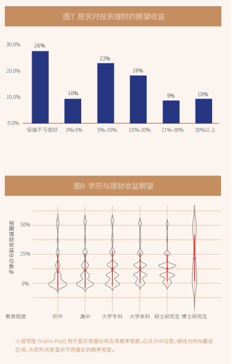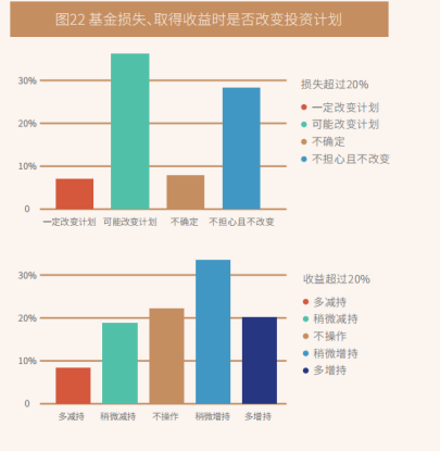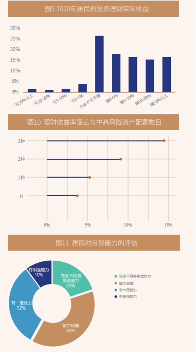 7月14日,上海交通大学上海高级金融学院(高金/SAIF)发布《中国居民投资理财行为调研报告》,报告显示,我国居民理财投资偏好相对保守,财务规划意识有待提高,负债整体可控,但部分存在负债管理的问题。值得注意的是,在投资理财行为上,居民对收益期望偏高,但居民实现的理财收益往往低于期望收益,同时,追涨杀跌现象在居民投资理财中普遍存在。 追涨杀跌现象普遍存在 2020年,股票市场的火热催生了基金销售的热潮。部分“千亿”规模的明星基金销售火爆,甚至产生了“日光基”。在这股基金销售热潮中,不乏一些非理性的投资现象。有些投资者像炒股一样炒基金,追涨杀跌,频繁申赎。大量的研究数据发现,投资者持有基金的平均时间非常短,且投资过程中存在追涨杀跌的现象。学术界将这种单纯因追逐历史业绩而流入基金的资金称为“傻钱”(dumb money)。这样的行为导致的现象是,尽管许多基金全年收益可观,但那些追涨杀跌的投资者却连零头都没有赚到。 上海高级金融学院学术副院长严弘称,从报告来看,我国居民投机型投资风格比较明显,长期的价值投资习惯尚未养成;同时,追涨杀跌现象在居民投资理财中普遍存在。数据显示,当面临损失超过20%时,35%的投资者可能会改变;当收益超过20%时,近50%的个体选择增持。 来源:《中国居民投资理财行为调研报告》 先锋领航投顾有限公司CEO张宇建议,包括投资机构、研究院在内的多方力量应帮助用户建立一个更好的投资行为,保持一个更好的投资规范,帮助投资者从“买”过渡到“投”。同时,金融机构应借助科技的力量做好适当性的管理,增厚个人的投资收益。 居民理财投资偏好相对保守 上海交通大学兼职教授、上海高级金融学院执行理事屠光绍表示,从风险管理意识、资产配置多元化、财务目标与规划、家庭负债管理等方面评估居民的财务健康度,我国大部分居民: 安排了家庭备用金或购买过保险,呈现一定的风险管理意识; 理财投资偏好相对保守,比较集中在银行存款; 财务规划意识有待提高,纪律性的财务规划习惯尚未养成和普及; 负债整体可控,但部分存在负债管理的问题。 具体上,居民理财配置最多的三类资产分别是:银行存款、公募基金和股票。有64%的受访者配置了银行存款类资产,配置比例最高;其次是公募基金,占比44%,对于公募基金而言,受访者最喜欢混合型基金。 值得注意的是,约8%的用户在配置最多的三类资产中同时选择了公募基金和股票。从类型而言,这部分用户可能会将投资集中配置在权益类资产上。 来源:《中国居民投资理财行为调研报告》 居民对收益期望偏高 《报告》显示,居民的投资收益期望、保险配置、投资期限、追涨杀跌、定投参与和专业投顾使用等理财行为发现: 居民对收益期望偏高,这在高学历群体中特别明显; 居民实现的理财收益往往低于期望收益; 居民多数认为自己不具备产品挑选能力或挑选能力较弱,特别是理财资产规模较小的群体; 居民偏好寿险类的保险产品; 不同收入来源、不同年龄段的群体对不同类型保险产品偏好不一样。 来源:《中国居民投资理财行为调研报告》 《报告》还显示,受访者的预期收益率似乎与其受教育程度相关,预期收益率随着教育程度呈上升趋势。其中,博士研究生学历组别的预期收益率最高,但是这个群体的内部差异化也很大。总体来说,高学历投资者存在收益期望过高的现象,这或许与高学历受访者对于自己的投资理财能力更自信有关。 期望收益和实际收益存在一定的落差 《报告》统计,虽然有40%的受访者抱有超过10%以上的收益预期,但2020年的实际收益实现超过10%的受访者只有32%;20%的受访者收益期望20%以上,而实际收益超过20%的受访者仅占16%。 从实际投资结果来看,受访居民的理财投资配置偏好比较集中,且相对保守,但有着较高的期望收益。也可以理解为用户并不清楚自己的风险意愿和能力所应该匹配的资产配置方法。在此情况下,更多地了解和评估自己的风险能力和意愿,同时了解资产配置中各类产品的风险等级和特点或许对居民增加风险收益的匹配度有所帮助。 来源:《中国居民投资理财行为调研报告》