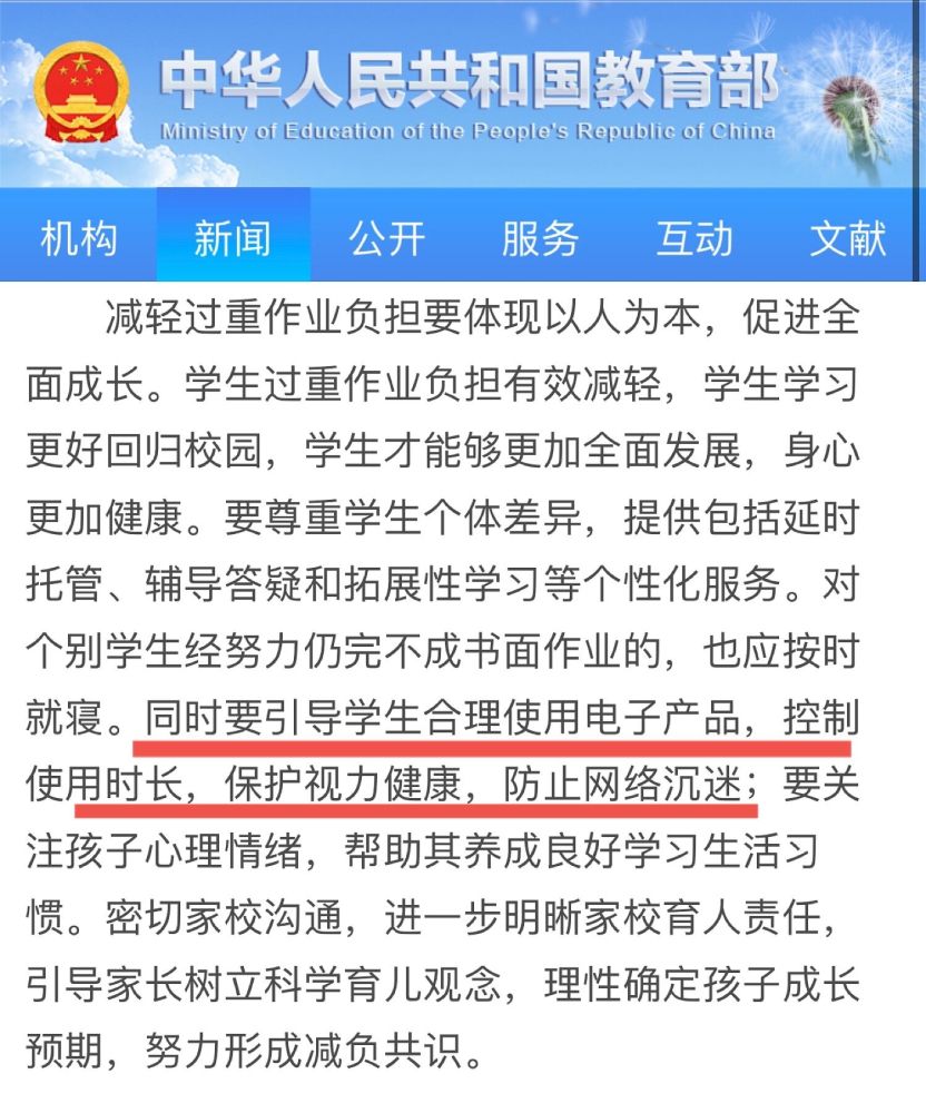 “双减”政策落地,学校就已经做出了支持政策的行动,给学生减轻作业负担,校外培训机构的补课班也被“叫停”,减轻学生校外补课的负担。 其实这个“双减”政策对校外培训机构来说并不是什么好事,因为校外补课班的老师面临着失业的窘境,而对于家长们来说,似乎也没有得到什么轻松,因为家长们另一个担心的问题来了。 很多家长发现,“双减”政策确实给孩子减负了,孩子作业少了,也不用去补课班,在家里看手机的时间就更多了,甚至是放假的时候整天沉迷游戏,让家长们很无奈。 其实“双减”政策中,对网络游戏也有了“警告” 双减政策中,明确说了要引导学生合理使用电子产品,这对于老师和家长来说责任重大,家长和老师们应该控制学生使用手机的时长,并且要防止学生沉迷网络游戏。 双减政策中,对学生使用电子产品的时间有了限制,明确表示防止学生“沉迷网络游戏”,相信家长们也清楚,下一个整治目标就是“网络游戏”。 对于家长们来说,“双减”政策的落地,孩子们减负有了希望,网络游戏也会得到该有的整治,突然感觉如释重负,家长们悬着的心也就放下了。 但即使对网络游戏整治,很多学生可能不玩游戏也会沉迷手机,对手机的总是“爱不释手”,实在让家长们担心,因为手机在学生的生活中,确实太耽误事。 手机对学生的影响太大 有50%的近视眼学生是因为电子产品导致的。 手机等电子产品就像是“精神鸦片”,让学生的精神消靡 有调查研究显示,70%的中小学生离开手机会有焦虑感,足以见得手机在中小学生们心里地位,学生过分依赖手机并非好事,周末放假在家,这些学生能看一天的手机都不知道饿。 电子产品就像“精神鸦片”一样侵害学生们的精神,消磨了学生们的意志,不用手机看网课,刷视频也能刷一天,这样浪费时间和生命,学生们不知不觉已经深受其害。 学生的视力下降与电子产品有很大关系 目前学生近视的情况很多,一个班级里,有80%的学生都会有不同程度的近视,不能说这些学生都是看电子产品导致的近视眼,也有的学生是因为学习导致的近视眼。 但这里面有50%的学生都是因为看电子产品等时间太长,沉迷网络,导致自己出现了近视眼,为了学生的视力,家长和老师也要尽量控制孩子们玩手机的时间。 网络游戏导致学生游戏成瘾,甚至一时脑热充了钱 学生沉迷游戏会上瘾,很多学生整天白天在学校上课,脑子里想的都是游戏,回到家就是玩游戏,有的时候家长没收手机后,学生也会趁着上网课的时间也偷偷玩游戏。 甚至会出现学生因为玩游戏,一时脑热,充了钱,而且大多数时候都是用家长的血汗钱,还有的学生会用家长的钱打赏主播,这样的行为不仅害了学生,也坑了家长。 网络游戏确实害人不浅,这一切的根源其实来自于电子产品,其实电子产品是一把“双刃剑”,可以给学生提供一个学习通道,但也会让学生沉迷网络。 所以说家长们应该从一开始就把控孩子使用电子产品的时间,要给孩子从小建立一个使用手机的好习惯,限制使用电子产品的时长,这样才能让孩子日后不沉迷于手机等电子产品。 家长应该正确引导孩子使用电子产品 从小就不要让孩子养成看手机的习惯 在孩子的小时候就尽量别给孩子看手机,尽量少接触电子产品,就会避免孩子对手机产生依赖性。 家长应该把控孩子的玩手机时长 每天要限制孩子玩手机时间,一个星期玩手机的时间不能超过3个小时,要从小开始控制。 除了上网课,其他时间手机需要上交 平时手机不能放在孩子手上,家长们要注意,除了上网课的时候,其他时间手机必须交给家长管理。 多带孩子接触外面的世界 平时休息的时候,尤其是现在学生减负后,在家里不想学习的时候就多去外面走走,开阔视野,减少看手机的时间。 结语: 其实在我看来,学生网络游戏要比校外培训季过后的补课班更应该得到整顿,因为网络游戏确确实实坑害了很多学生,沉迷游戏,不思学习,导致学生的思想发生改变。 家长和老师在日常生活中,应该严格把控学生看手机的时间,老师严格要求学生禁止手机进入课堂,家长们平时也要限制孩子玩手机的时间,适当的时候将手机收回,避免孩子沉迷手机,对网络游戏上瘾。