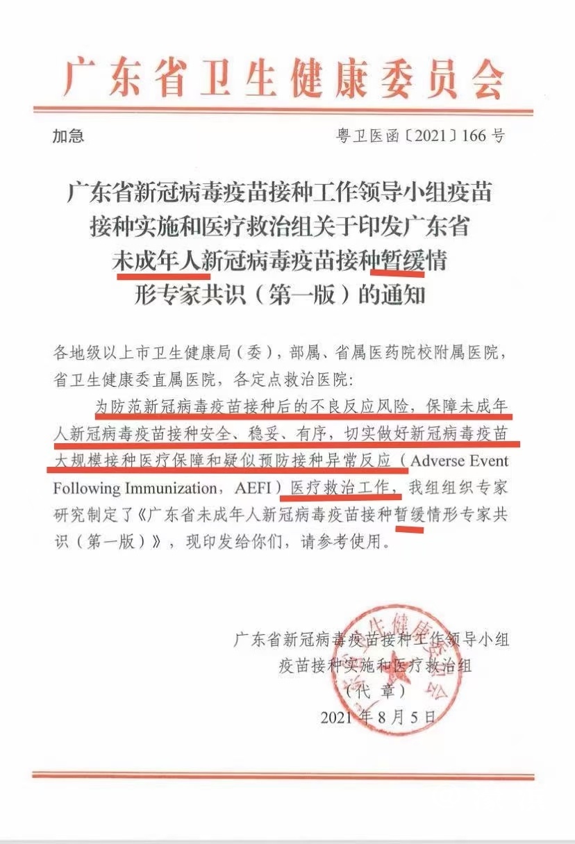 广东针对未成年人暂缓接种新冠疫苗的加急通知 |