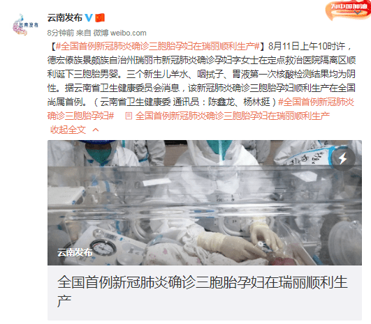 8月11日上午10时许,德宏傣族景颇族自治州瑞丽市新冠肺炎确诊孕妇字女士在定点救治医院隔离区顺利诞下三胞胎男婴。三个新生儿羊水、咽拭子、胃液第一次核酸检测结果均为阴性。 据云南省卫生健康委员会消息,该新冠肺炎确诊三胞胎孕妇顺利生产在全国尚属首例。 7月9日,瑞丽市中傣医院收治了一名特殊的新冠病人,患者是一名来自畹町的29岁初产妇,自然受孕异卵三胎,入院时刚满妊娠28周。“根据以往救治经验,妊娠晚期的新冠肺炎患者病情复杂,而且该病例为德尔塔变异株感染病例,确保孕产妇和新生儿得到及时、准确、有效的医疗救治迫在眉睫。”云南省卫健委副主任白松说,字女士入院后,国务院联防联控机制云南工作组及时安排国家、省、州专家联合会诊,云南省卫健委迅速调配省、州、市产科、儿科、呼吸等32名骨干赶往瑞丽,成立孕产妇多学科联合诊疗专班进行新冠肺炎治疗,防止早产,促进胎儿发育。 “7月10日至11日,专班人员迅速到位,相关设备、仪器和药物也连夜紧急调拨中傣医院,新生儿病房的消杀、设备仪器的调试等工作同步展开。专班组针对字女士呼吸循环功能评估制定了诊疗计划,对早产的预防和胎儿宫内安危情况监测等制定了工作预案和操作流程。同时,建立了专家早晚查房的工作制度,内科和产科医生24小时驻院、助产士24小时驻守病房,严密监测她的病情变化。”专班成员、昆明医科大学第一附属医院产科副主任医师陈卓表示,考虑到专班人员来自不同医院,专班组织了新生儿窒息复苏、转运、NICU救治等数次新生儿团队磨合演练。通过多学科讨论、联合查房、动态评估、量身定制诊疗方案的工作机制,实时监测她病情变化,积极处置情况。 7月12日,字女士病情发展为新冠肺炎重型。接下来的一段时间,经过专班的细心照顾和精心治疗,不再出现高热、早产先兆等情况,病情也从新冠肺炎重型转为普通型,并延长胎龄到32周。 有了孕产妇多学科联合诊疗专班保障,孕妇护理更得心应手。 “我们还成立了由省、州、市专家组成的产科护理专班,她住院期间,每天24小时守护,从未间断。同时,护理上严密观察病情变化,及时准确地执行医嘱。实时关注她的心理和情绪变化,及时疏导不良情绪,树立战胜疾病的信心。”专班成员、芒市人民医院产科护士长徐燕说,生活上还给予无微不至地照顾,为了给她加强营养,还专门制定营养食谱,每天给她榨新鲜果汁,根据她的喜好,让她吃好吃饱,这样对病情也有很大的帮助。 8月11日早晨,字女士出现重型的胆汁淤积。开启隔离区手术室,准备防护用品、手术器械、相关药物……专班组成员身着防护服,头戴全面罩呼吸器,按照三级防护立即投入剖宫产手术。 10点08分,随着连续啼哭声,三个新生儿顺利出生,母子平安。
