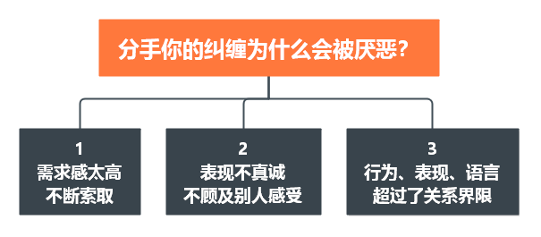 你们不觉得光是听“纠缠”两个字就让人有一种窒息感吗? 什么叫纠缠?词典的解释是烦扰不止,也就是无休止的打搅和骚扰。 被一个人反复打搅和骚扰,甚至是影响到了正常的生活,我相信脾气再好的人也会生气,也会反感和厌恶。 要说被人纠缠是一种什么体验呢? 我举个很常见的例子——你们接到过推销电话吗? 就是那种不管你在做什么,心情怎么样,甚至连你说什么都不听,只顾着推销自己的产品的推销员。 刚开始你可能还会觉得人家也是为了工作,体谅一下对方的辛苦,甚至可能会带着一种愧疚感去敷衍对方。 但是慢慢的,你发现对方根本不在意你需不需要,也不管你在说什么,你一定会感到烦躁:“这个人是听不懂人话吗?” 可对方还是在自顾自地向你推销,这时你不可能还保持温和,一定会将负面情绪宣泄出来,不管是在心里臭骂对方一顿,还是拉黑对方,这都是人在被纠缠的时候正常的反应。 而分手后,纠缠前任的你扮演的就是这个讨人厌的“推销员”,为了达到自己的目的,天天给对方打电话发消息,甚至跑到对方家里和公司去堵他,对方的绝情并没有让你撤退,反而让你感到委屈和不甘。 对,你确实付出了很多,但这只是你自己的角度。换位思考一下,如果被纠缠的这个人是你,我相信你也一定会像前任一样唯恐避之不及。 但如果你熟悉人性、了解心理,就会理解为什么有些人会选择纠缠,而被纠缠的人那么厌恶纠缠了。 人都是利己的生物,换句话说,面对分手这件事,大家其实都是自私的。 纠缠大多是因为心中有怨气和不甘心,这是面对分手的一种应激反应,它和爱不爱没有关系。 而选择纠缠的原因也很简单,就是接受不了身边很重要的人离开了,本能地采取了这样的一种方式来表达自己的不满,来描述自己的委屈: ·为什么他要离开我?我是哪里做错了吗? ·他凭什么抛弃我,我对他不好吗? ·我好痛苦,我不想分手! ·为什么要那么绝情? 大部分纠缠的人都知道自己的行为会引起对方的反感,可是为什么还要这么做呢?其实总结起来也就下面四种原因。 缓解内心的痛苦 纠缠其实是一种消化悲伤和痛苦的有效方式。 美国心理学家库伯勒·罗丝(Kubler Ross)在她出版的《论死亡和临终(On Death and Dying)》中提到,绝症患者在对待悲伤时会经历五个阶段:否认、愤怒、谈判、绝望、接受,而一次被失恋带来的痛苦并不亚于病痛带来的心理折磨。 这个时候,为了缓解内心的痛苦,你同样会经历这些阶段: 否认:不承认分手的事实,依旧联系对方。 愤怒:对自己被分手的这个结局感到不甘心“你凭什么和我分手?” 谈判:乞求对方,希望他能够回头“求求你回来好不好,只要你回来我什么都愿意” 绝望:反正对方都这么绝情了,自己再做什么也没有什么意义了。 接受:接受分手的事实。 每个阶段消耗的时间都不一样,有些人可能会在“否认—愤怒—谈判”这三个阶段里陷入死循环,最直观的反应就是:越走不出来,你就越会纠缠对方,严重的甚至会要挟逼迫对方。 纠缠是一种退行(Regression) 退行是由弗洛伊德提出的一种心理防御机制。 指的是我们在遇到难以克服的苦难和痛苦时,会选择退回到孩童时期,放弃成人的思维方式和为人处世的原则,借此来逃避现实,摆脱内心的焦虑和恐惧。 就像一个孩子一样,在面对得不到的东西时,首先会死缠烂打乞求,然后才会一哭二闹,最后就会无能狂怒去攻击别人。 当我们在感情中被拒绝时我们也退行成了一个孩子,为了让对方妥协就会采取这种最简单粗暴的模式,这也是为什么那么多人觉得分手后死缠烂打的人很不理智的原因,因为他们退行成了一个孩子。 赌徒思维 俗话说:搏一搏,单车变摩托。 其实纠缠就是为了用最小的力气去获得最大的利益,你的每一次联系都在赌: 赌自己再坚持一下对方就松口了; 赌自己的“真诚”打动了对方,对方愿意接受自己了; 赌他对自己还有一点旧情; 赌他没有那么绝情…… 就算没有赌对,对方绝情的态度至少还能让自己死心,哪怕是给自己一点时间适应也好 。 惰性使然 不管你承不承认,人都是存在惰性的。 惰性决定了我们是趋利避害的,发现问题和做出改变的过程必然是痛苦的,如果使用简单的方法就能达到想要的效果,为什么还要用最麻烦的方法呢? 而纠缠就是一种发泄自身情绪和挽回最简单的方式。 不需要消耗精力去研究分手的具体原因,也不需要花费时间去探索对方的真正需求,更不用为了复合做出任何改变,只需要不断地给对方打电话,不断地发消息,不断地道歉,如果对方心软复合,那就是大赚特赚,如果对方不同意,也不会损失什么。 前任会反感我们的纠缠,主要原因有三个: 1、你的需求感太高,依旧在向对方索取情绪价值 2、所有的纠缠都只浮于表面,没有弄清楚对方的真实需求 3、你的行为已经超过了分手后的关系界限 下面具体解析这三点原因。 当一个人单方面提出分手之后,只要没有闹得很僵,他们都会有一种当“坏人”的愧疚感,所以一般来说,你们只会从恋人退回到朋友的位置,而不是变成陌生人。 在这个阶段,前任会很快规划出关系界限: ·我现在是单身了,恢复了自由 ·既然是朋友,那就没有必要经常联系了 ·应该和前任保持距离,不能再像恋爱时那样关系亲密,无话不说 而纠缠的一方显然没有从恋人的角色中走出来,仍然再用恋人的身份去捆绑对方,渴望知道对方的一切,并渴望对方像以
